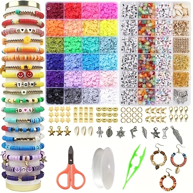 This bracelet making kit includes 6800 flat round polymer clay beads in 24 colors, along with 900 letters and pendant charms. Perfect for creating unique and personalized jewelry pieces.