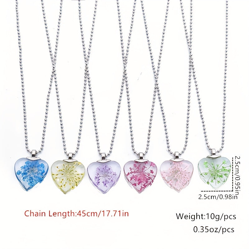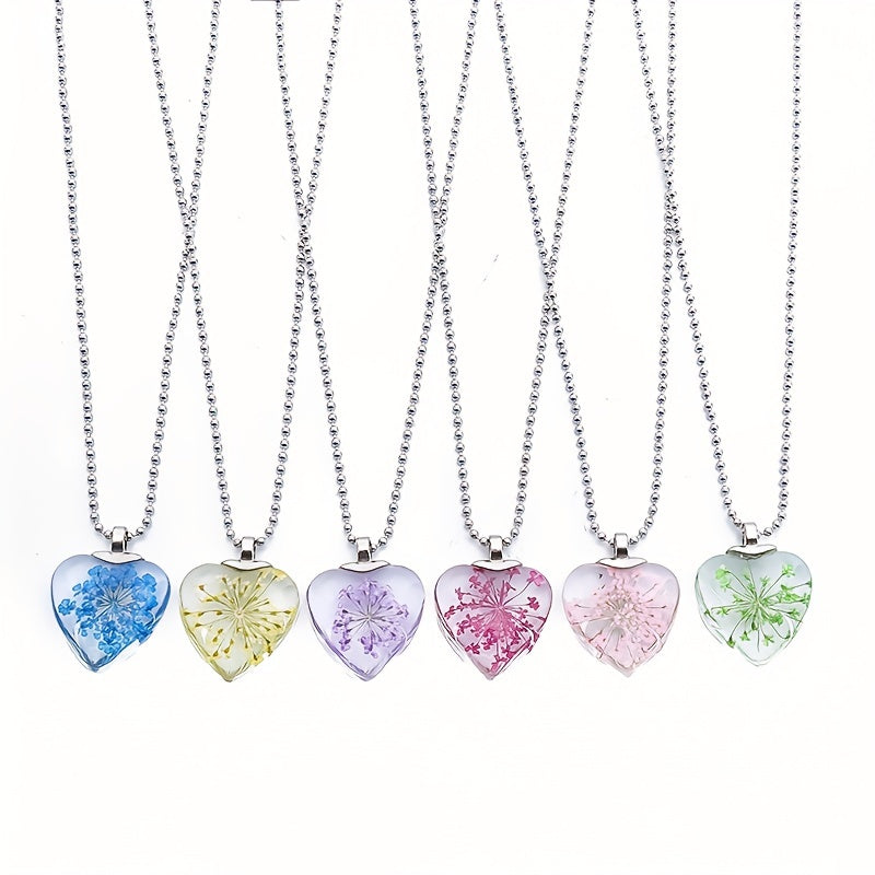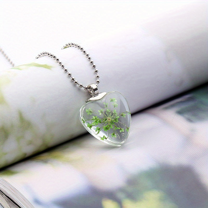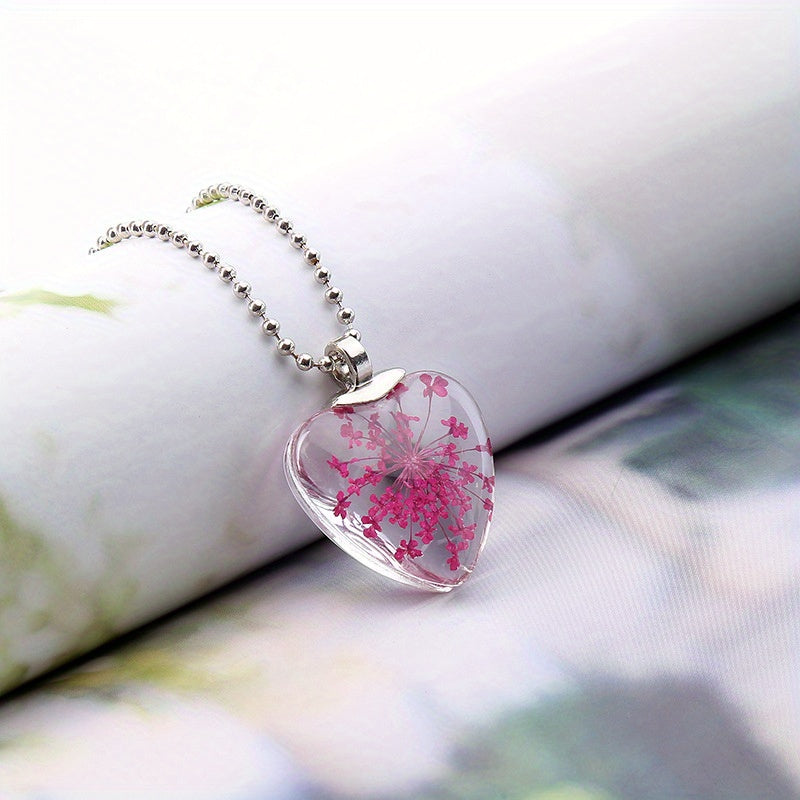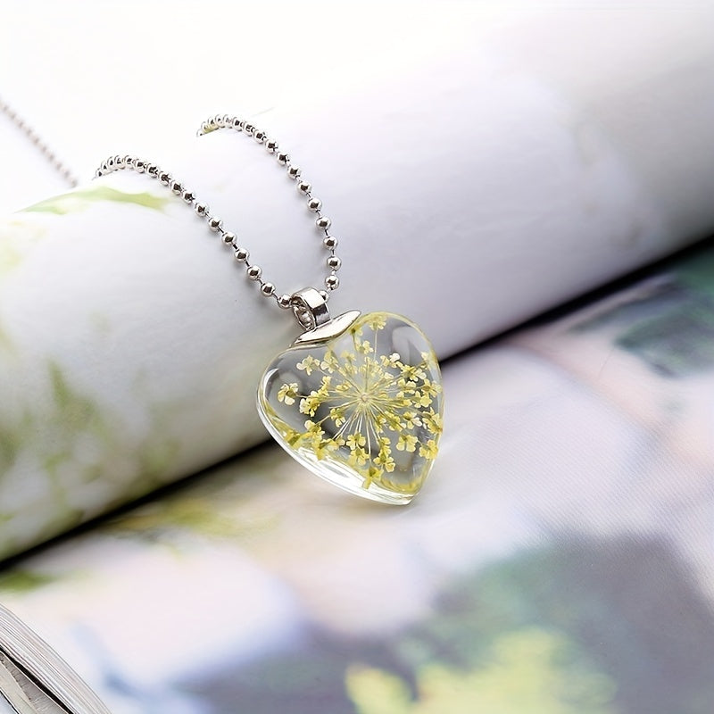 Elegant heart pendant necklace with real dried flowers, perfect for spring and summer seasons.