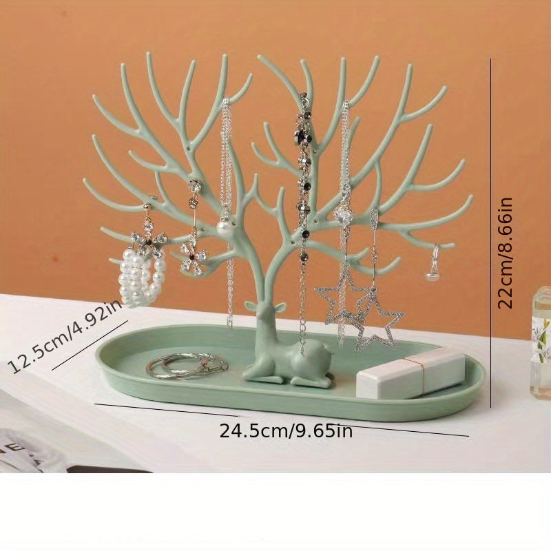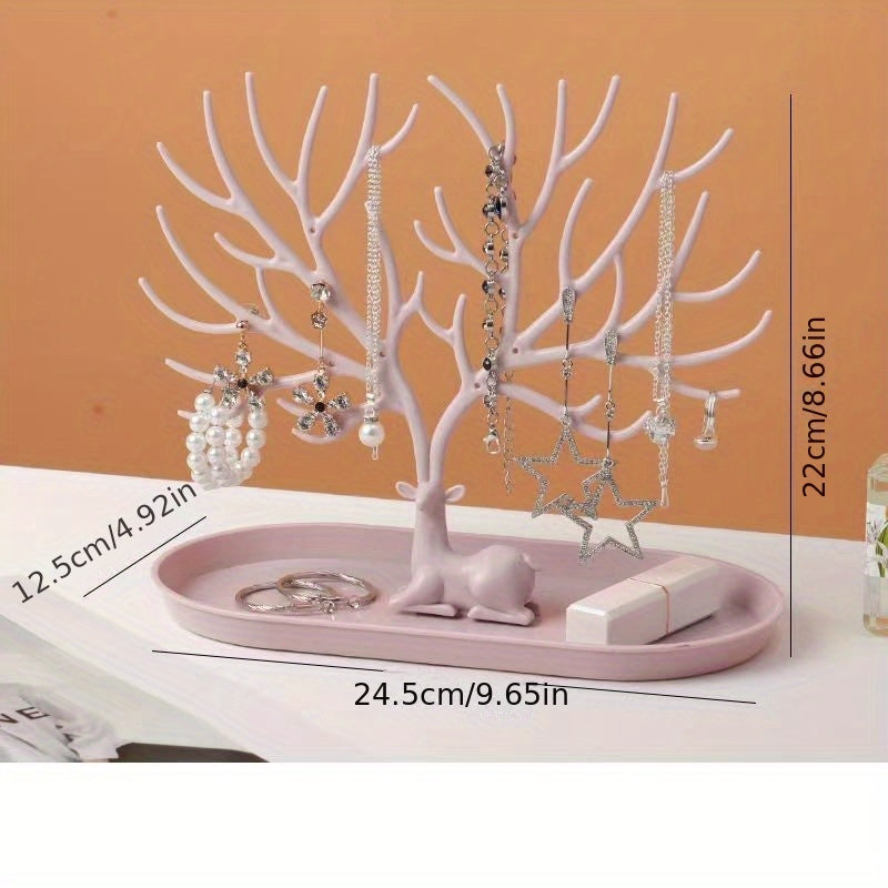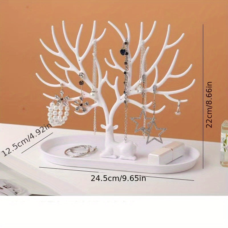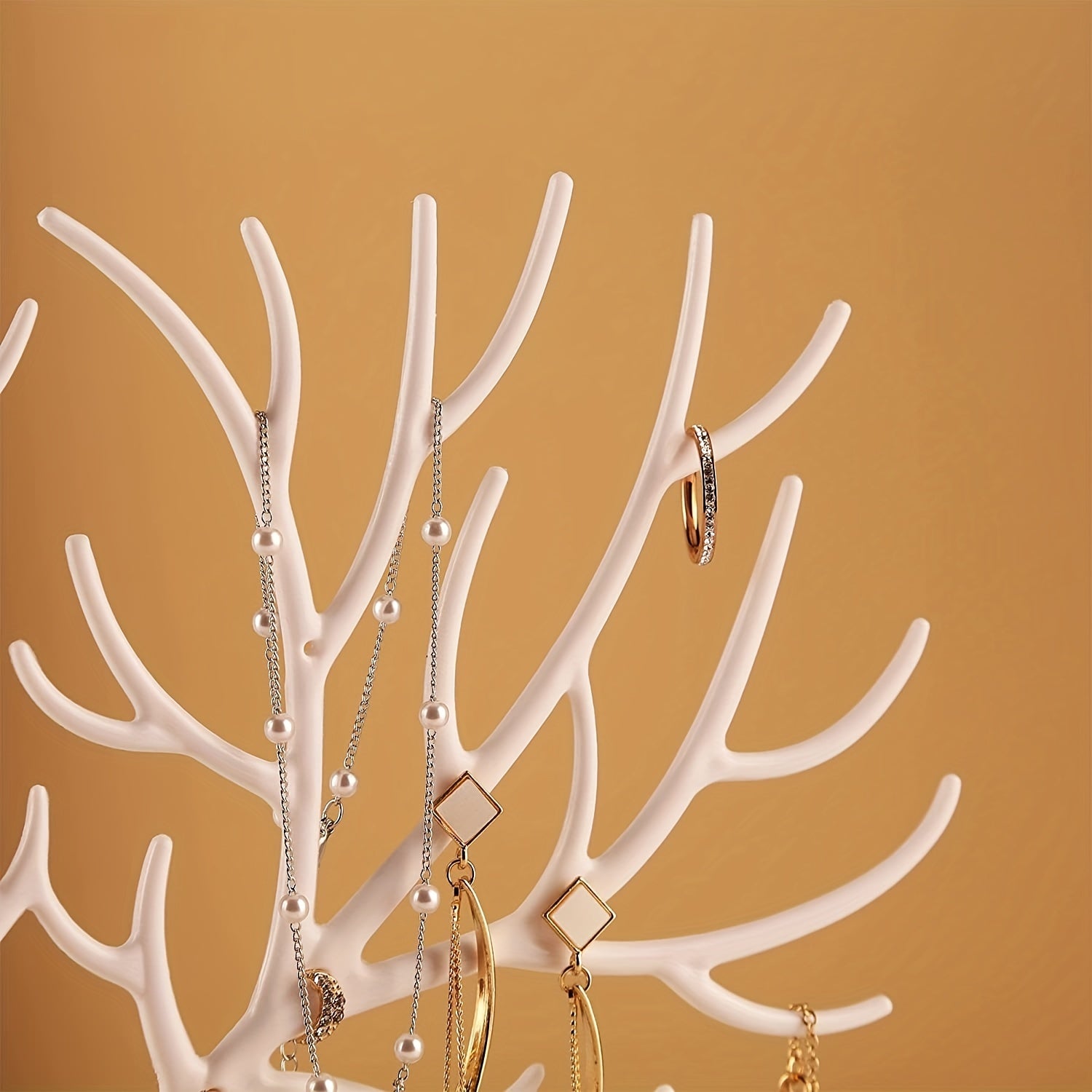 This Retro Deer Branch Jewelry Display Rack is a stylish and practical way to showcase your jewelry collection. It features branches for hanging necklaces, bracelets, rings, and earrings, keeping them organized and easy to access.
