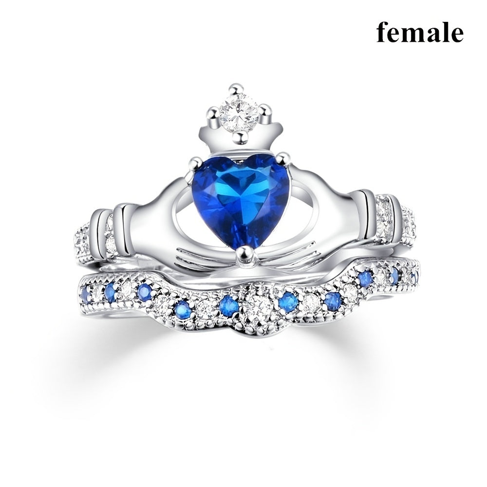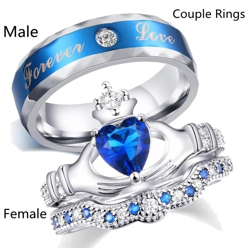 This romantic couple ring features a heart-shaped crown design with zircon stones, perfect for parties, engagements, and weddings. Add a touch of elegance to your outfit with this beautiful jewelry piece.