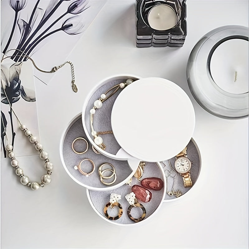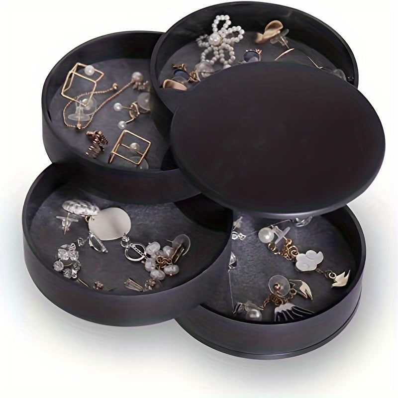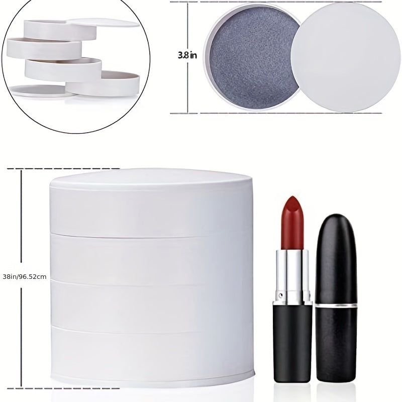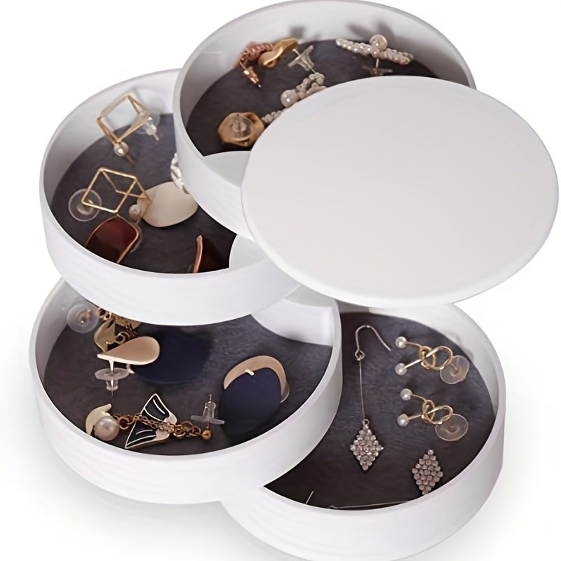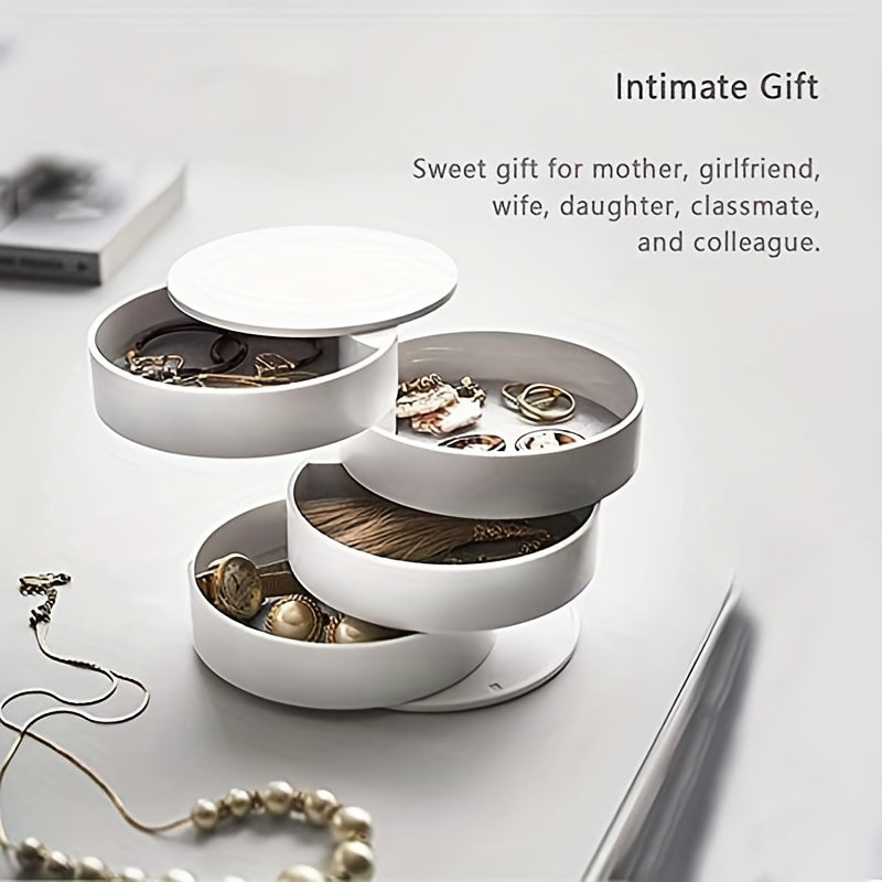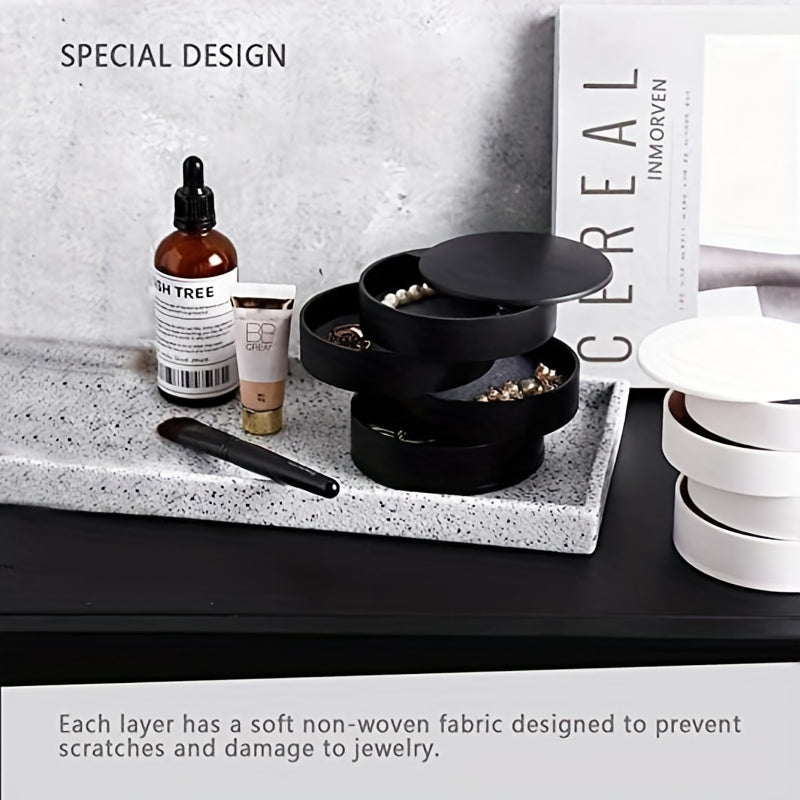 Keep your jewelry organized in this classic layer rotating round box. Perfect for storing earrings, necklaces, bracelets, rings, and more.