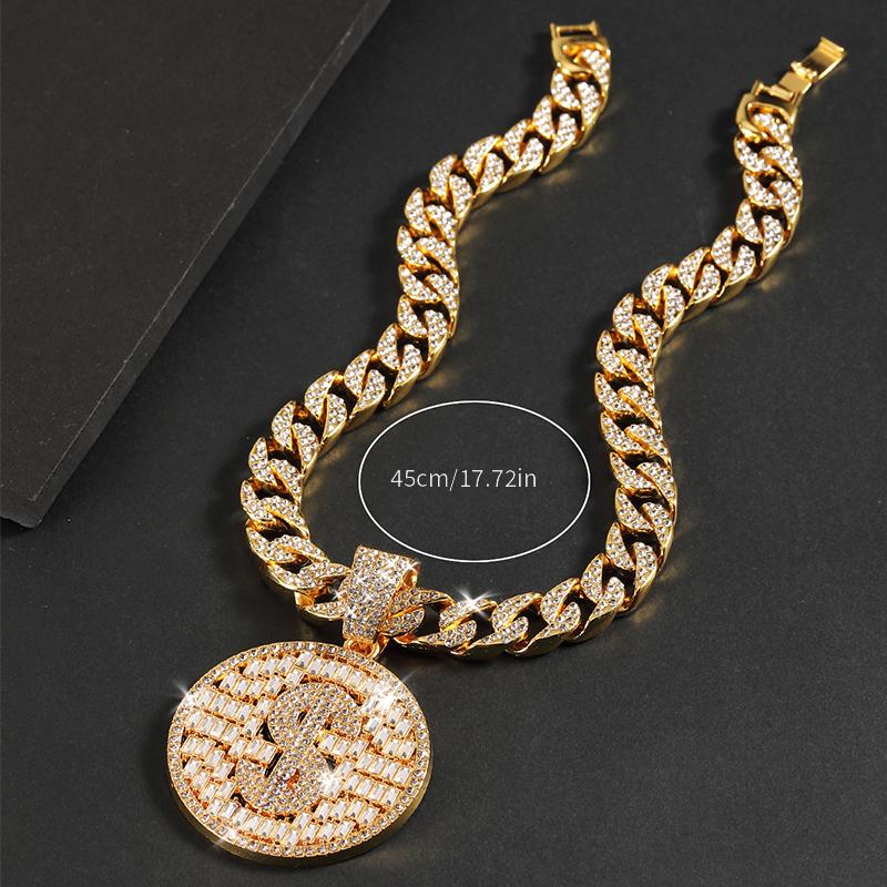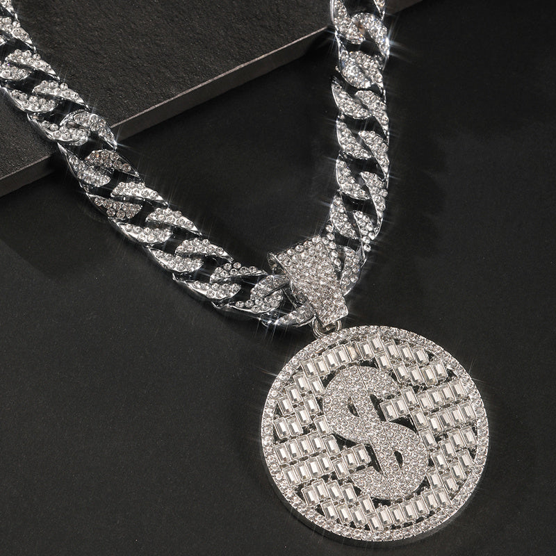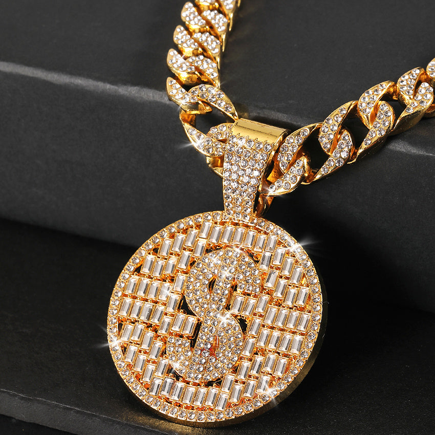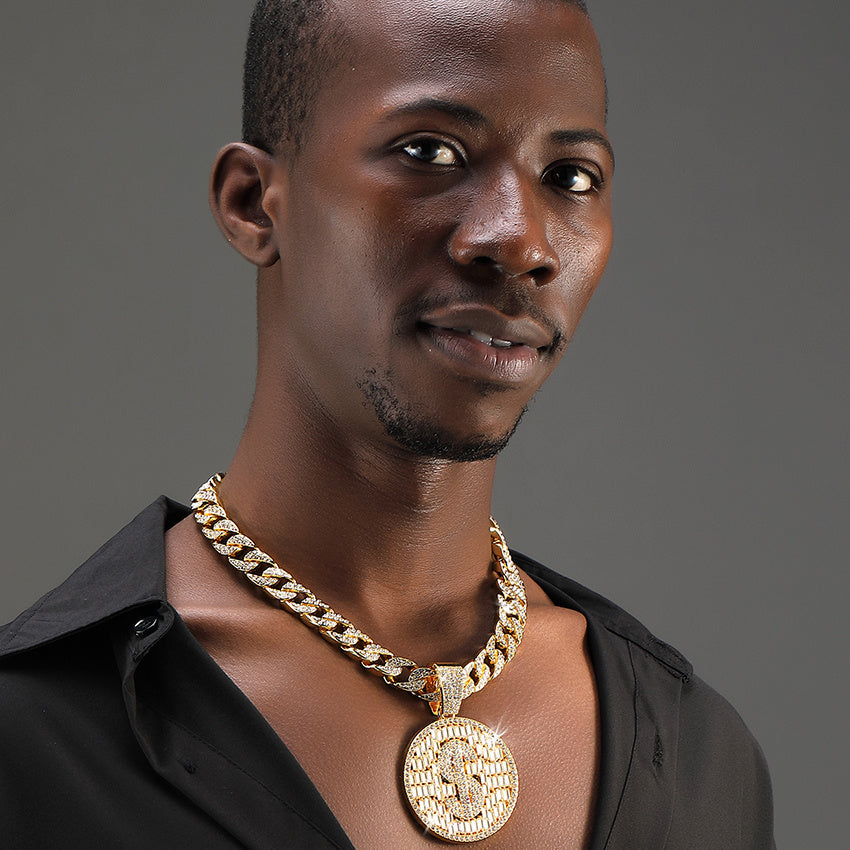 This stylish necklace features a round dollar pendant on a classic cuban chain. Perfect for adding a touch of elegance to your look.