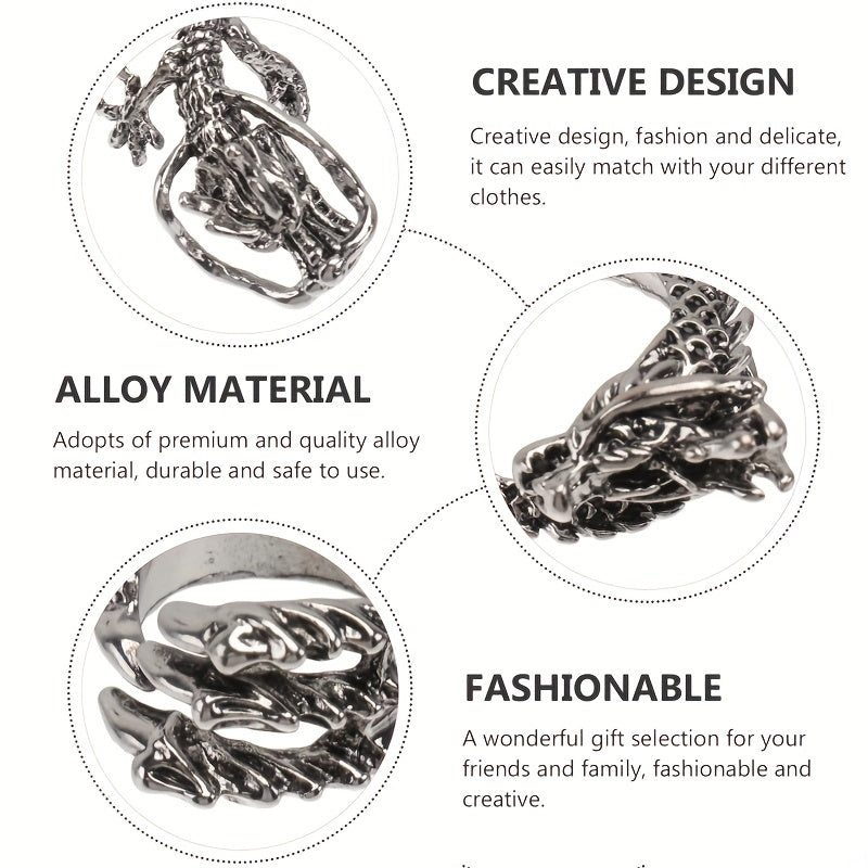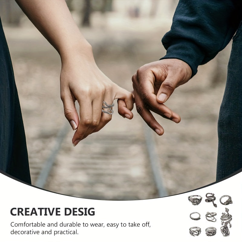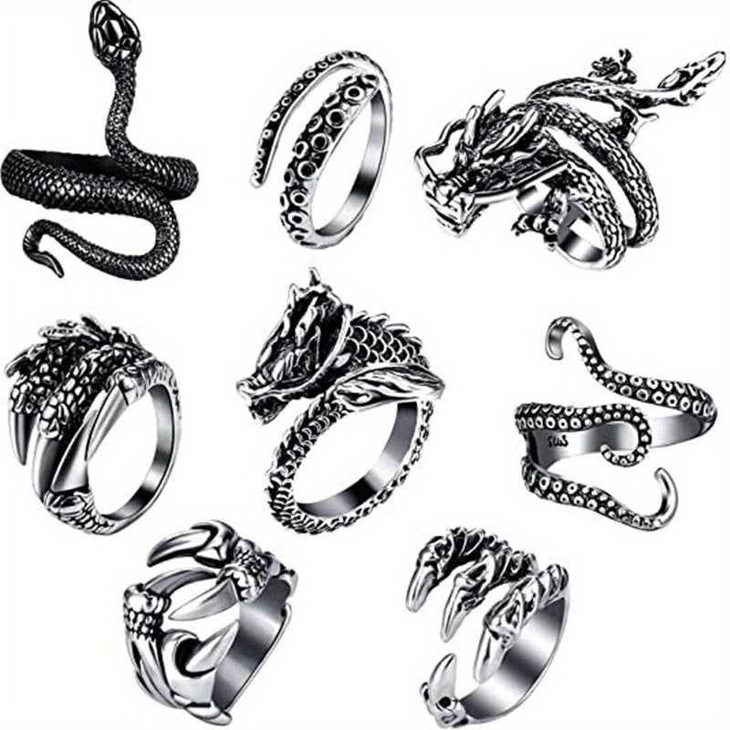 Add a touch of vintage style to your look with this set of 8 animal-themed rings. Each ring features a unique design inspired by dragons and snakes, and is adjustable to fit any finger size.