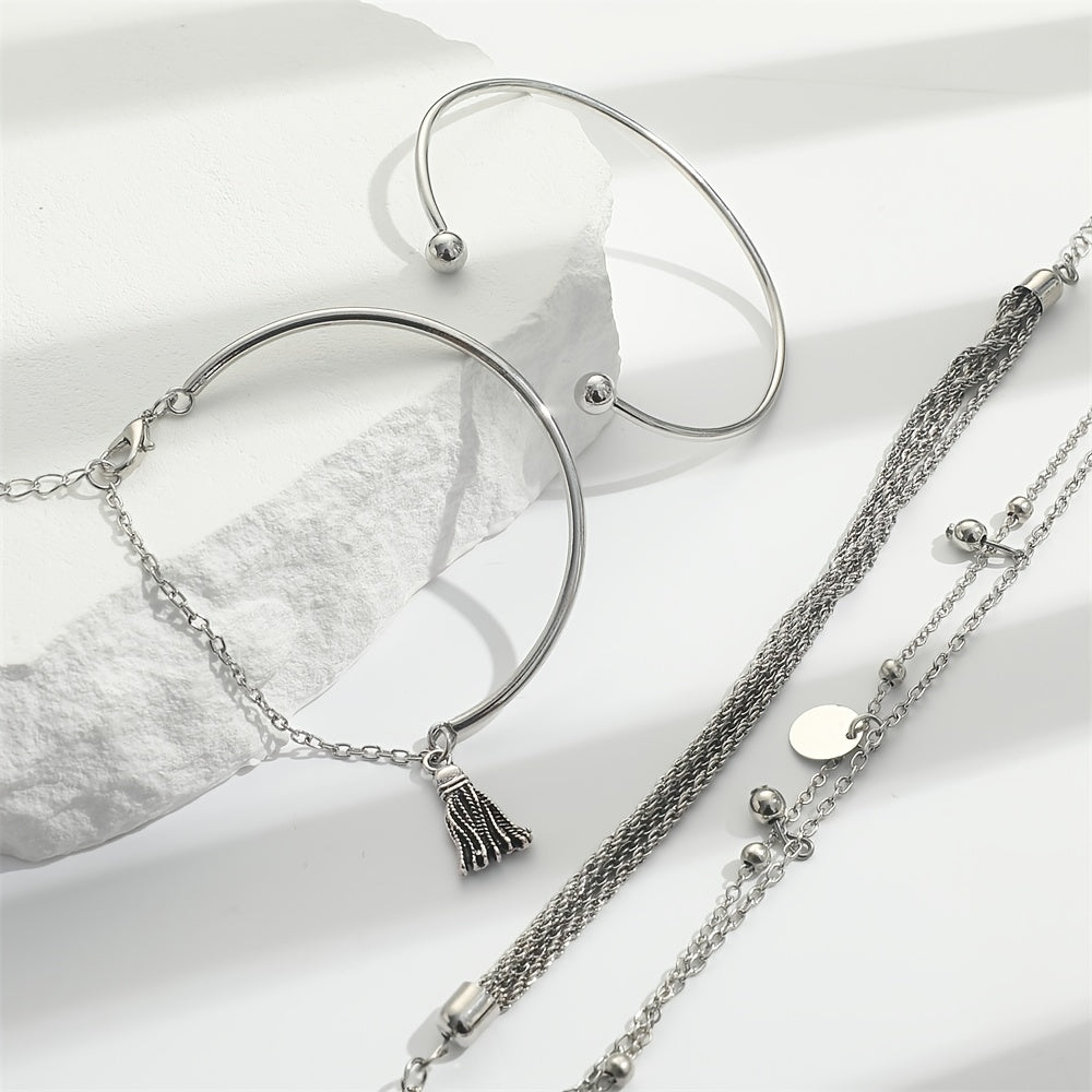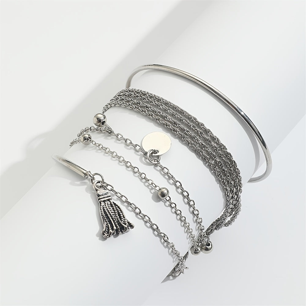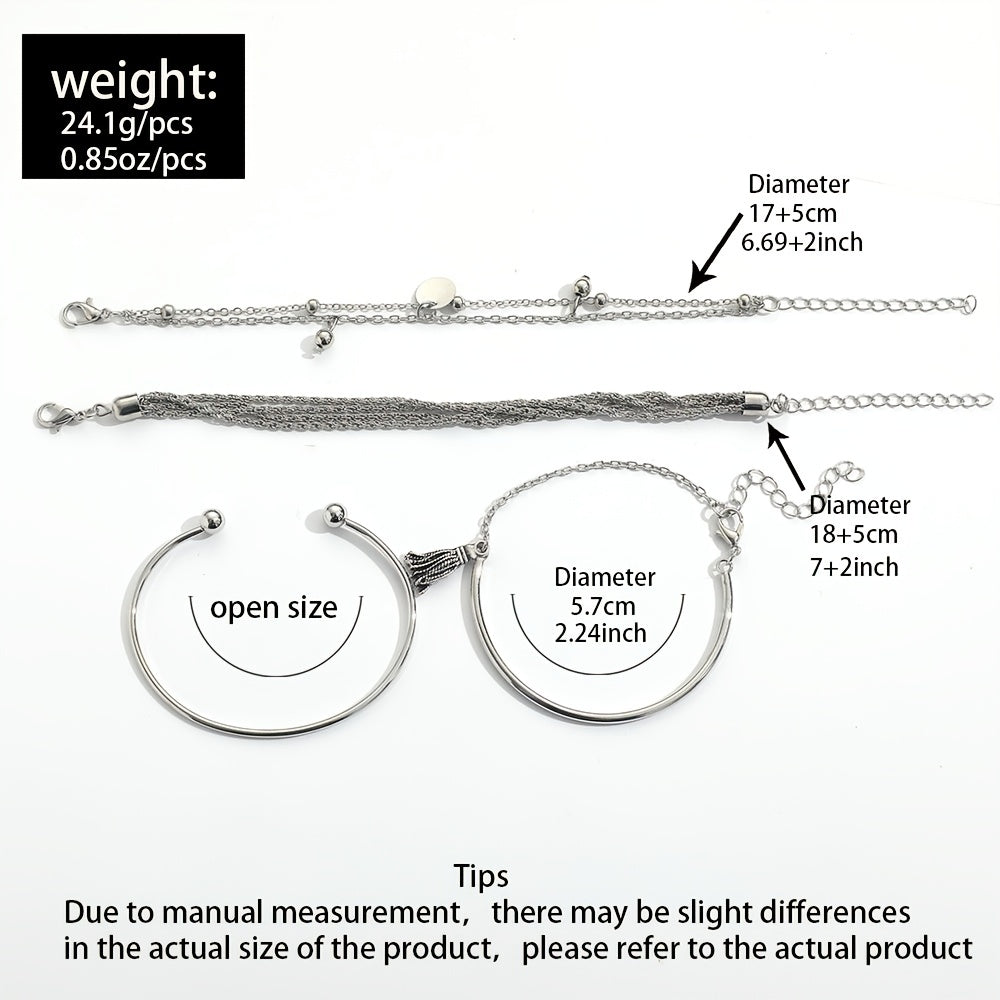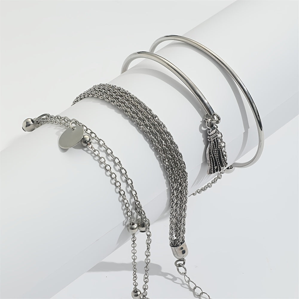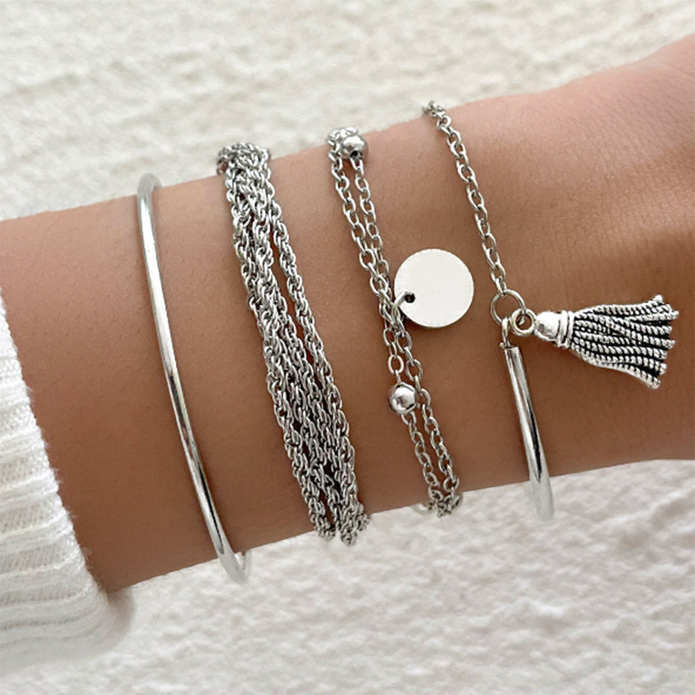 • Set of 4 includes silver glossy tassel bracelet, layer chain bracelet, and disc bracelet