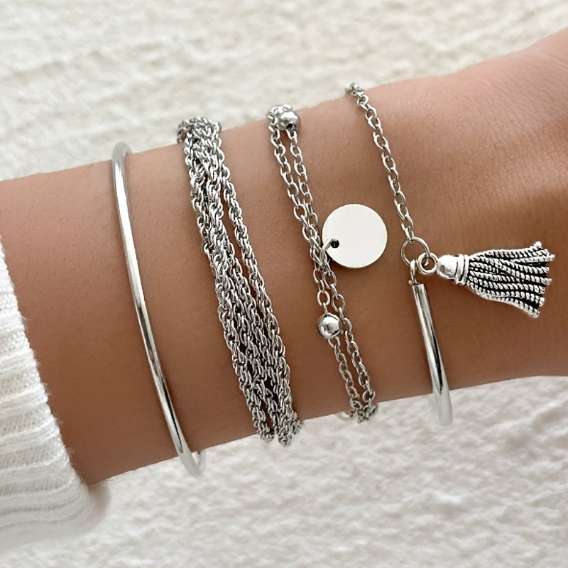 Elevate your wrist game with this stunning set of 4 bracelets. These silver glossy tassel bracelets, layer chain bracelet, and disc bracelet are perfect for adding a touch of glamour to your outfit.