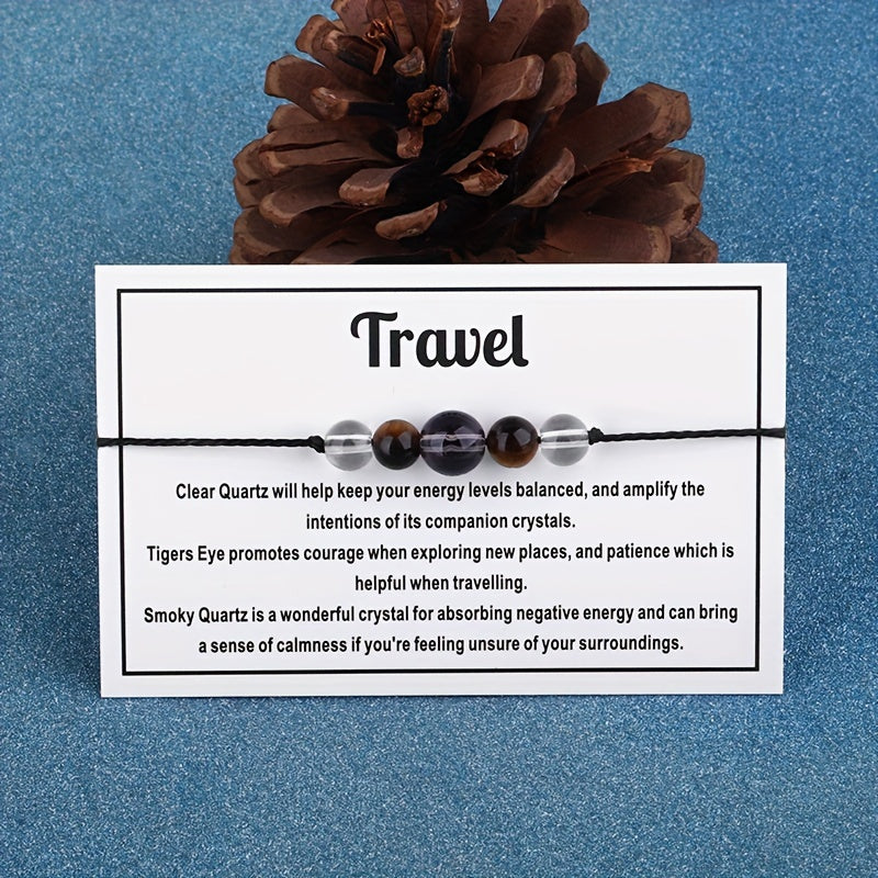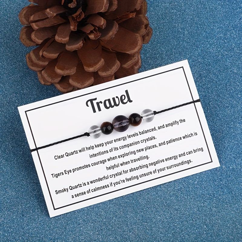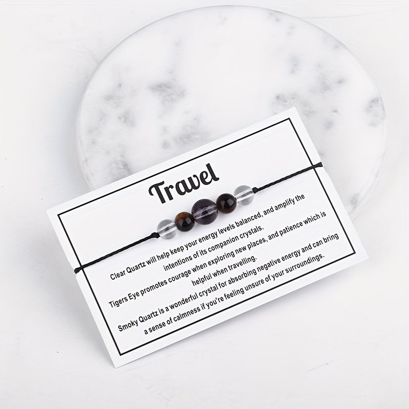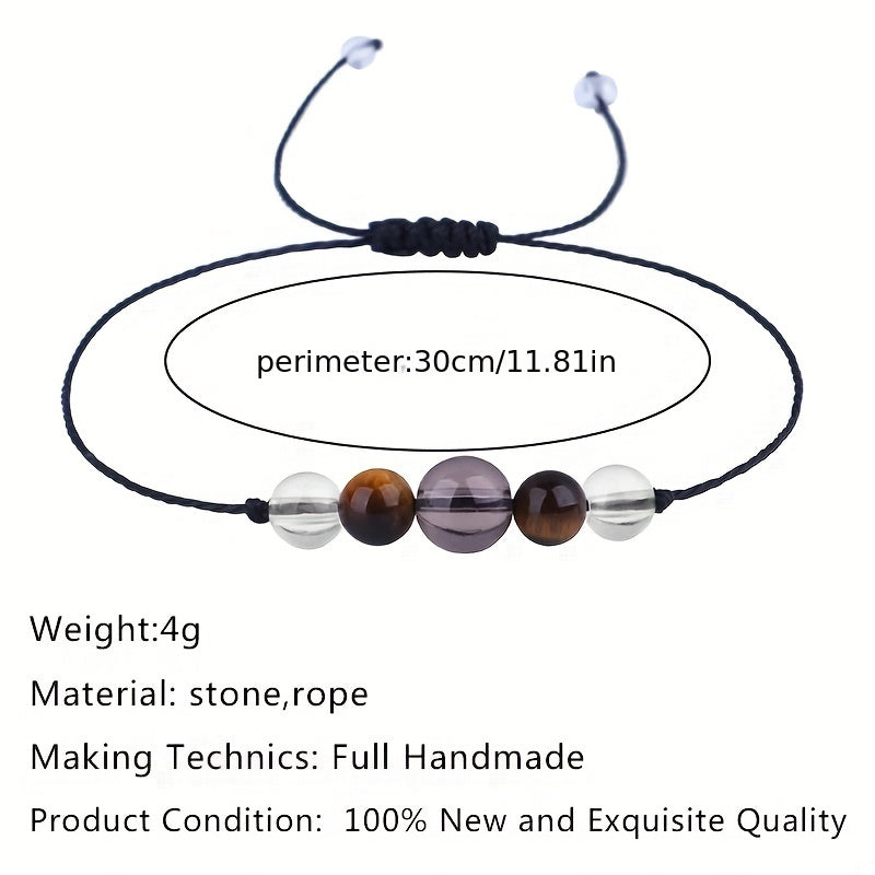Hand-woven bracelet with natural Smoky Quartz and Tiger Eye beads on wax string. Perfect travel accessory for unisex charm.