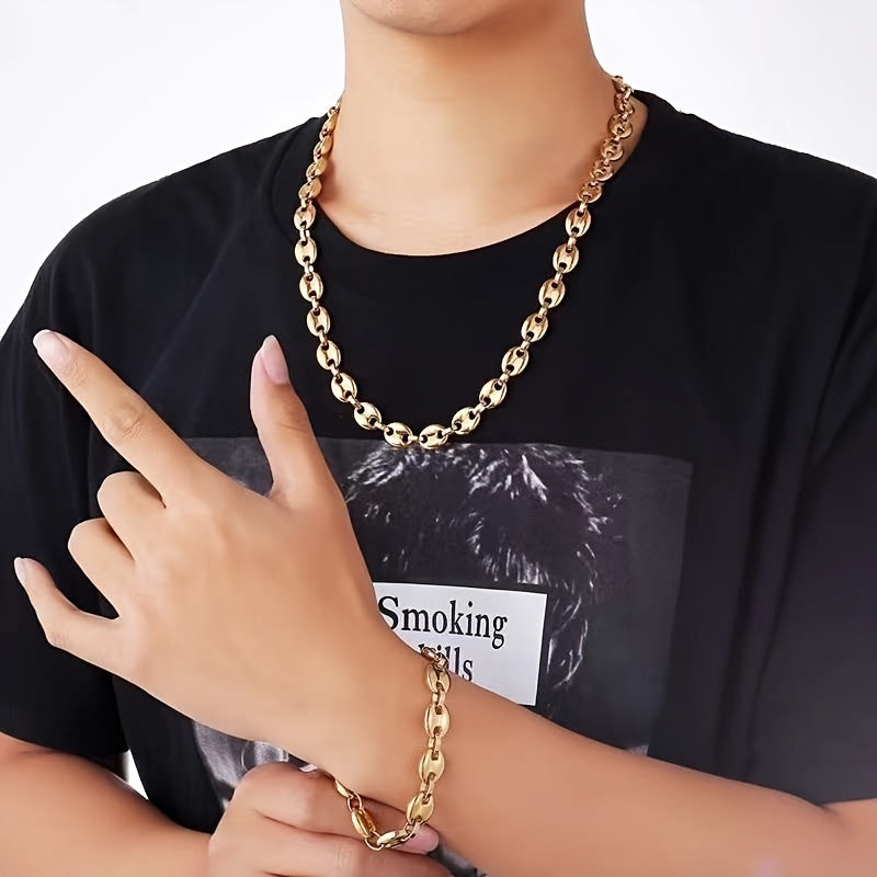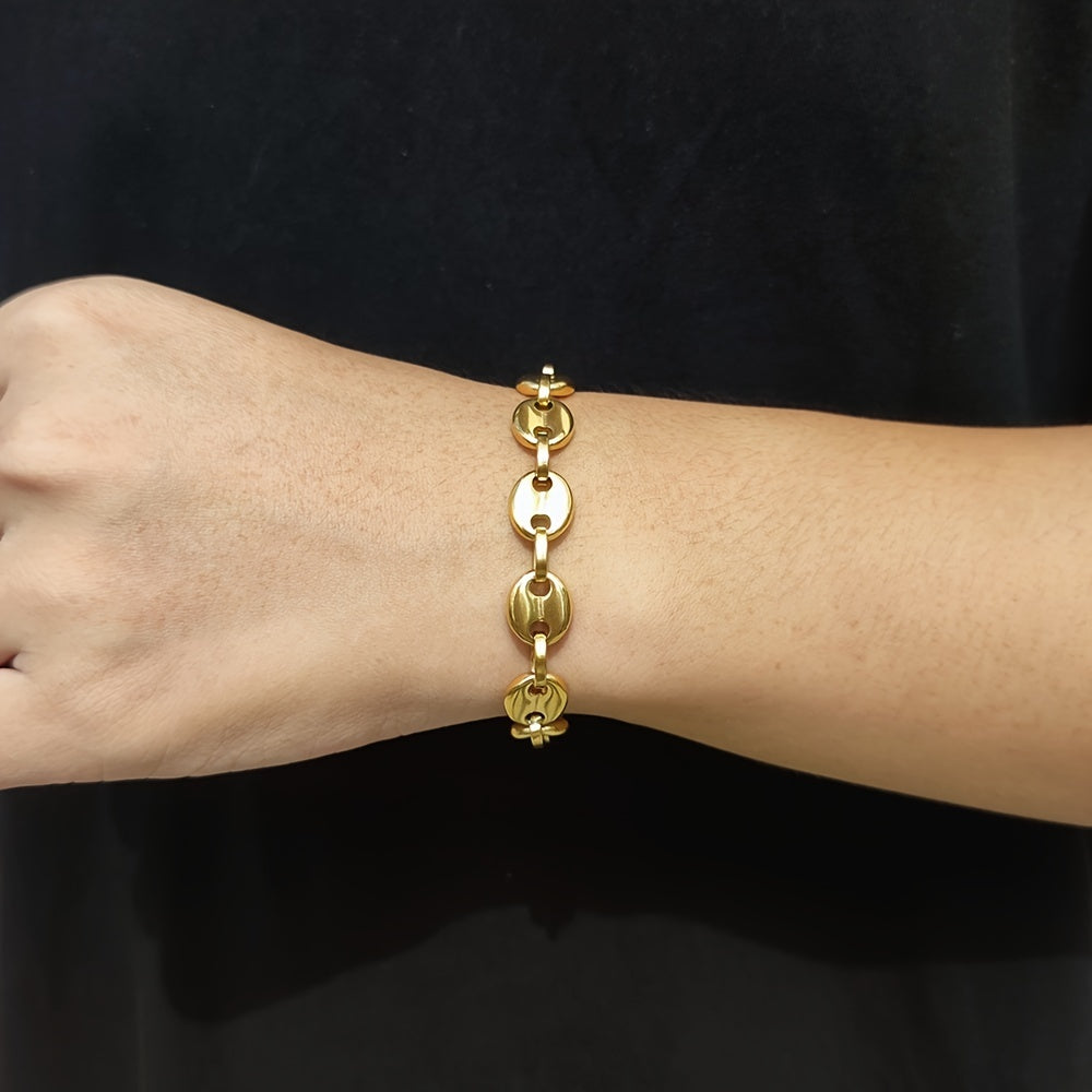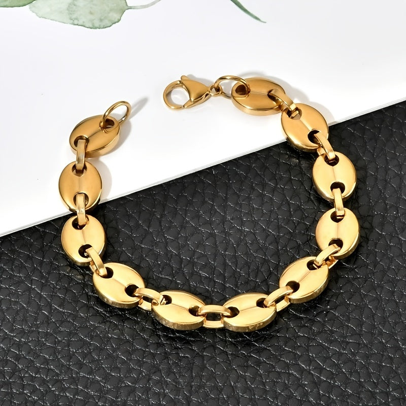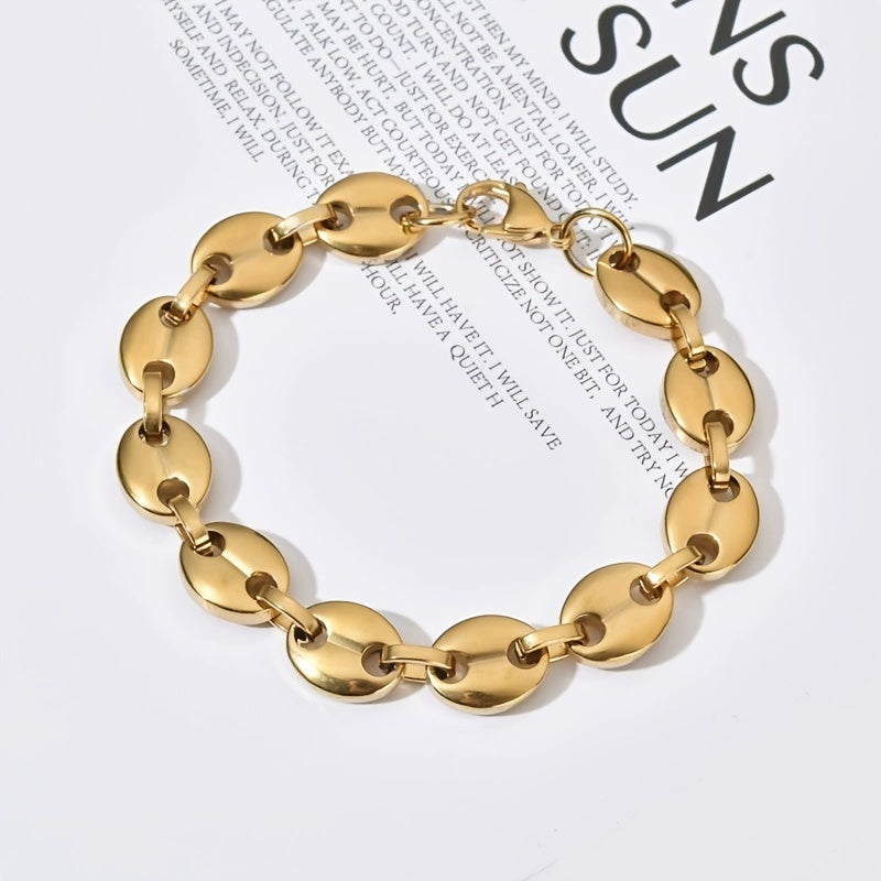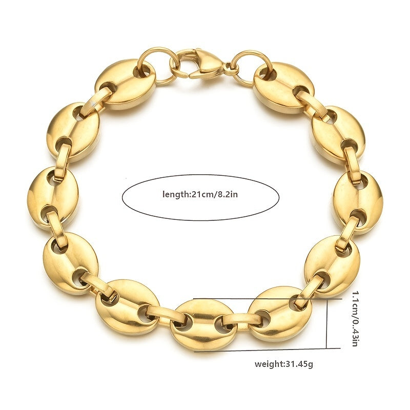 This bracelet features a stylish design with coffee beans link chain and 18K golden finish. Made of stainless steel, it's a fashionable accessory for men.