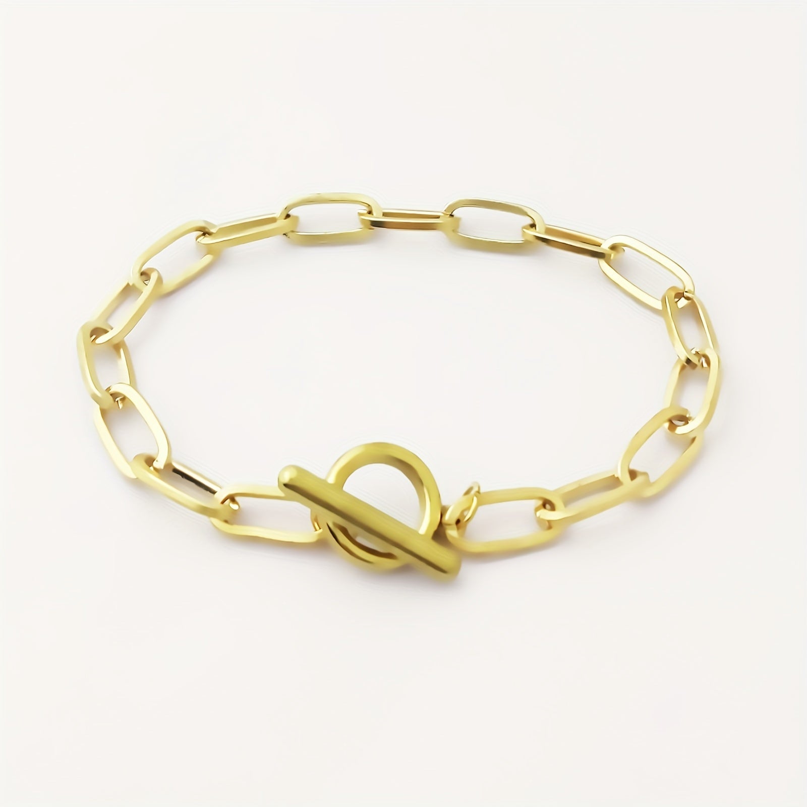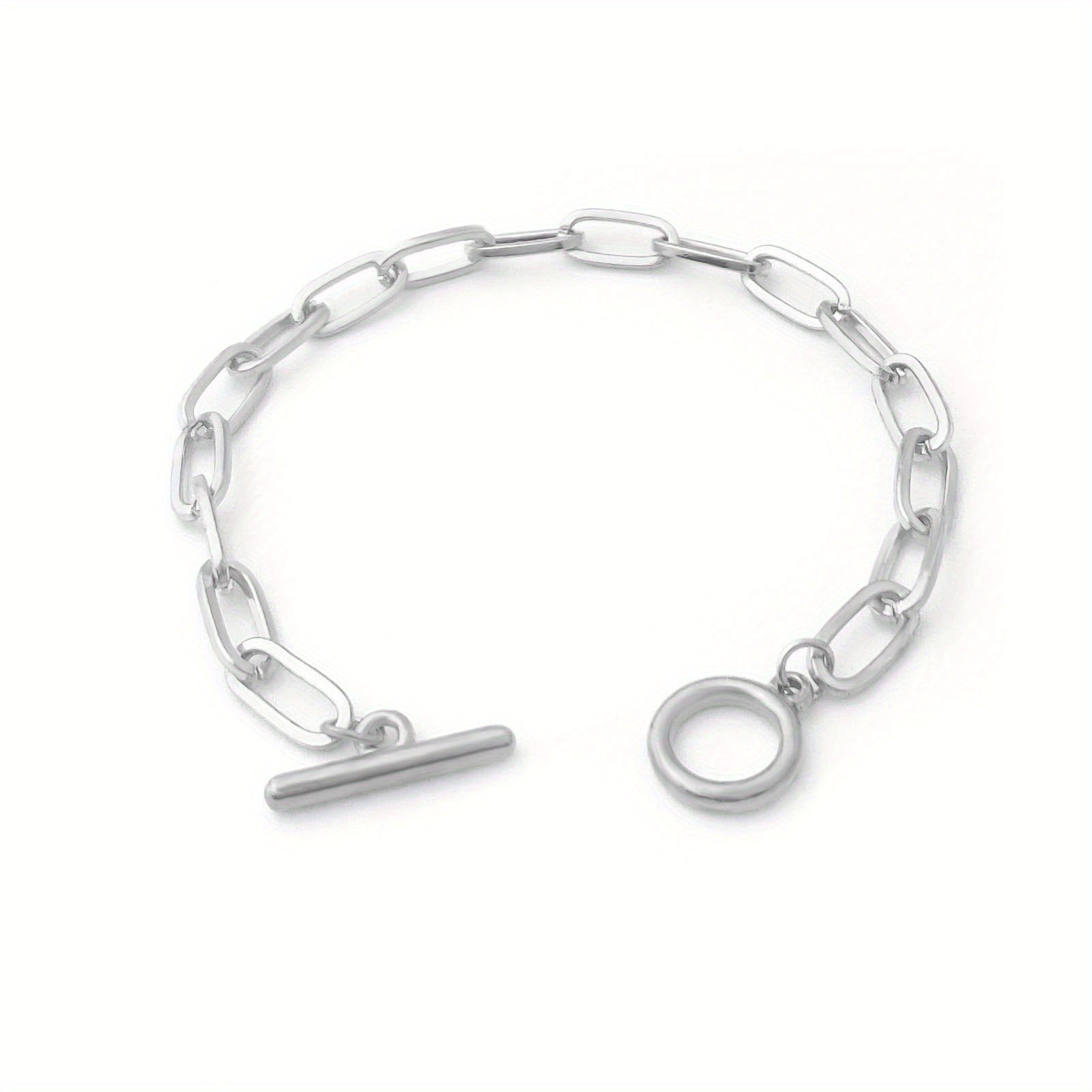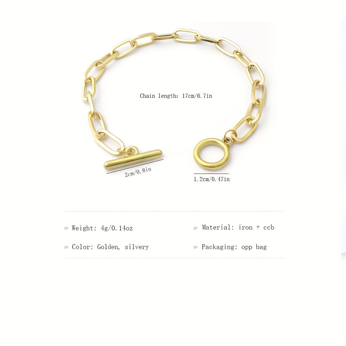This stylish bracelet features an OT buckle design with a DIY paper clip chain, making it a unique hand jewelry piece. Available in golden and silver colors.