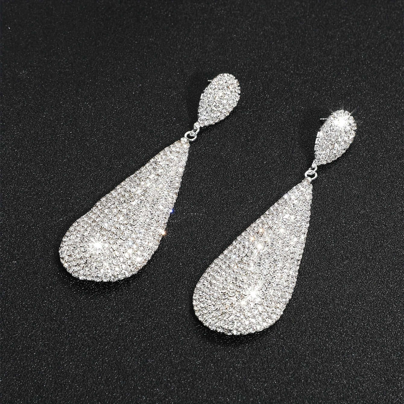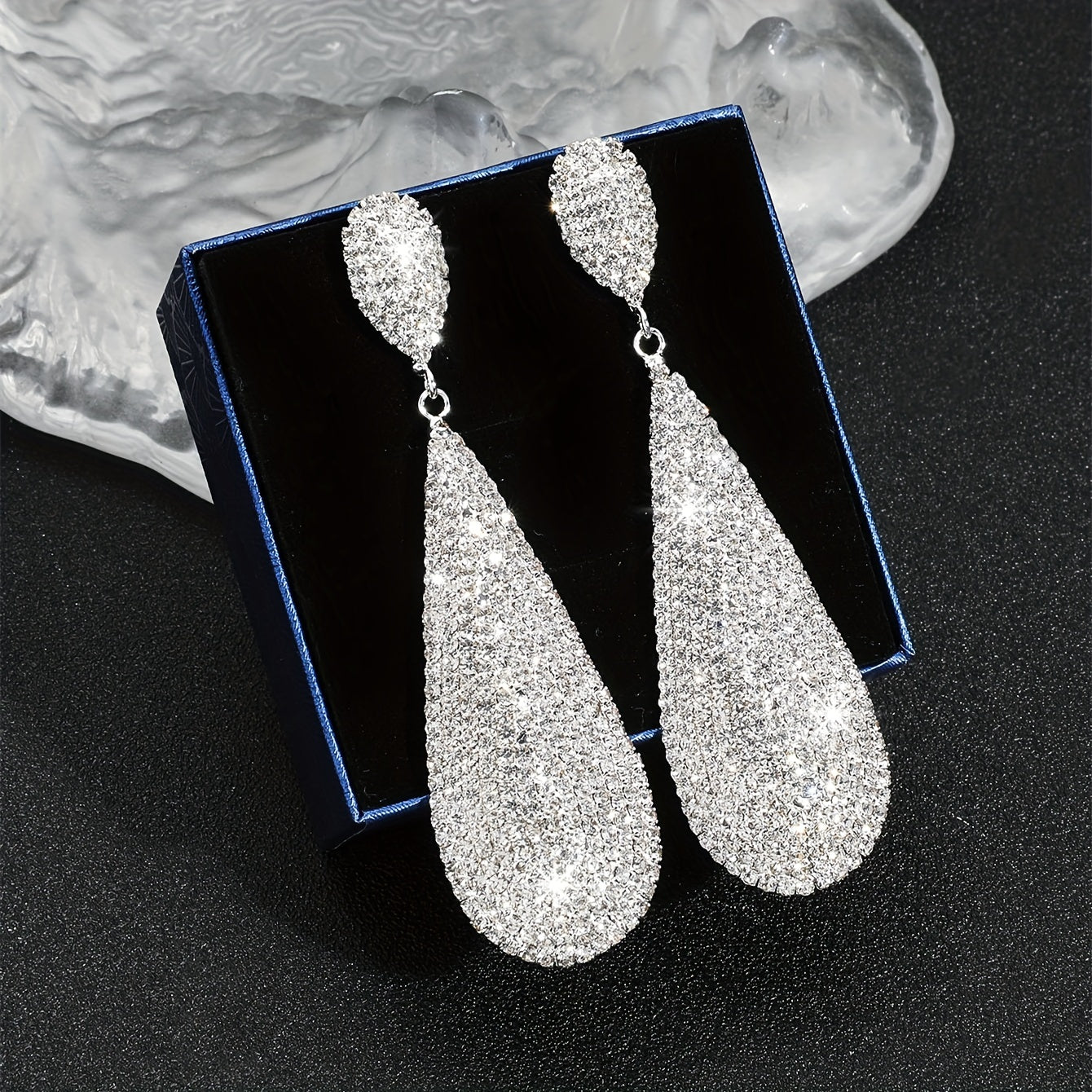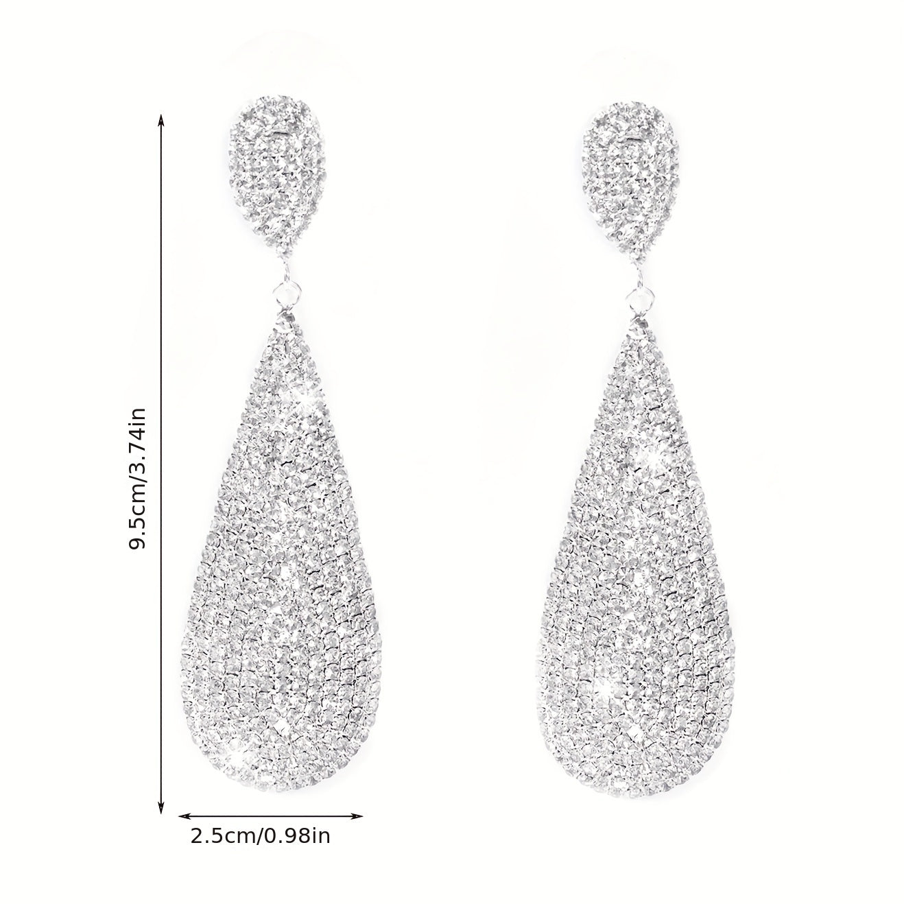 Elegant teardrop shape earrings with full sparkling rhinestones. Perfect for weddings, banquets, and special occasions.