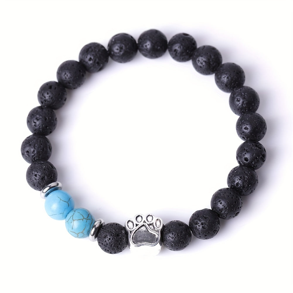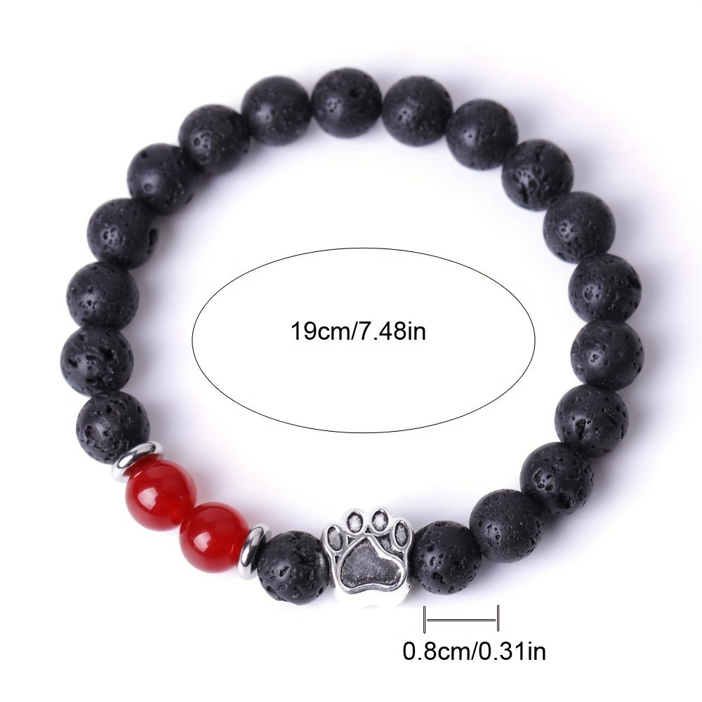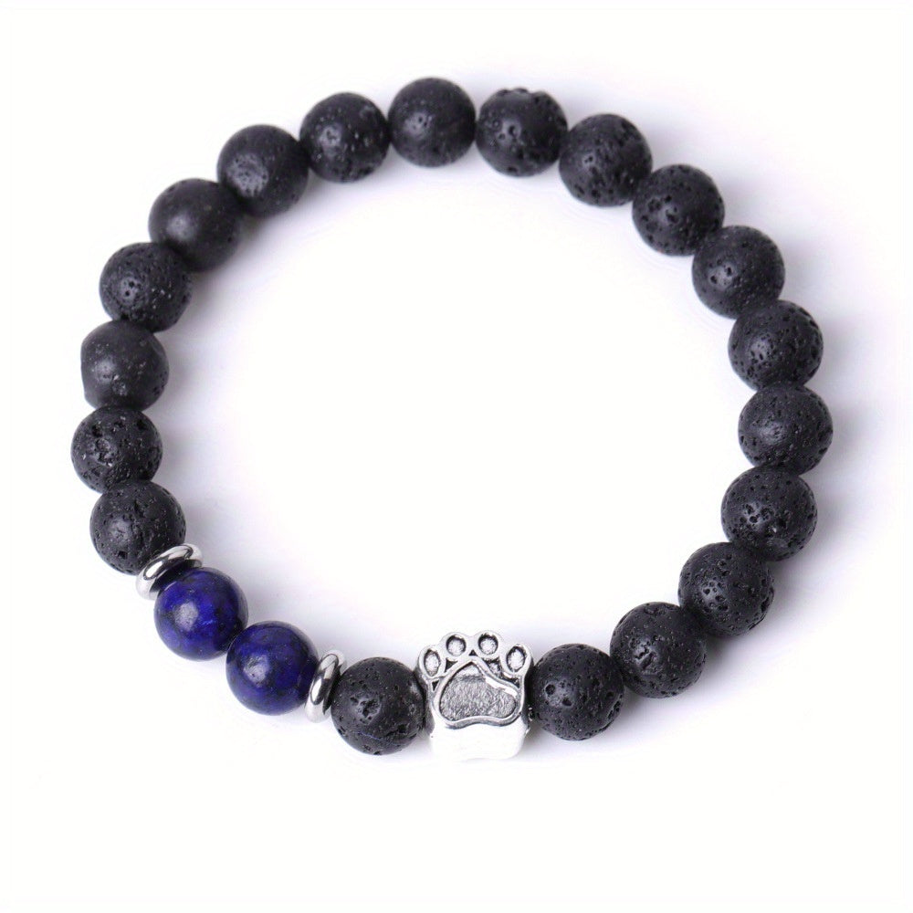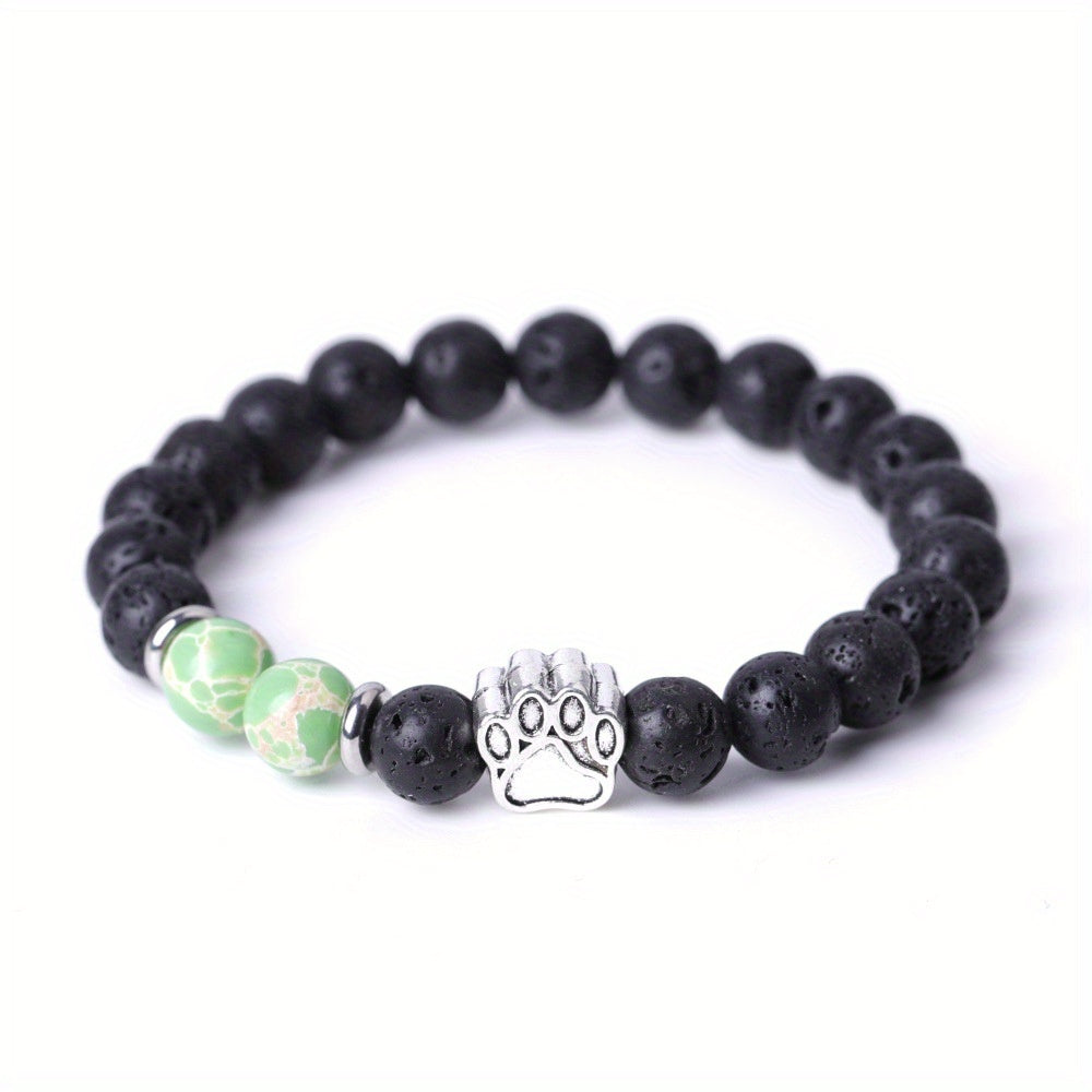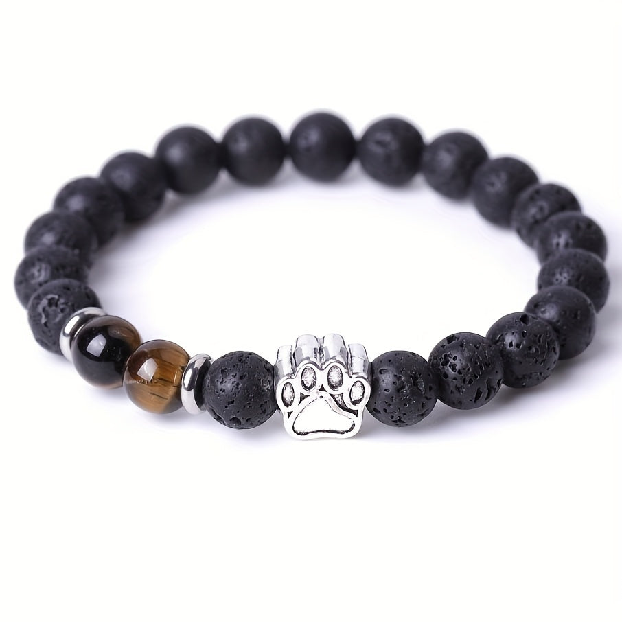 This bracelet features volcanic stone beads with an elastic band, styled with a dog paw charm. It's a stylish accessory for men.