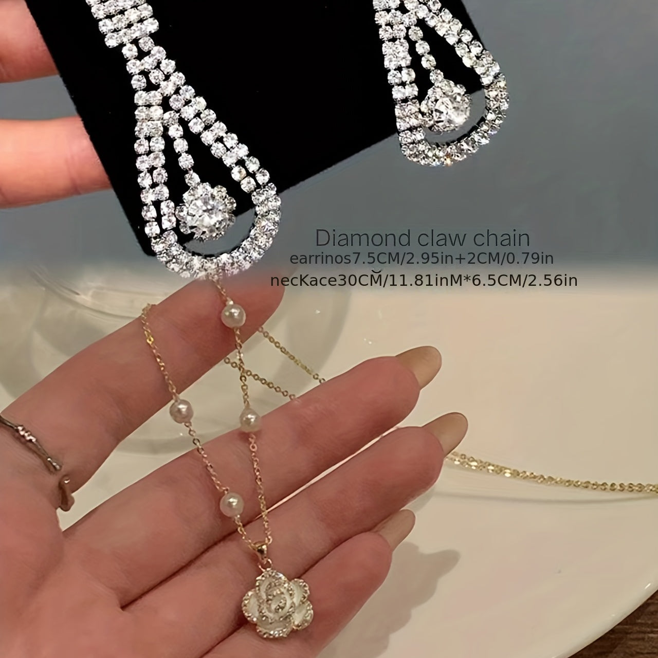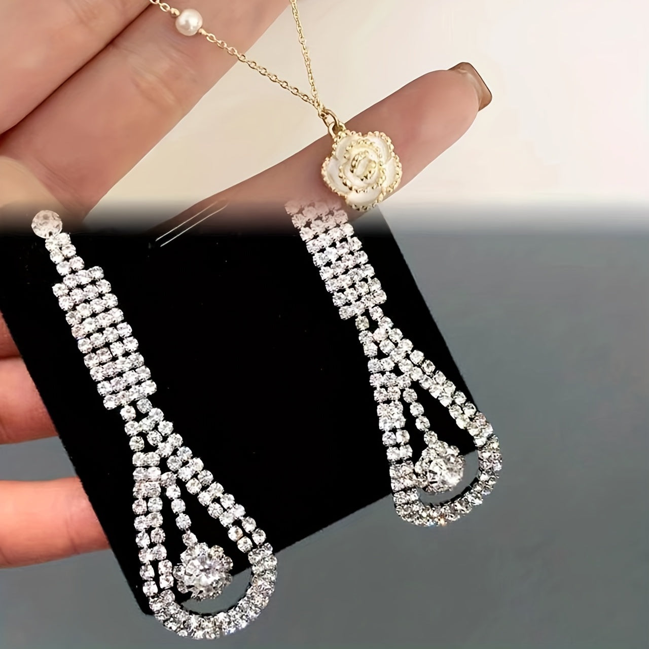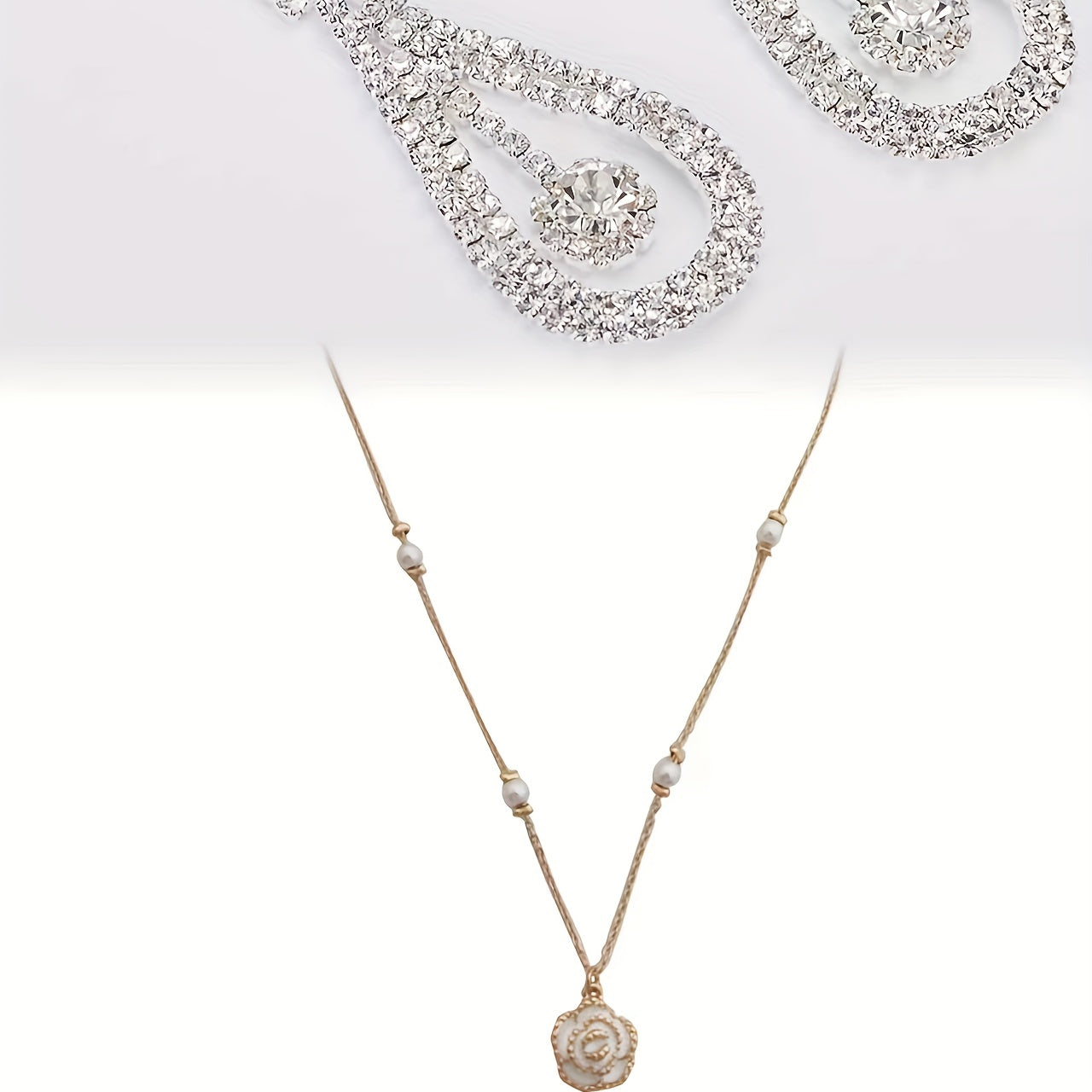 Enhance your party look with this dazzling 2pcs jewelry set featuring water drop cubic zirconia earrings and a camellia pendant necklace. Ideal gift for women and girls.