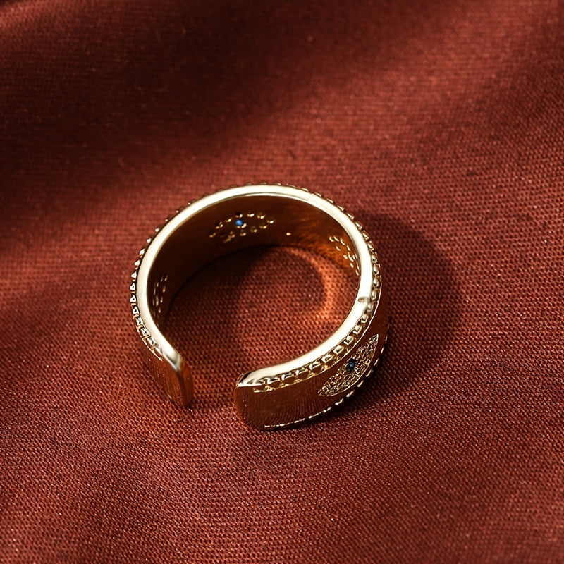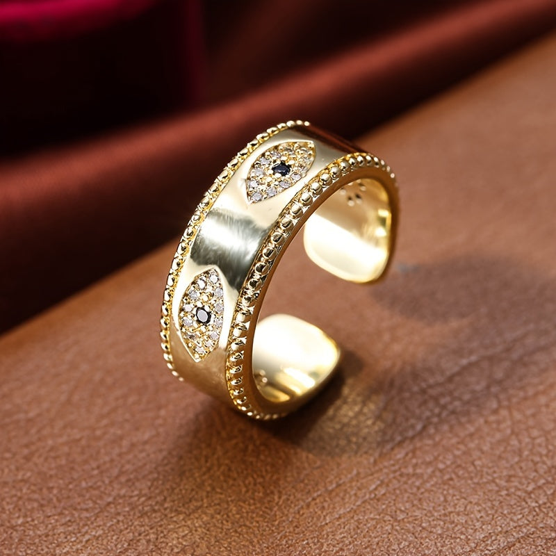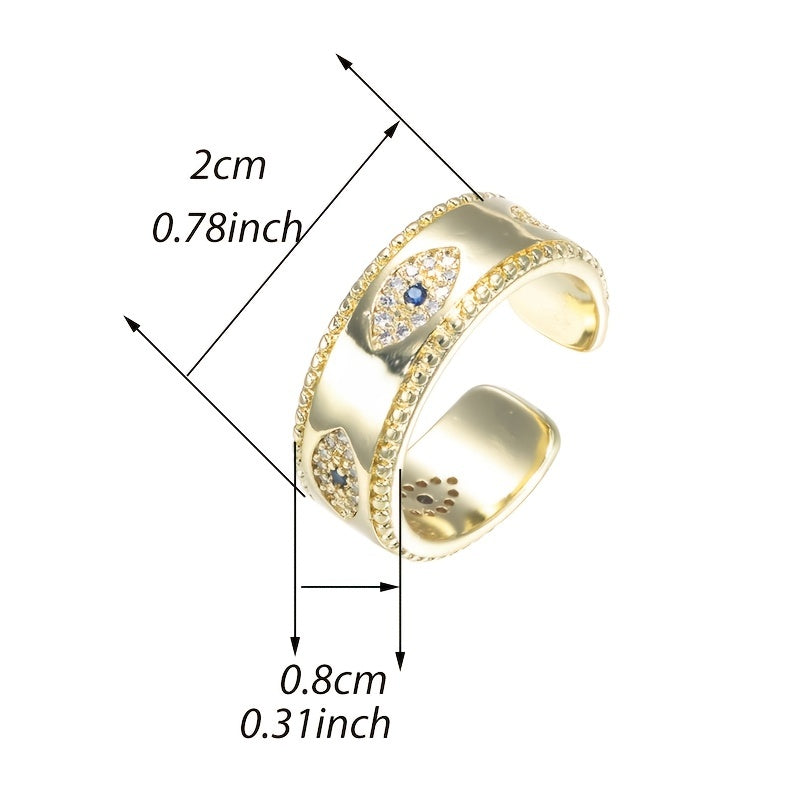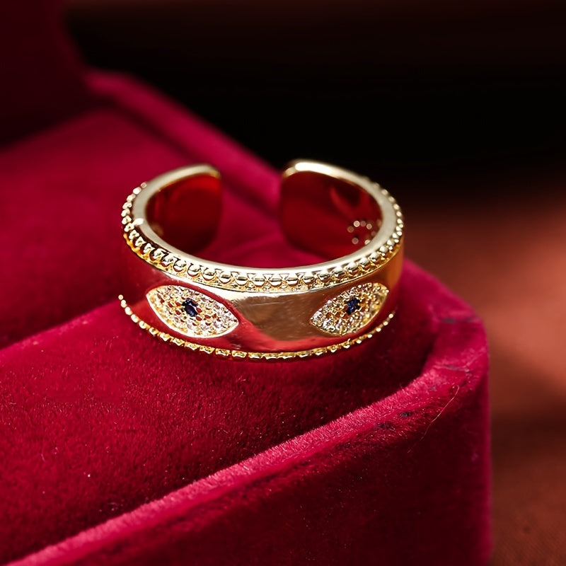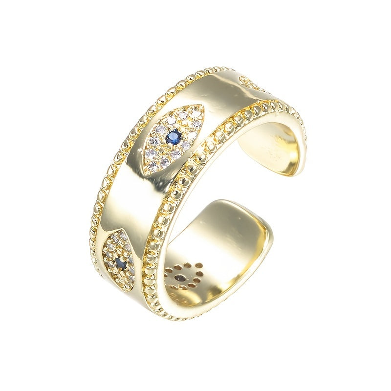Add a touch of luck and style to your look with this stunning evil eye zircon ring. Plated in gold, this wide band finger ring is perfect for any occasion.