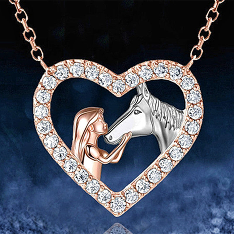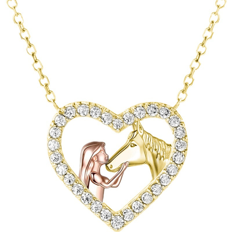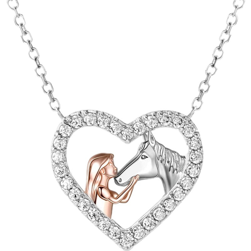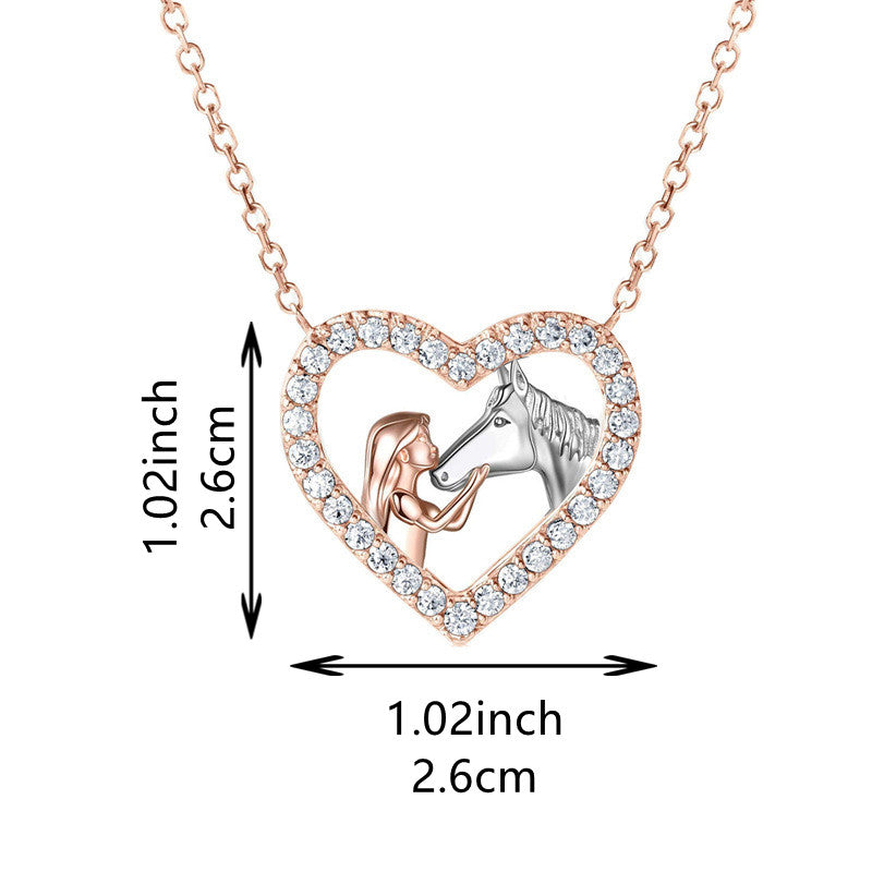 Beautiful heart pendant necklace featuring a woman and horse design, perfect for engagements. Surprise your loved one with this unique jewelry accessory.