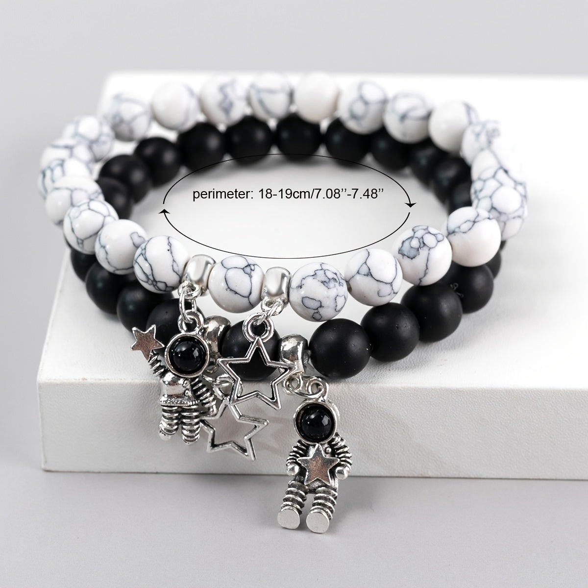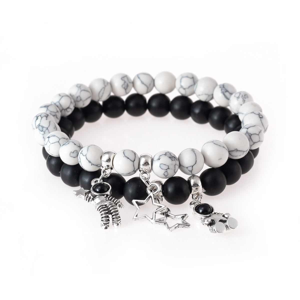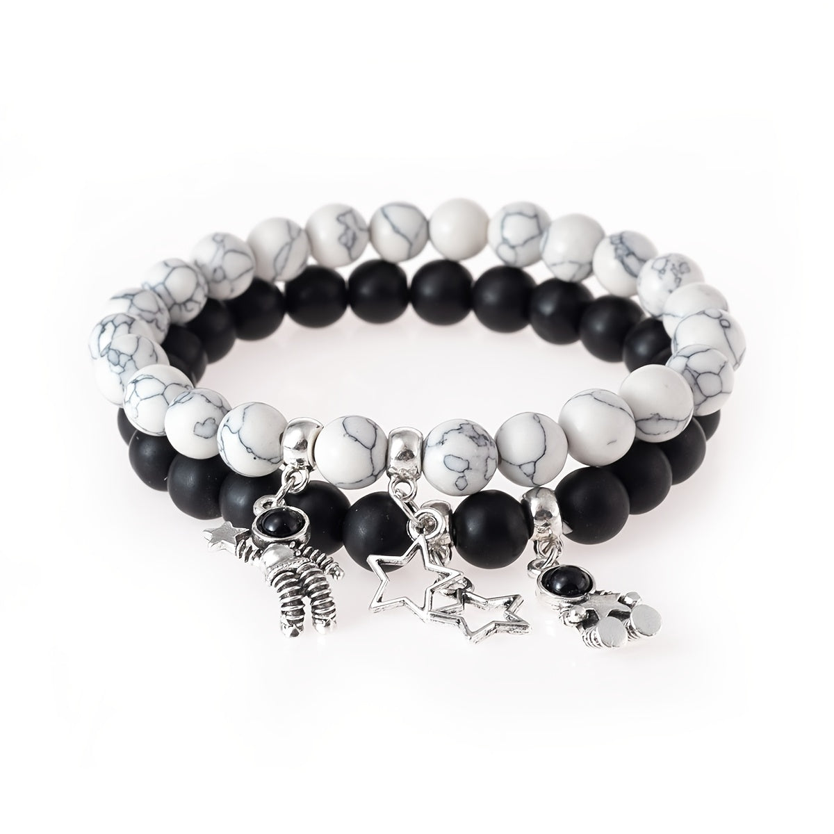 This couple bracelet set features yin yang beaded design with star and astronaut charms. Perfect for matching couples.