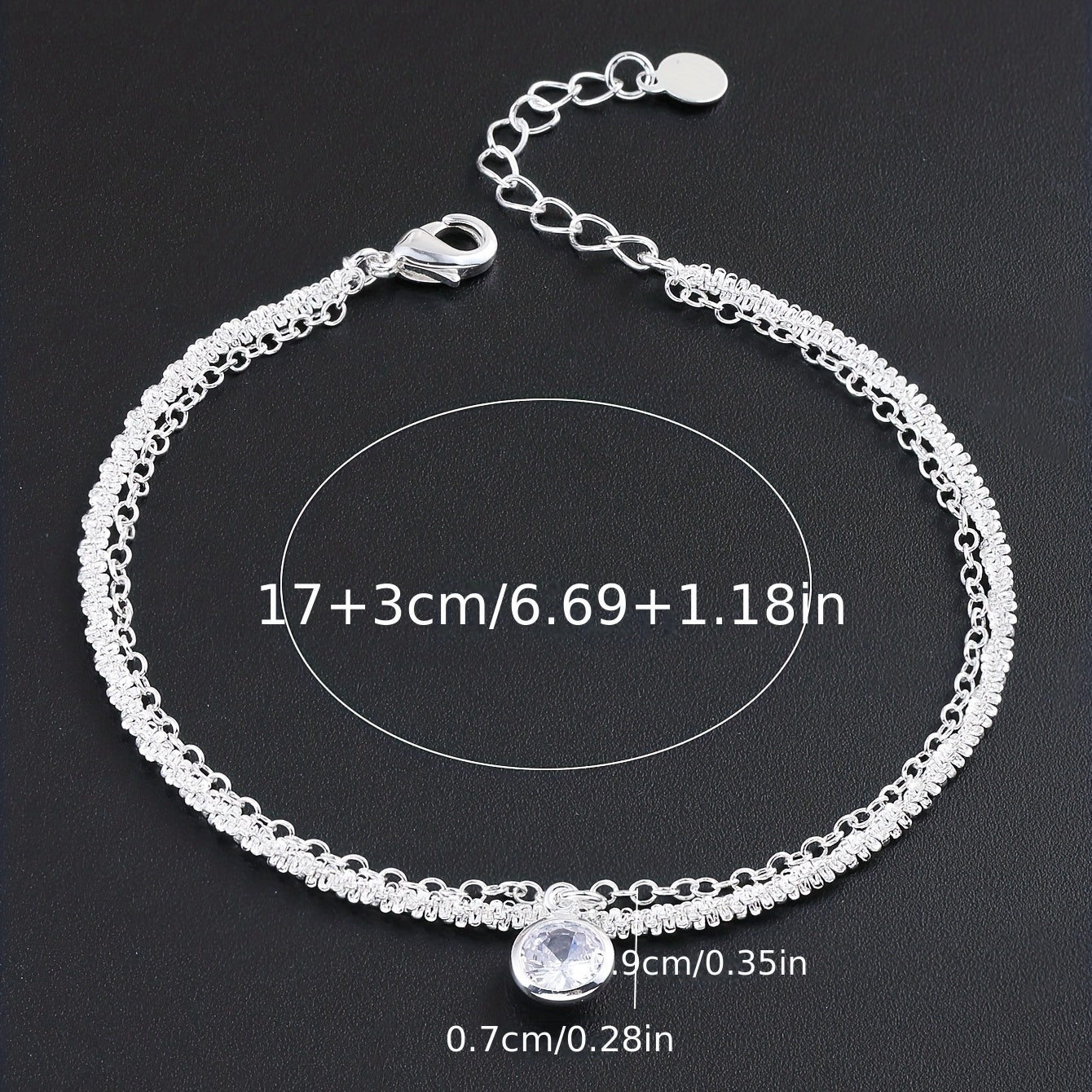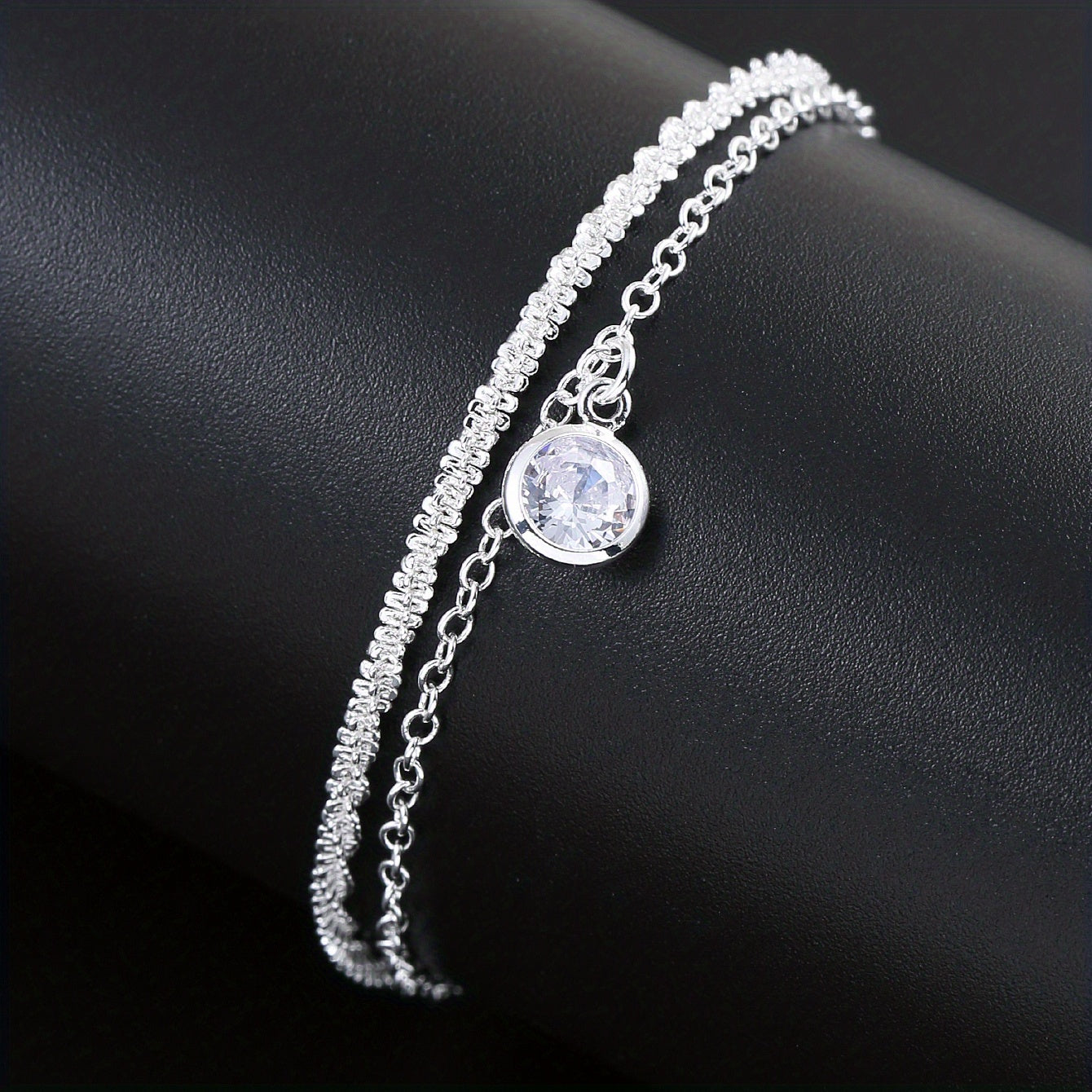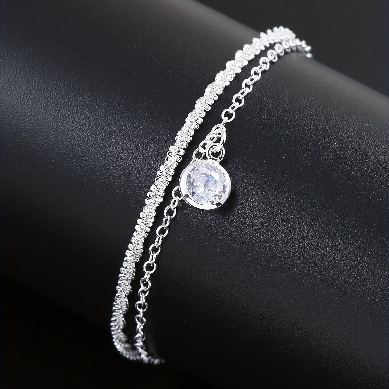 Add an elegant touch to your hand with this minimalist style bracelet. The double layer design with zircon detailing is perfect for any occasion, and the silver plating adds a touch of sophistication.