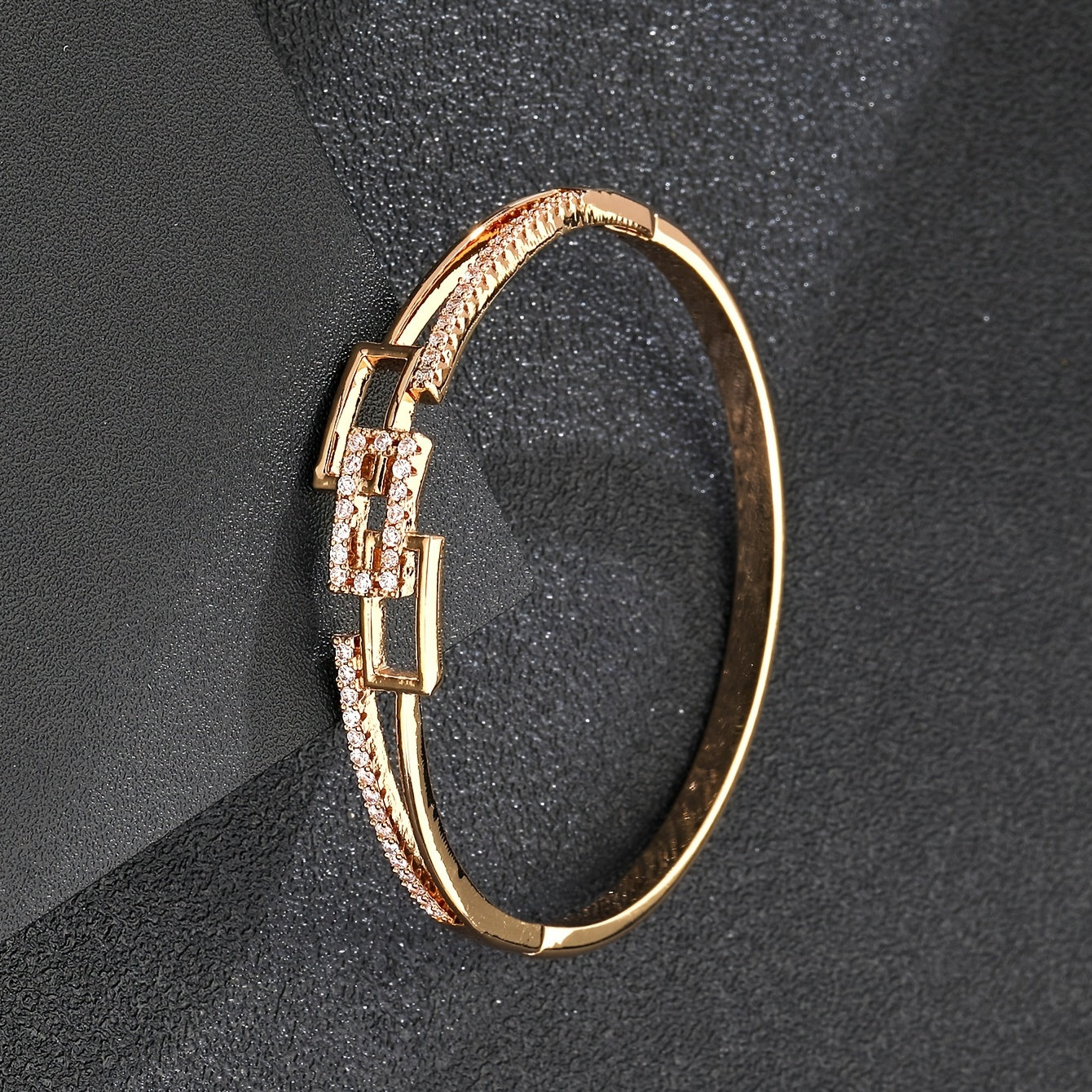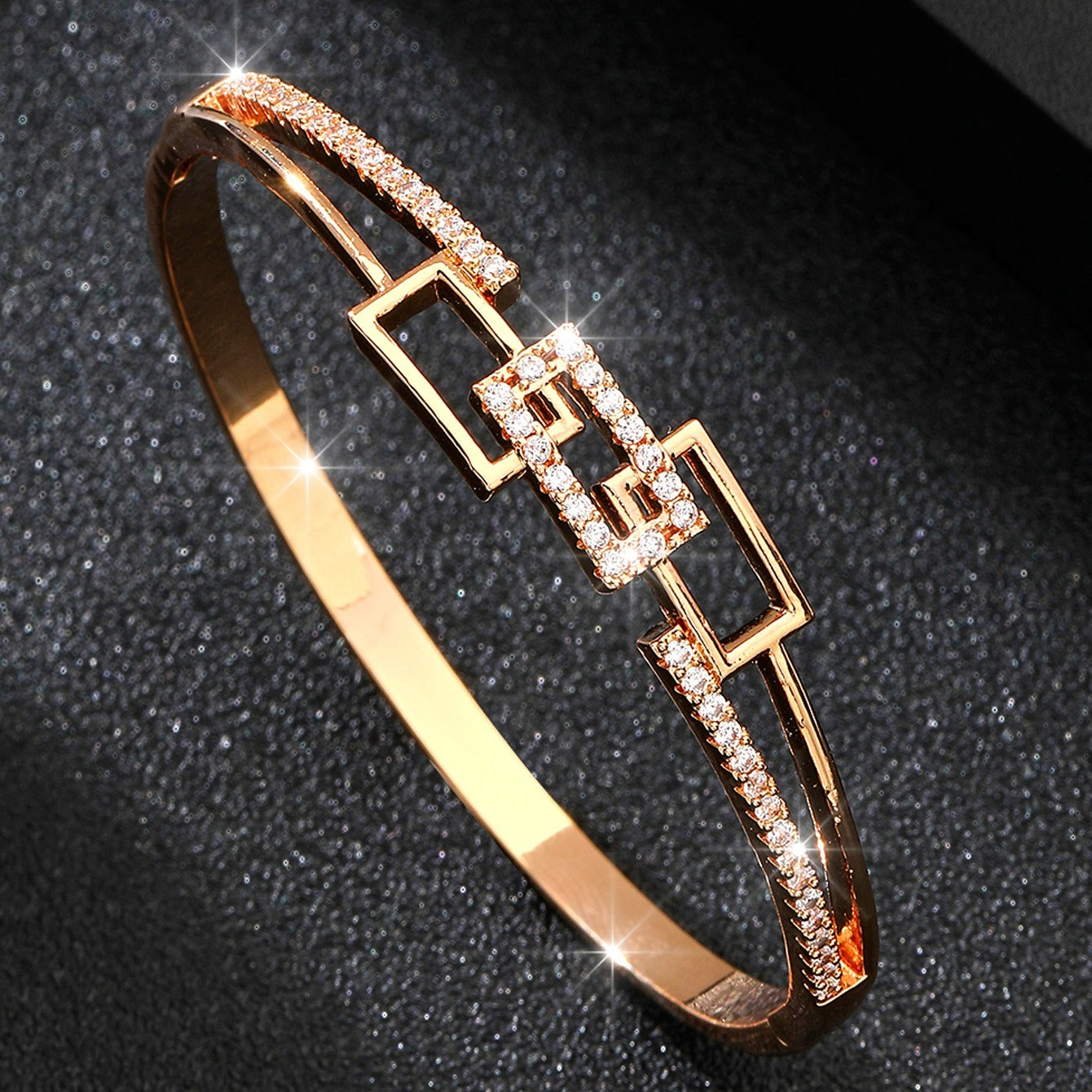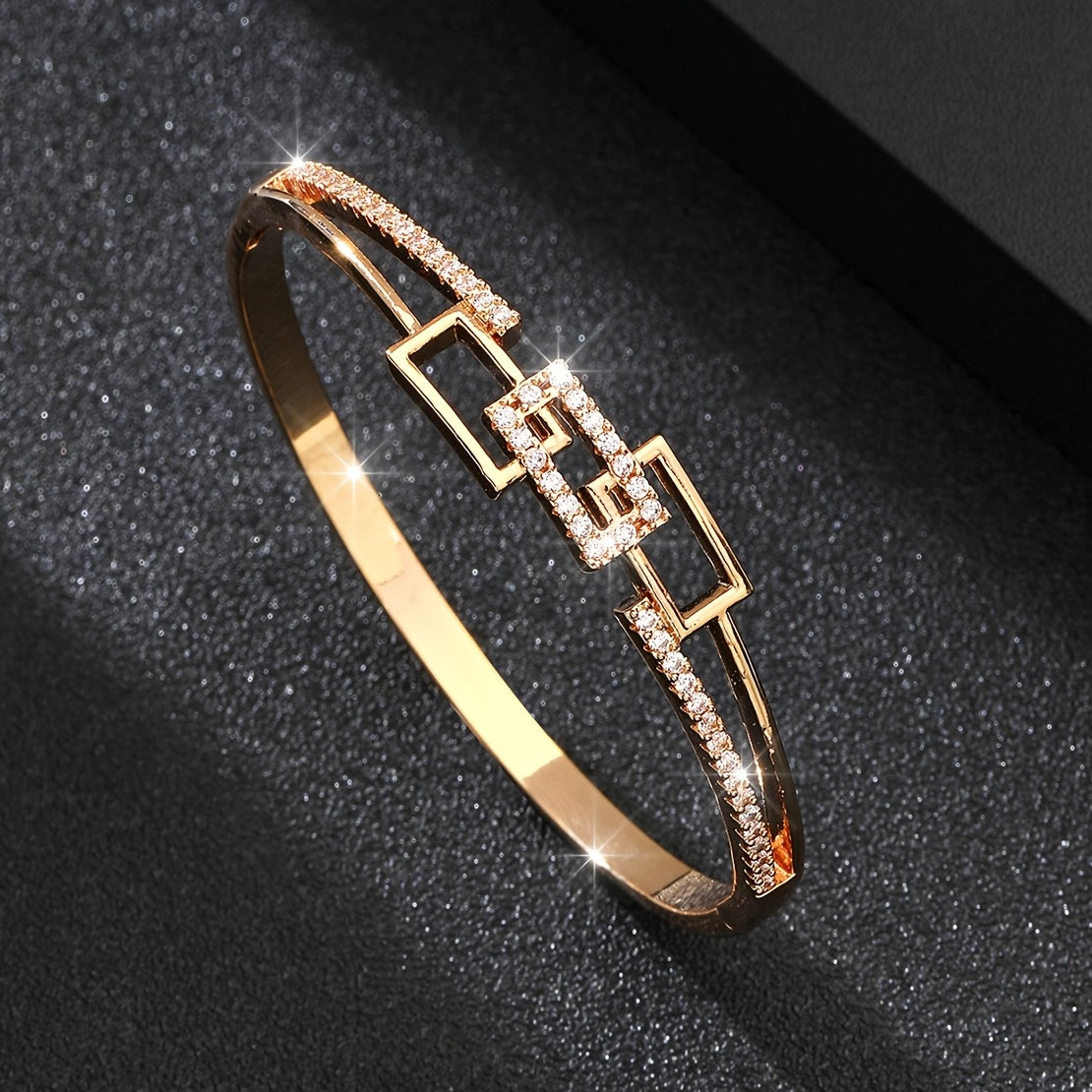 This bangle bracelet features a sleek design with geometric shapes and sparkling zircon stones. It is a stylish and practical accessory that will elevate your look. Perfect gift for women.