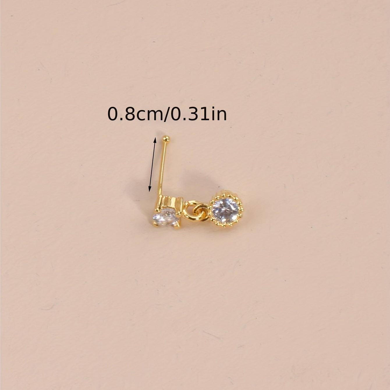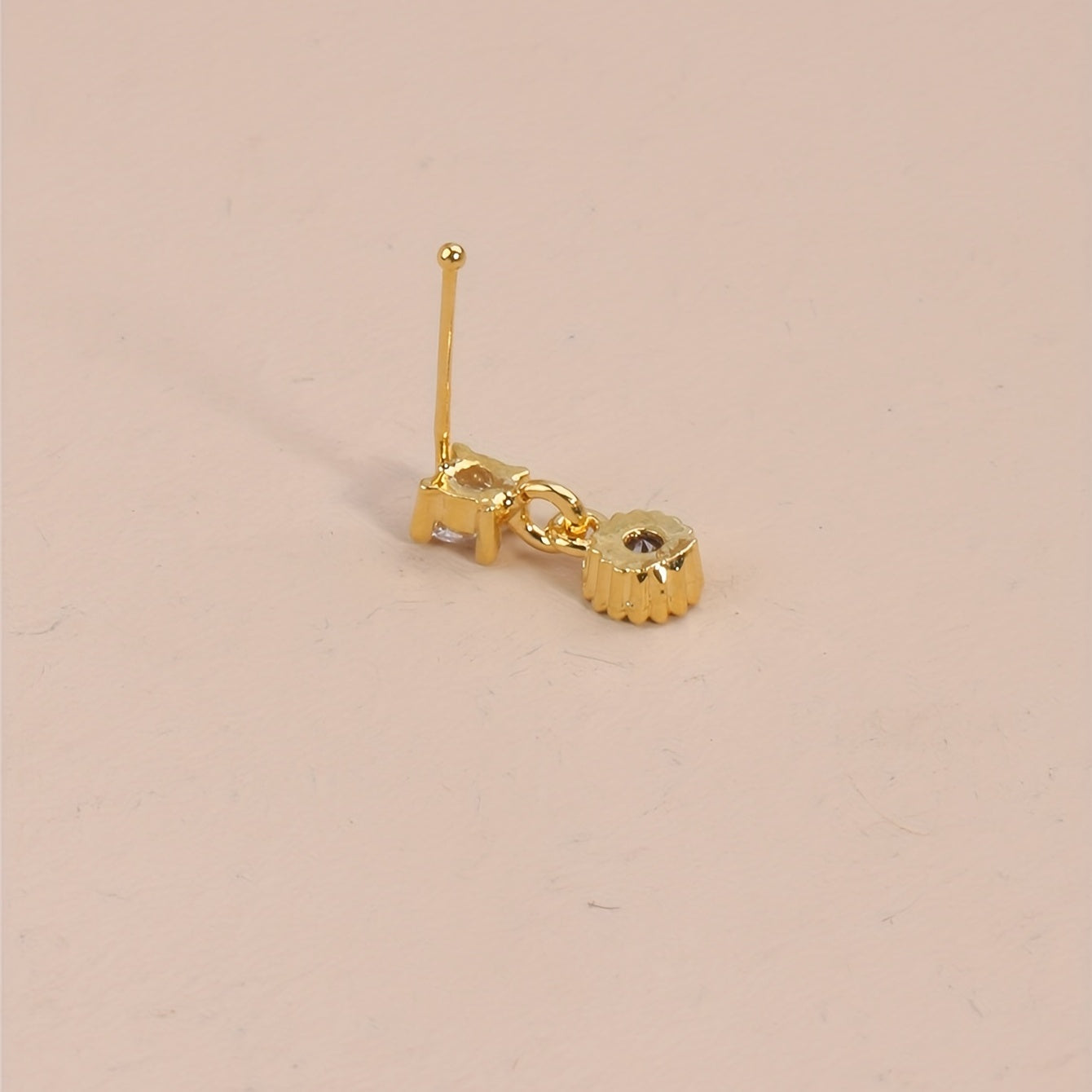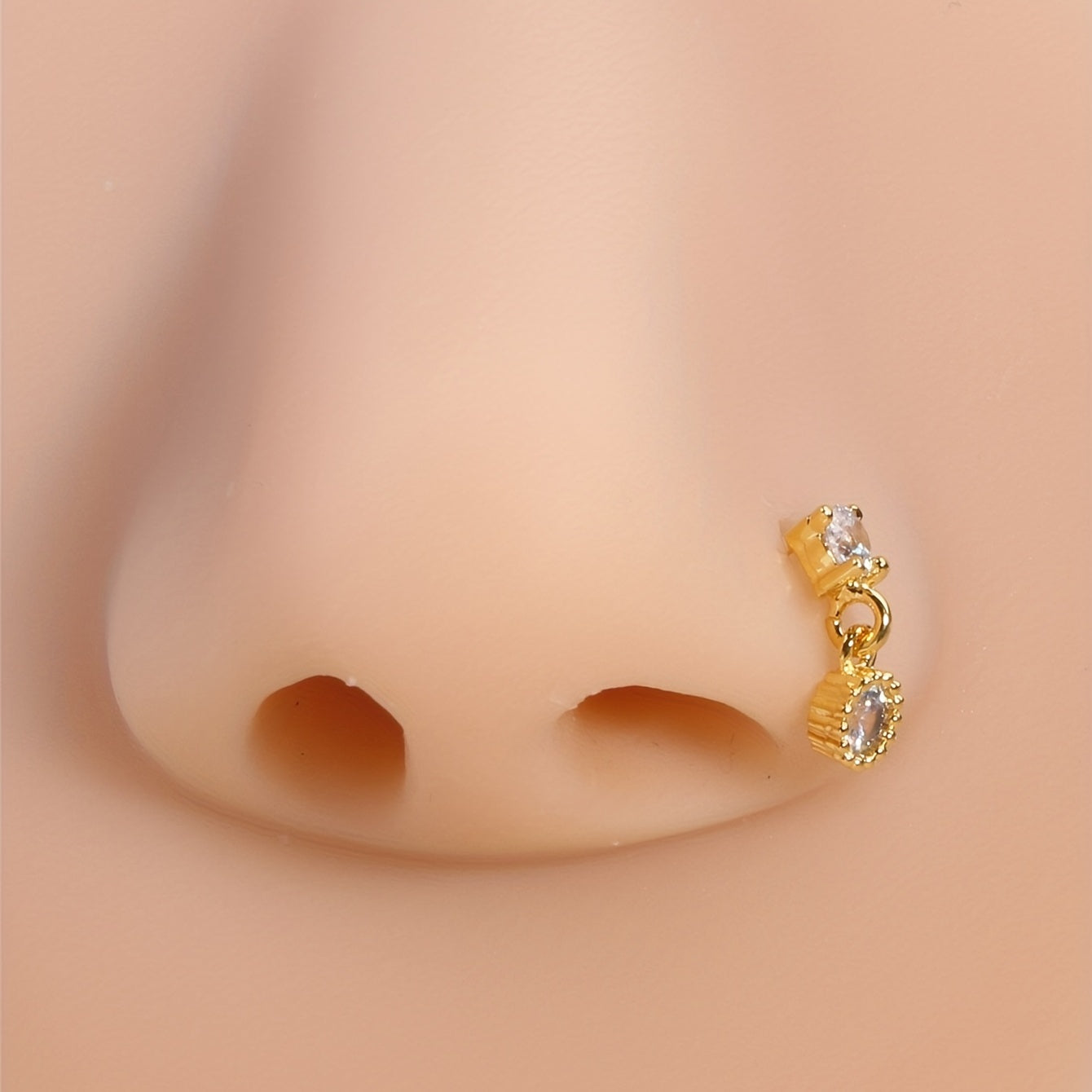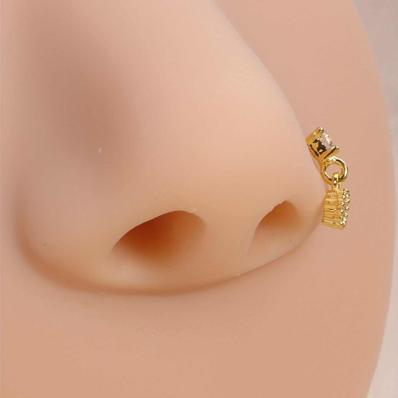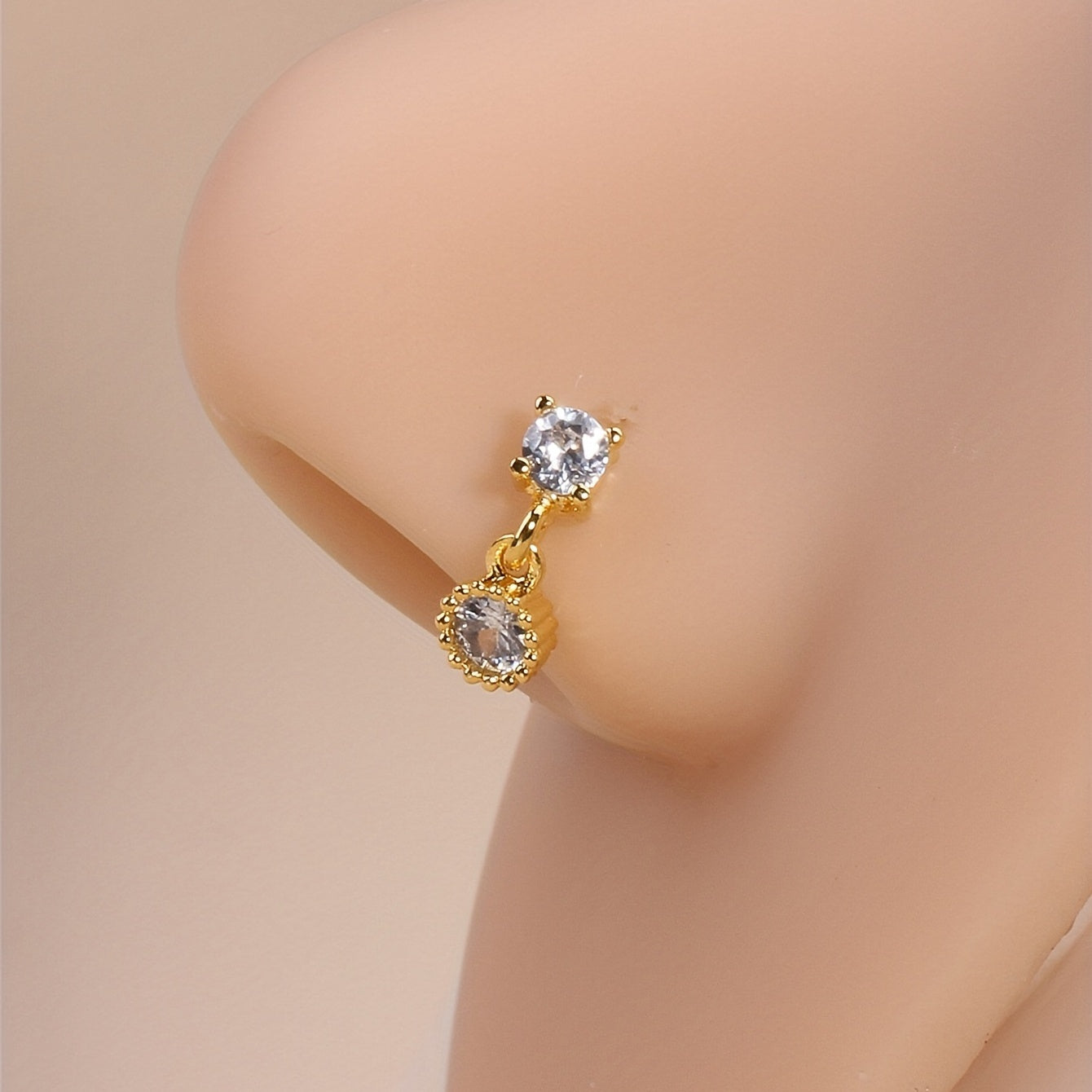 Enhance your style with this beautiful dangle nose ring featuring round cut zircon inlays. Perfect for adding a touch of elegance to your body piercing collection.