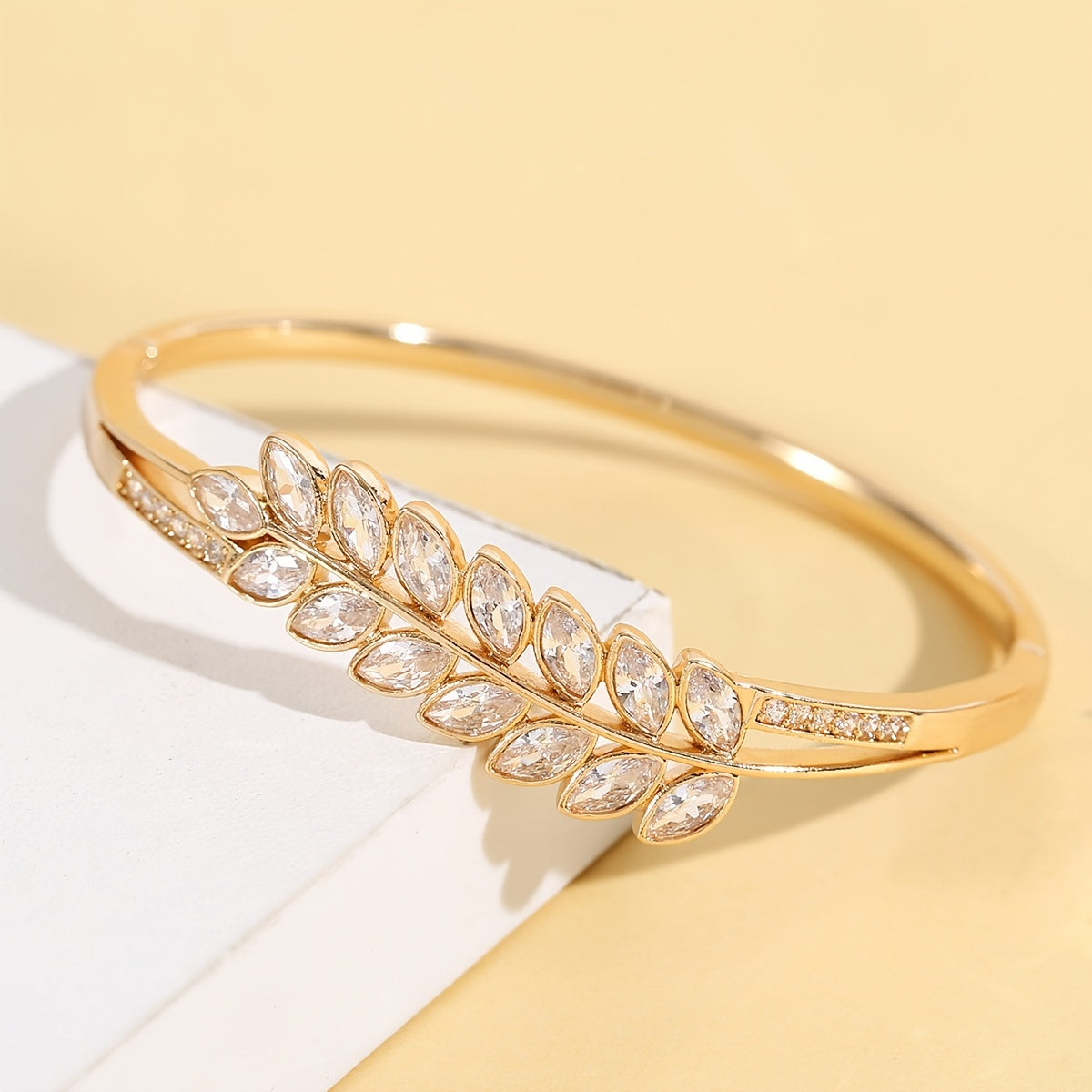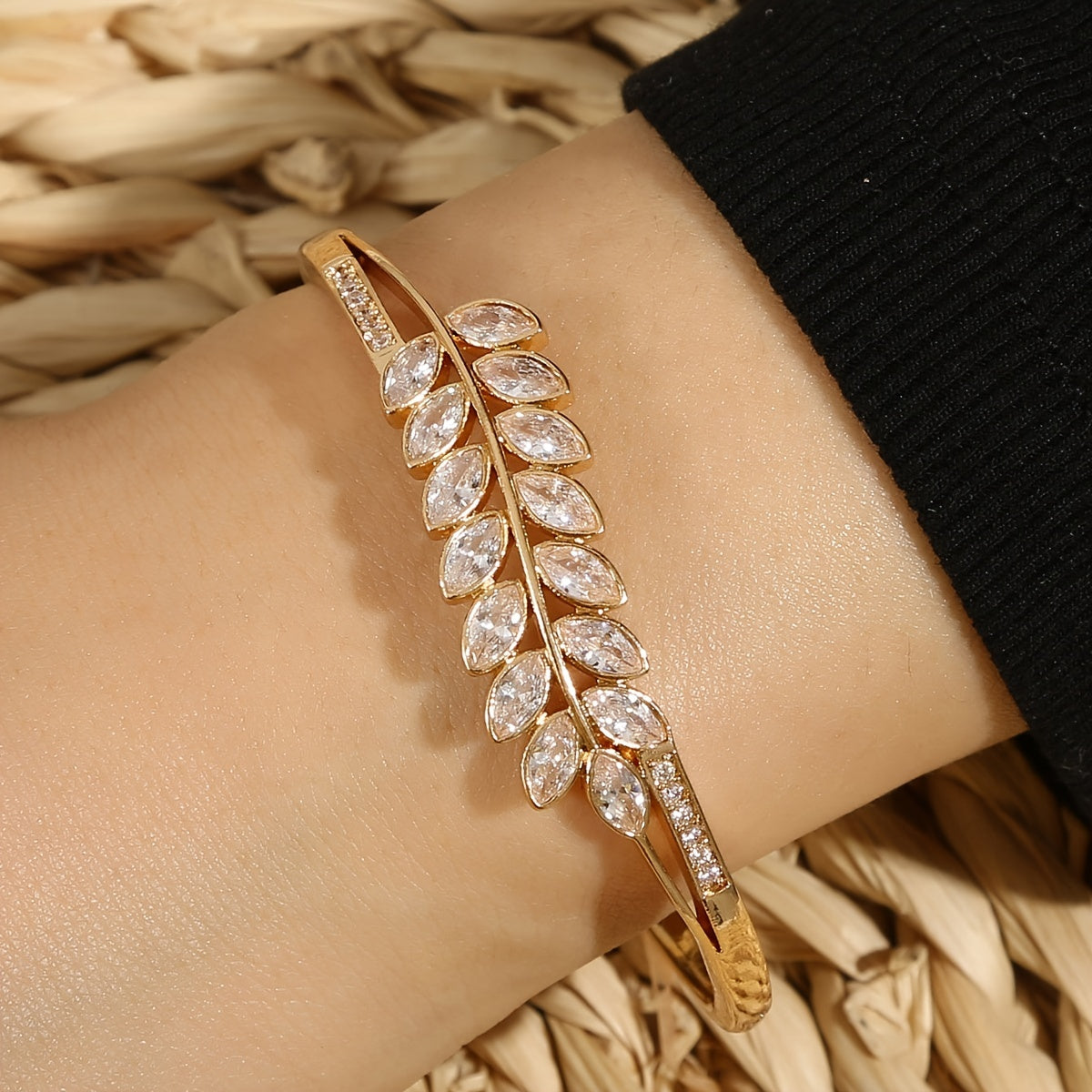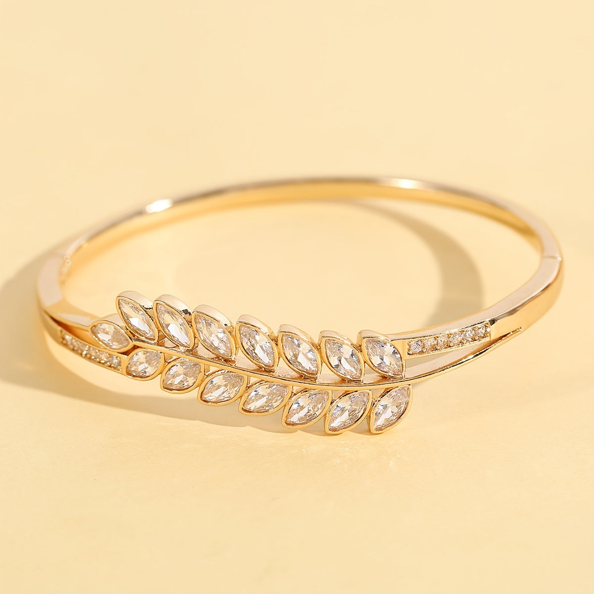Elegant bangle bracelet featuring wheat ear design with zircon inlay. Made of 14K plated alloy for a luxurious look. Perfect hand jewelry decoration for any occasion.