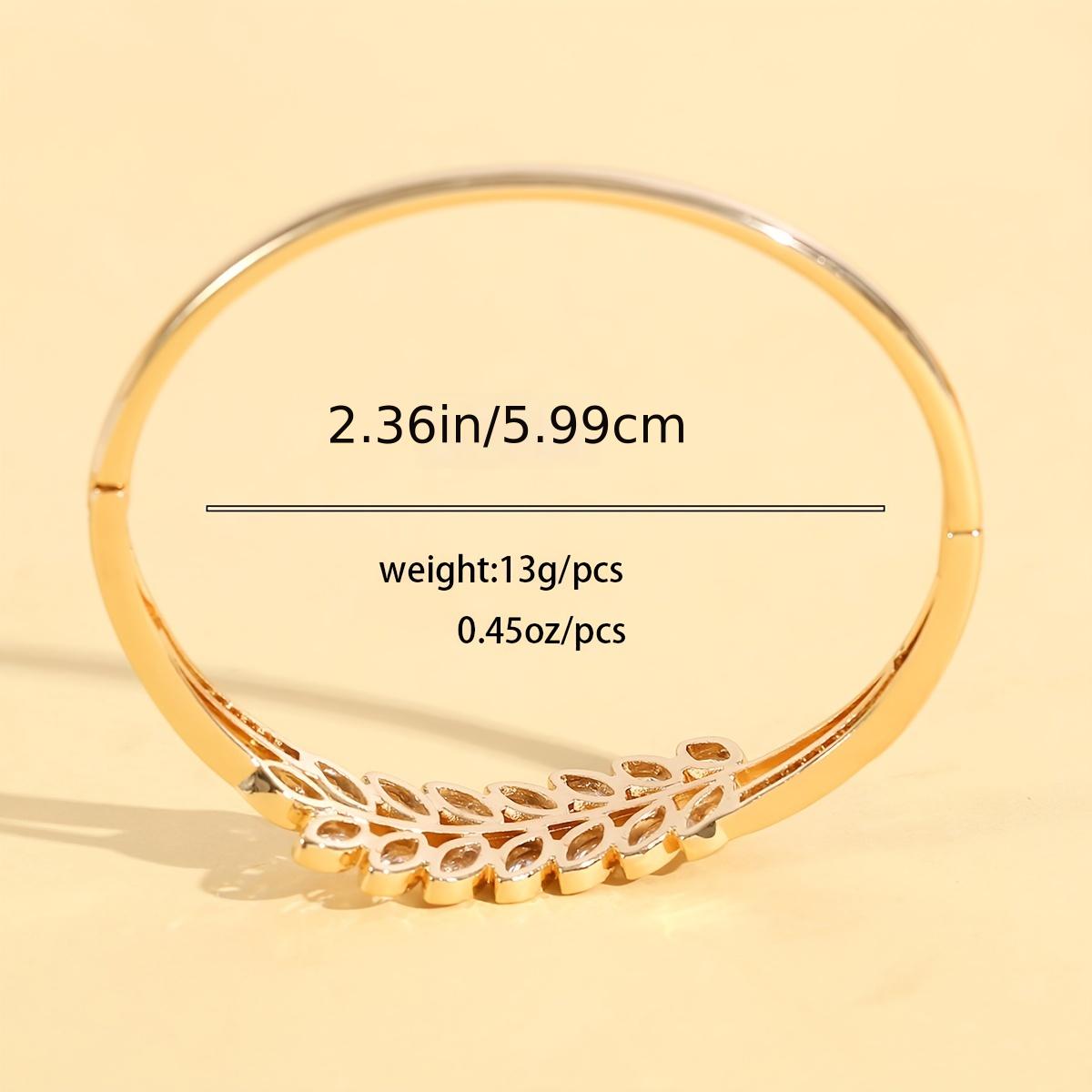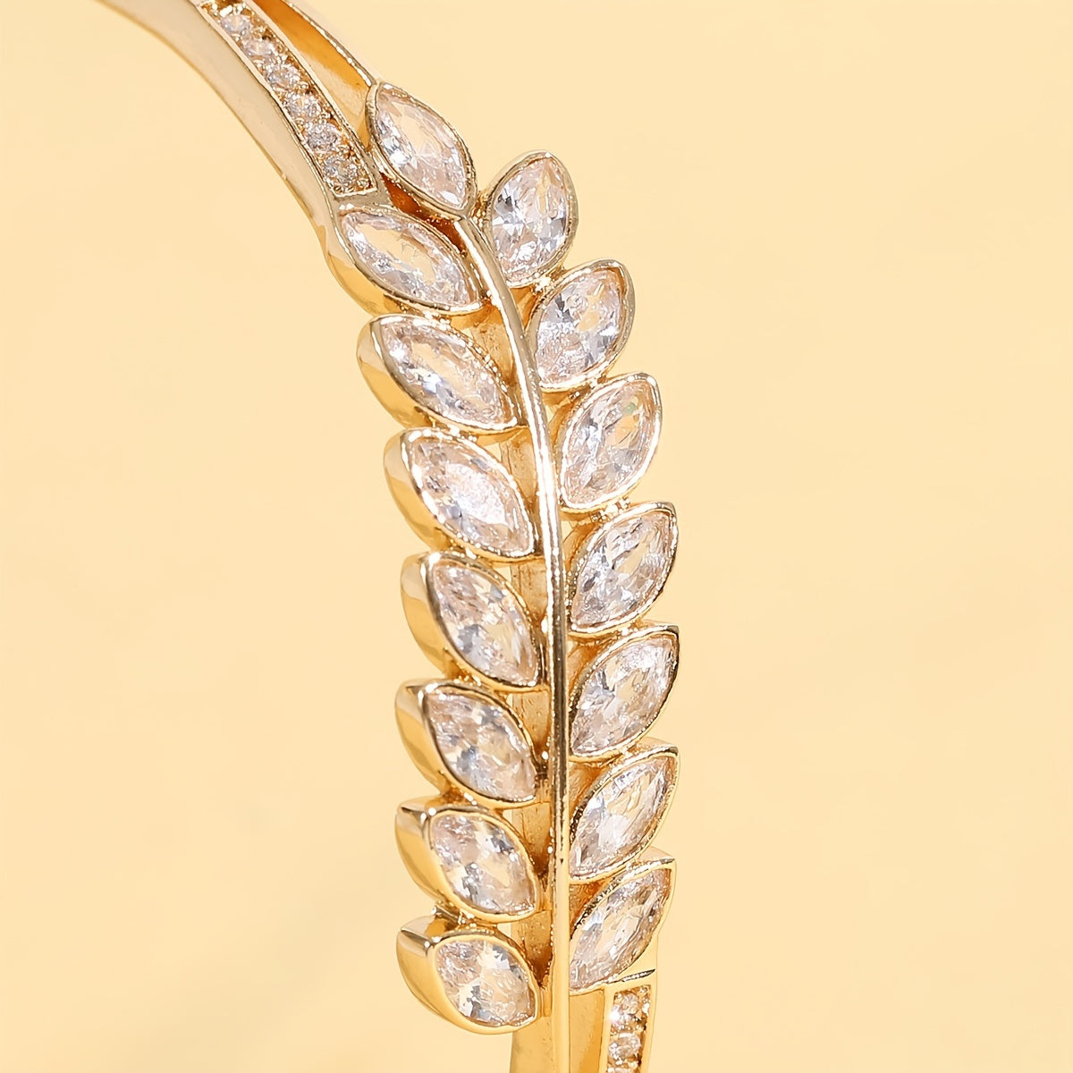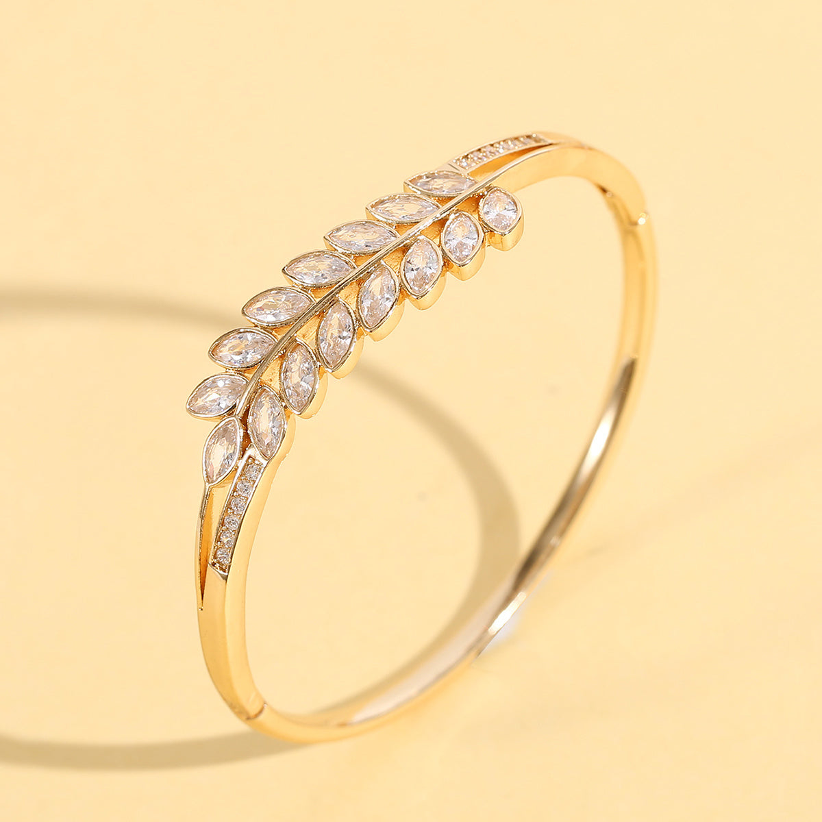 Elegant bangle bracelet featuring wheat ear design with zircon inlay. Made of 14K plated alloy for a luxurious look. Perfect hand jewelry decoration for any occasion.