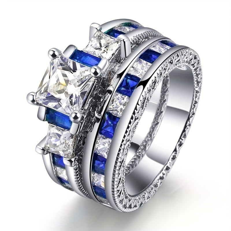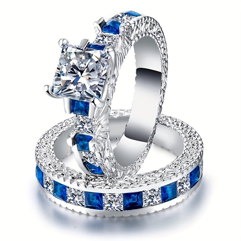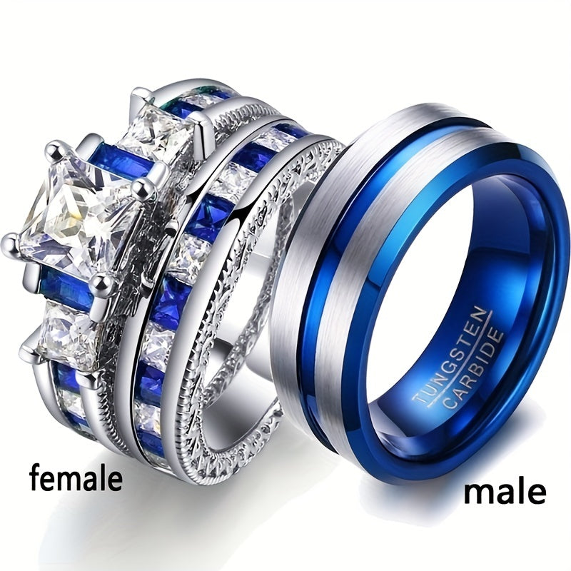 Stylish couple rings featuring inlaid zircon stones. Perfect for engagement or wedding. Made of high-quality stainless steel for durability.
