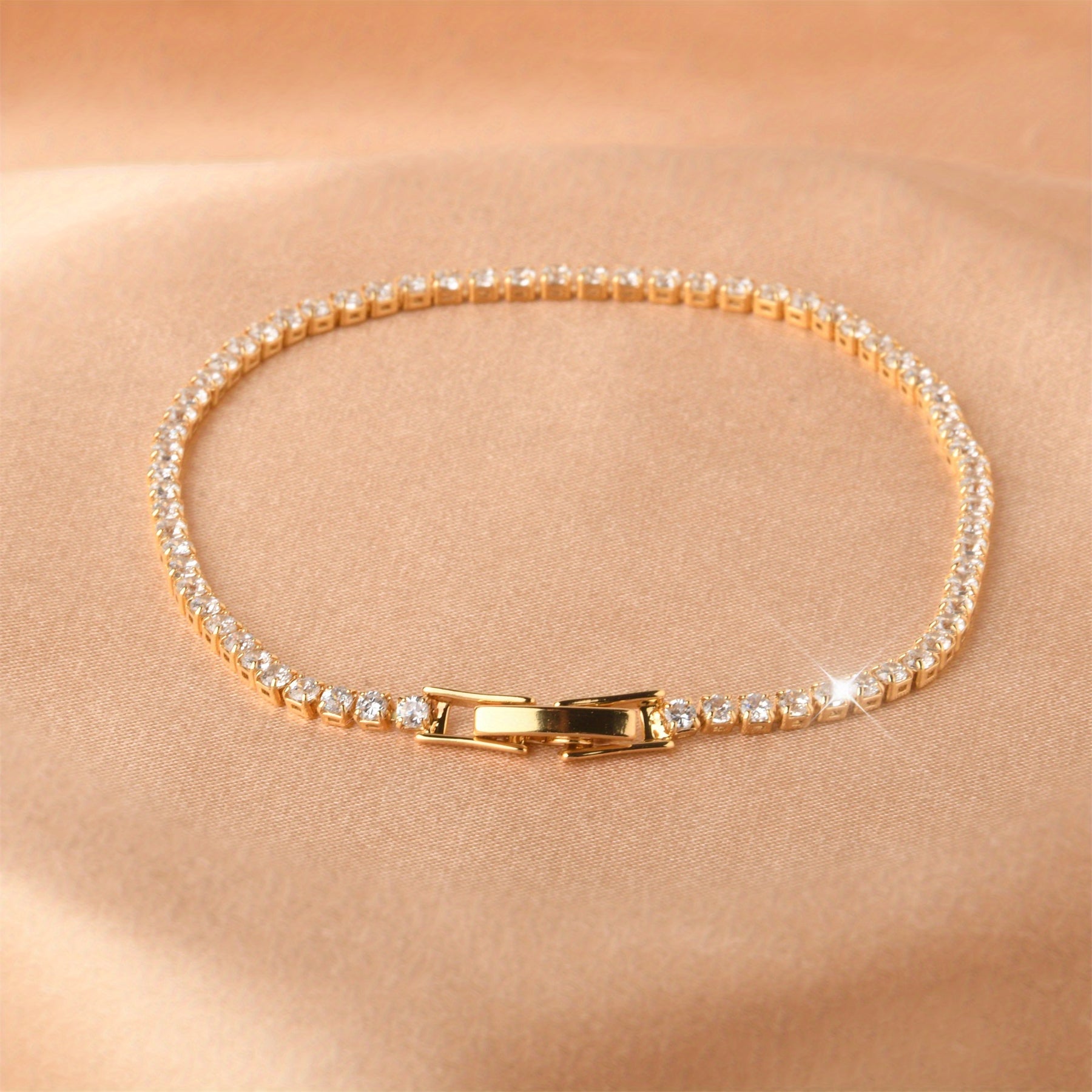 Elegant tennis bracelet with zircon stones, plated with 18K gold over copper. Perfect accessory or gift for mothers.