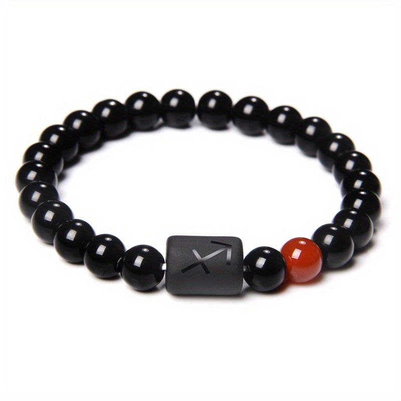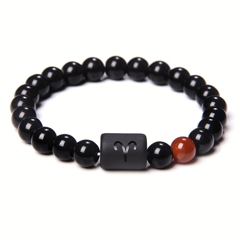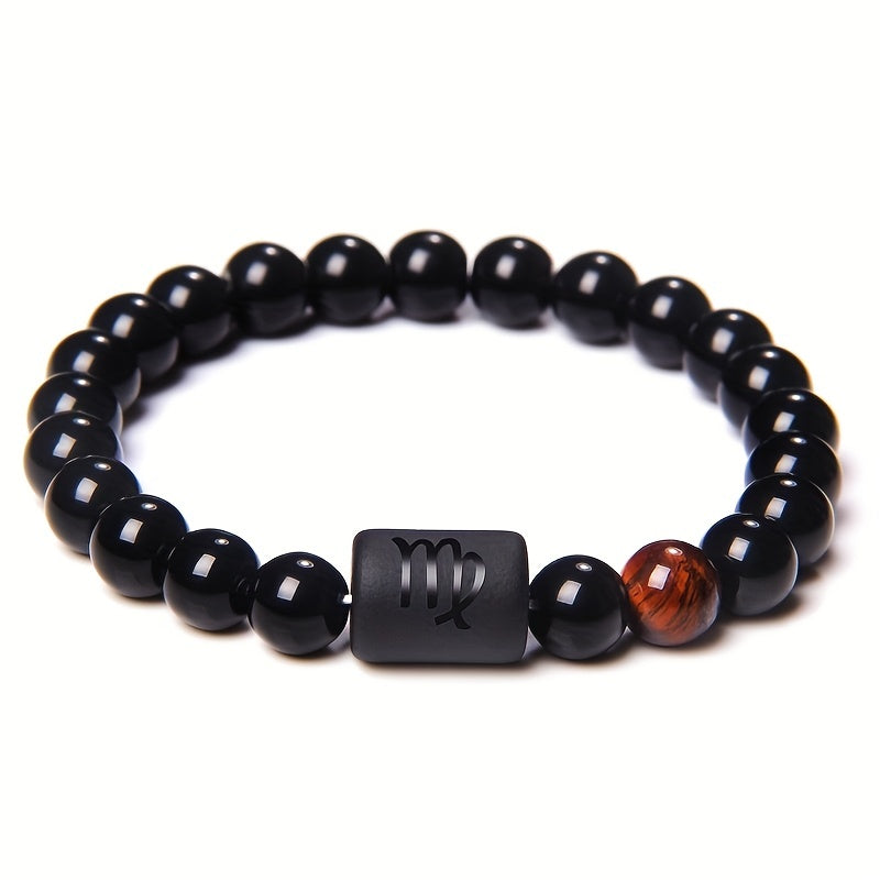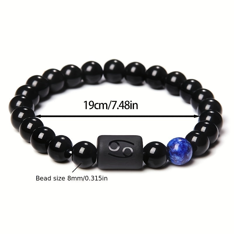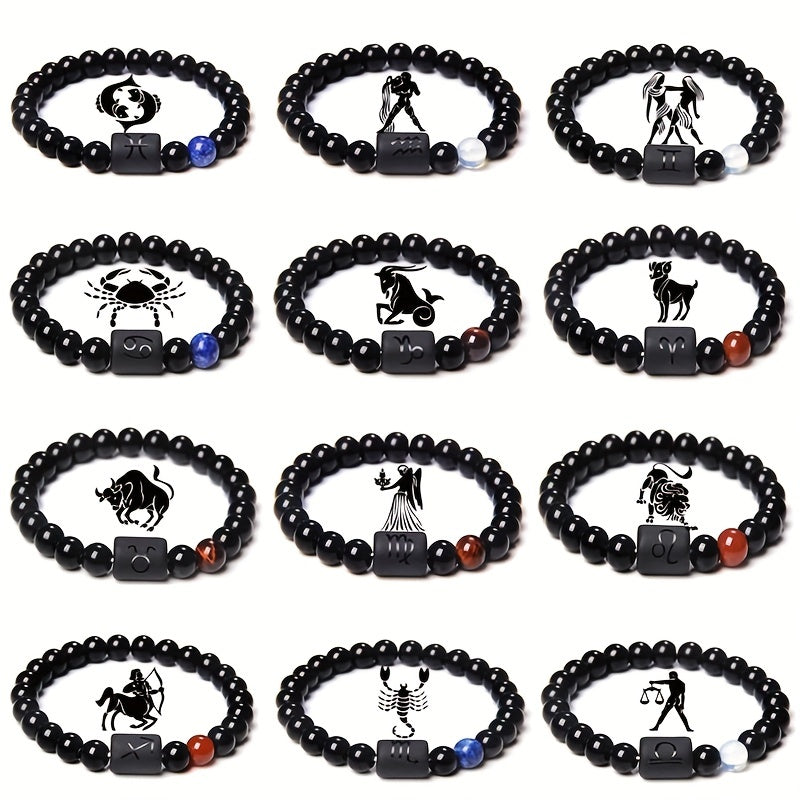 This elastic rope bracelet features twelve zodiac signs and bright face beads. It is a stylish hand accessory.