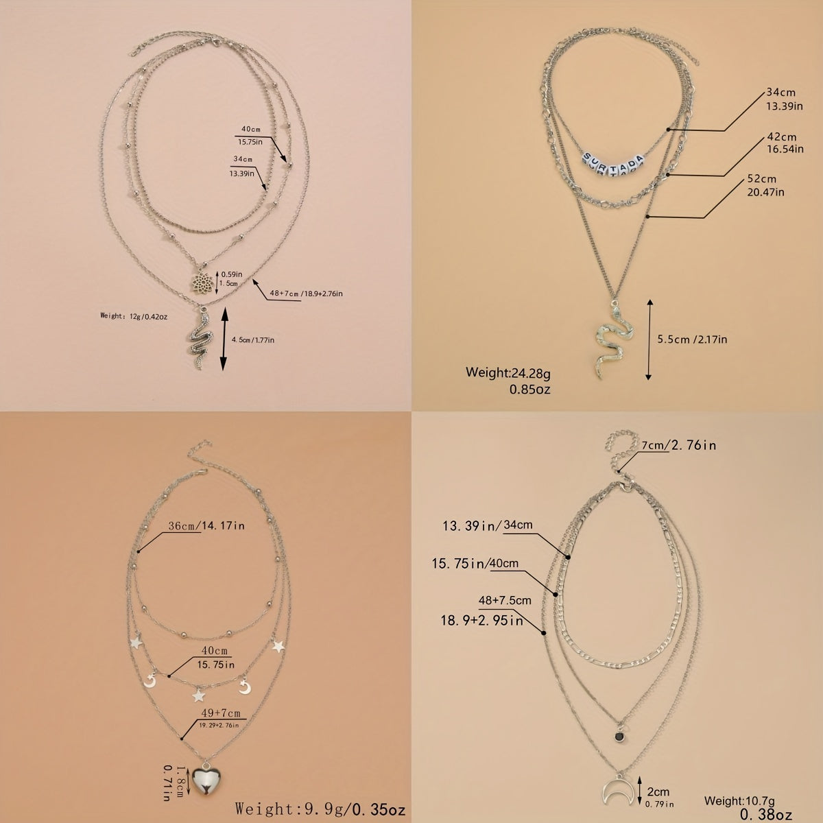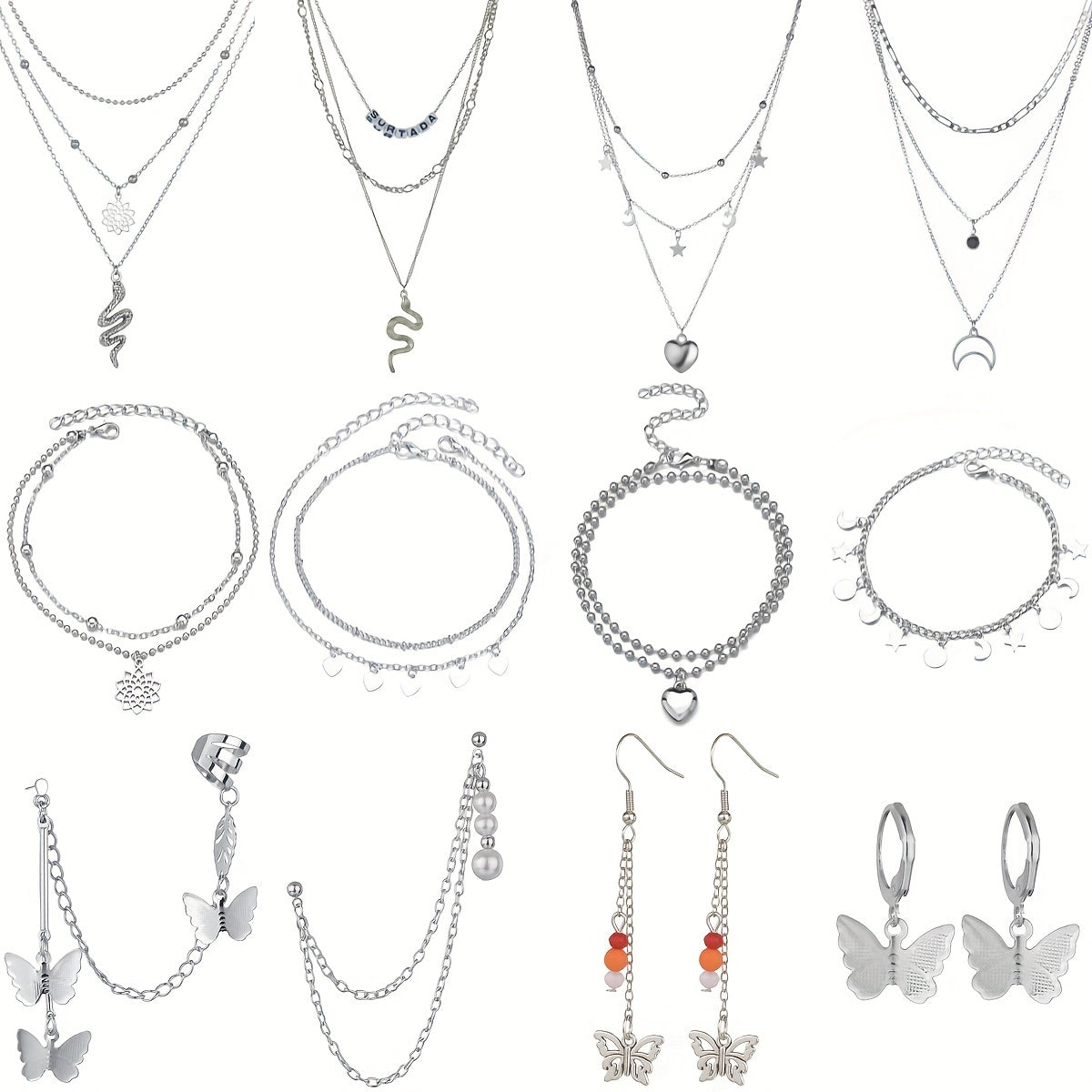 This 12-piece jewelry set includes necklaces, anklets, and earrings that can be mixed and matched with different outfits. The zinc alloy pieces feature heart pendants, snake shapes, and moon patterns, making them a perfect accessory for daily wear.