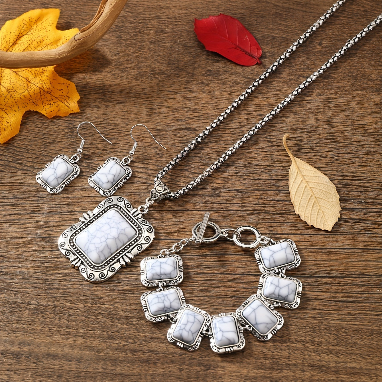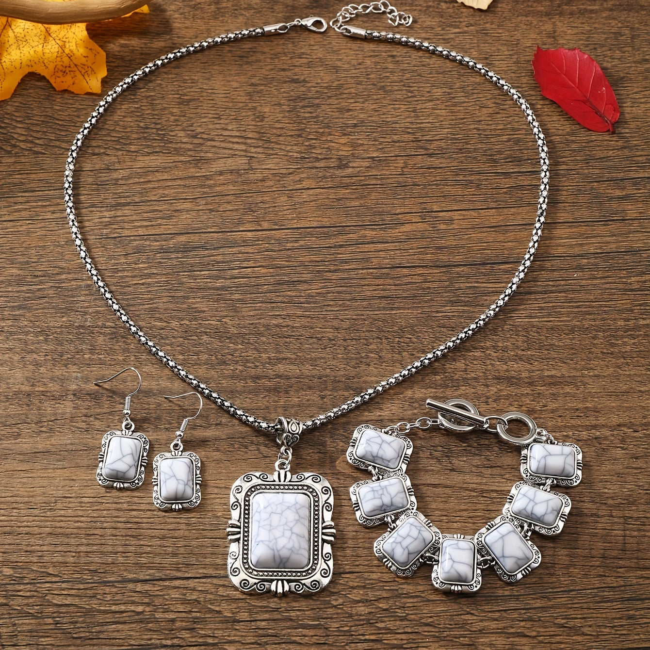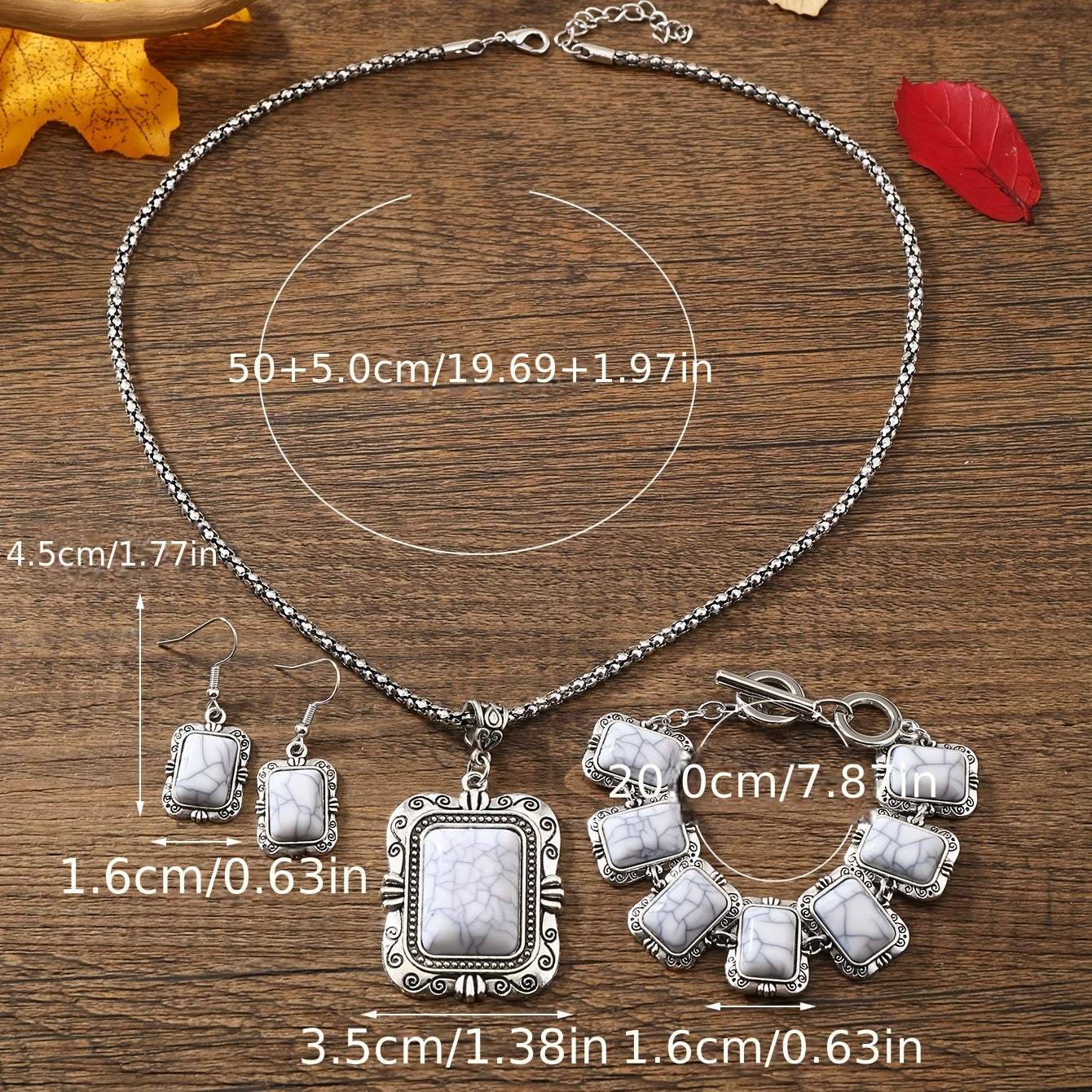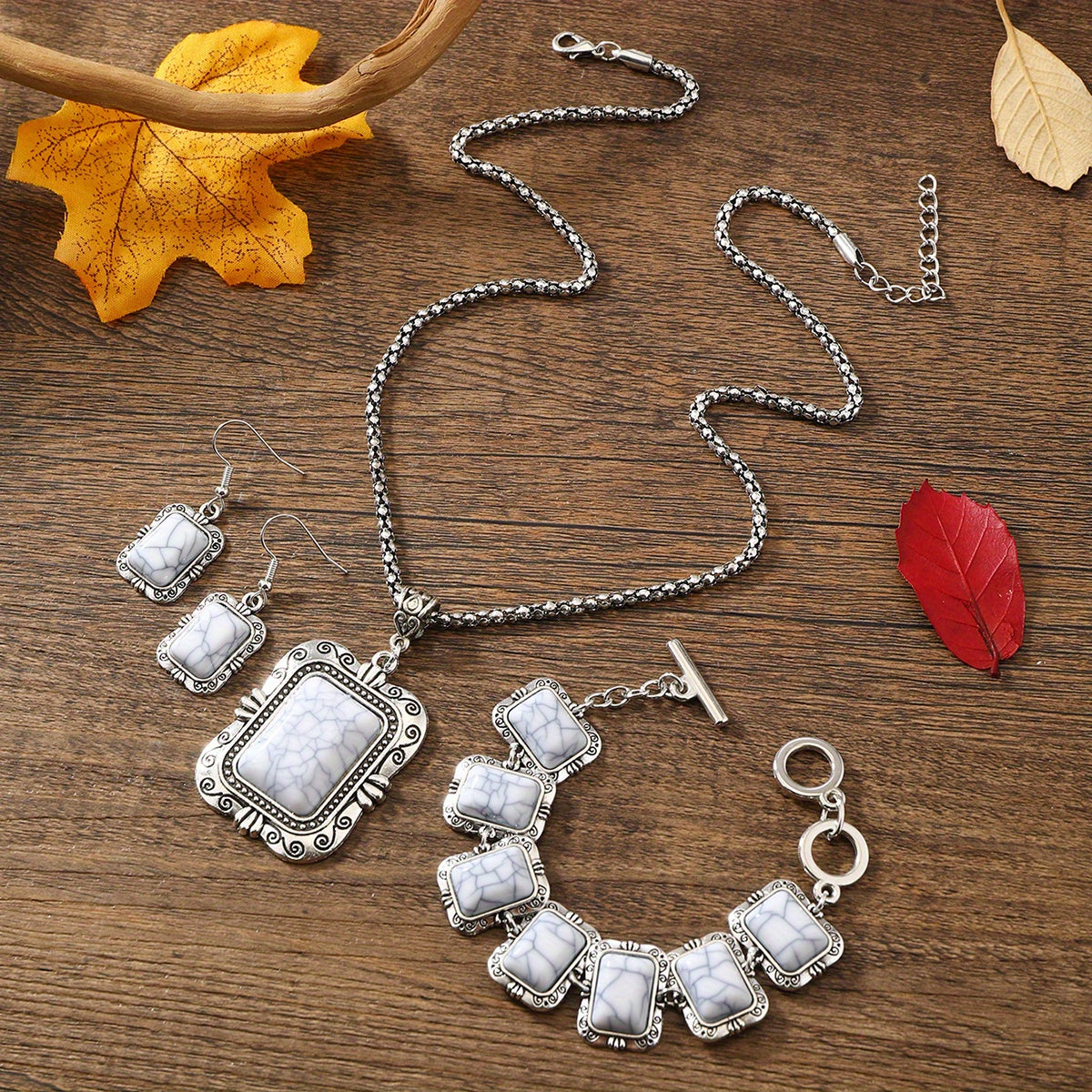 Elevate your daily outfits with this dainty boho style jewelry set. Includes earrings, necklace, and bracelet with inlaid gemstones. Perfect as a birthday gift for female friends and loved ones.