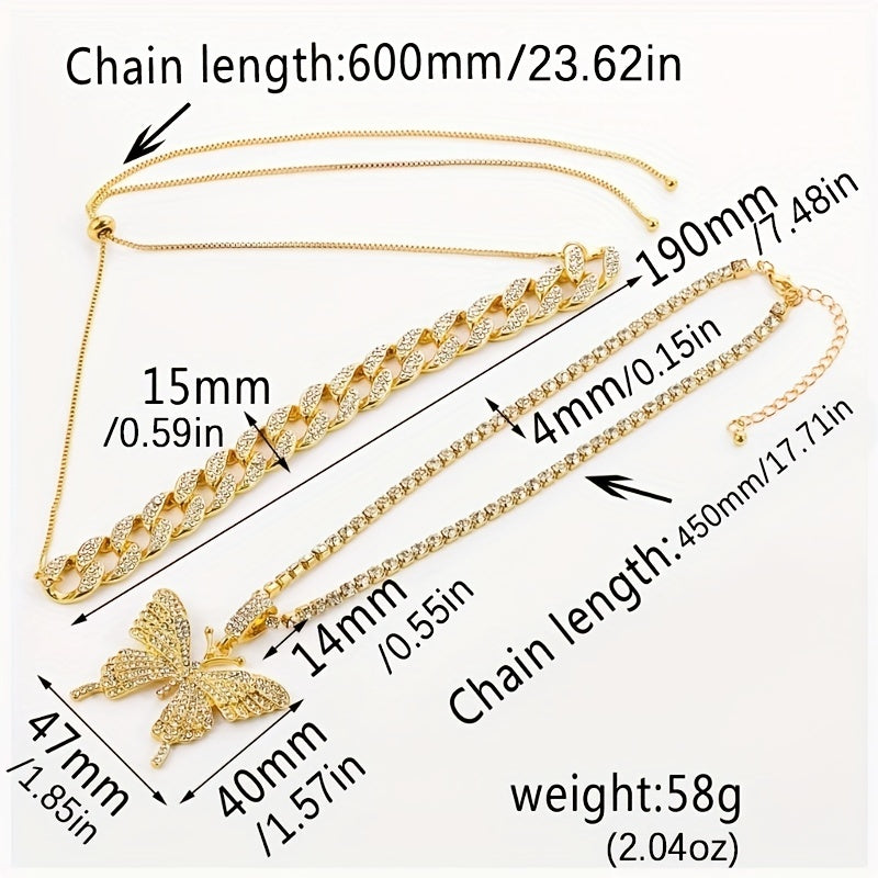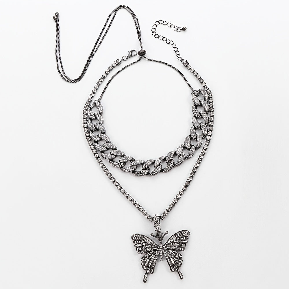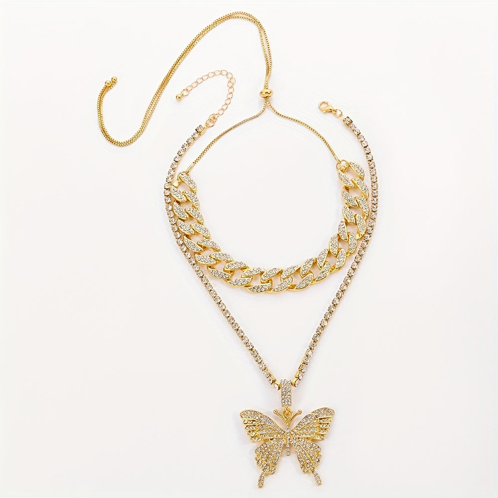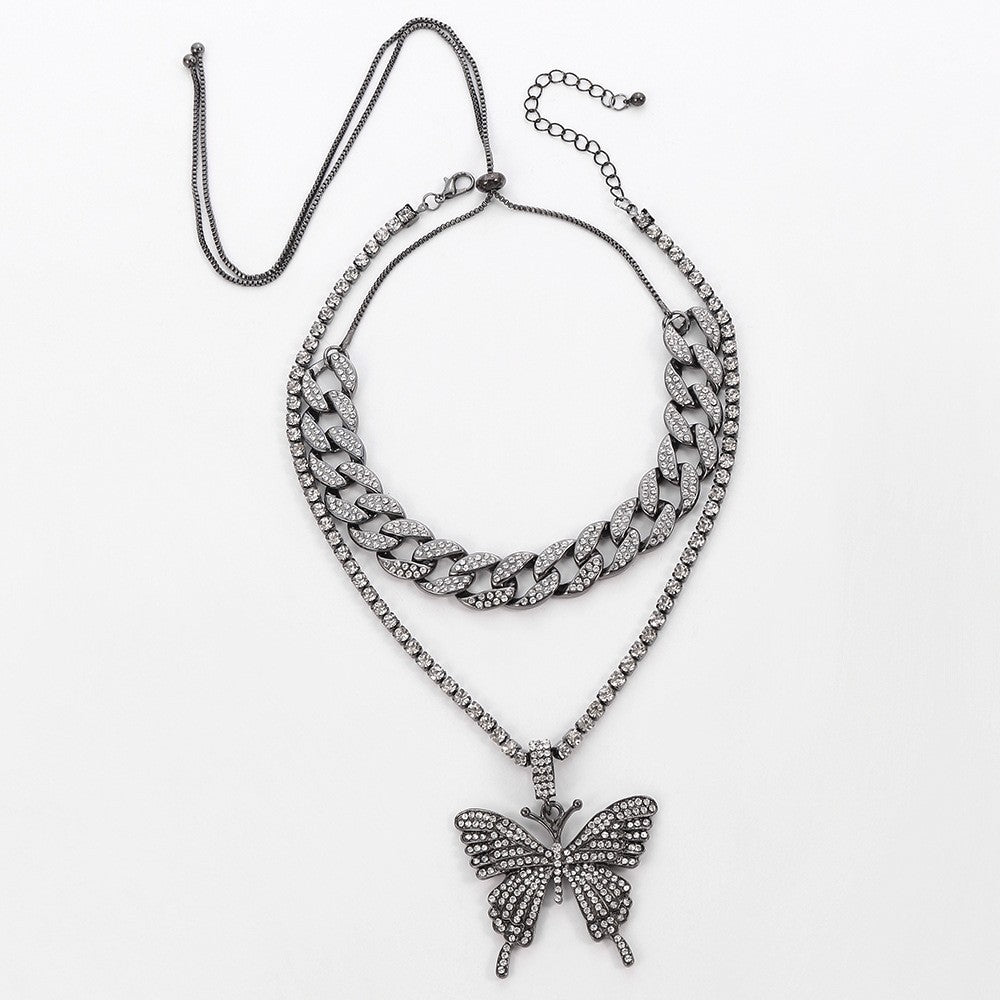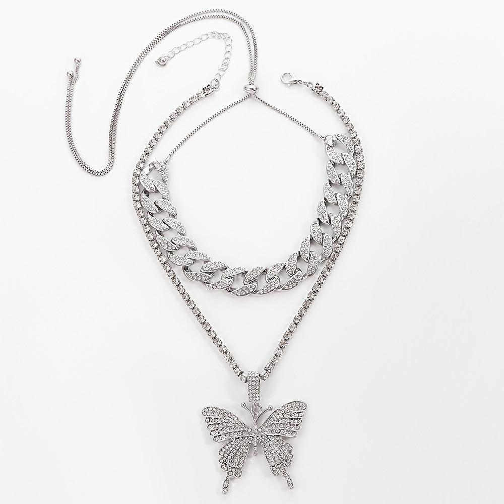 Elevate your style with this stunning double-layer butterfly necklace featuring rhinestone studded Cuban link chains.