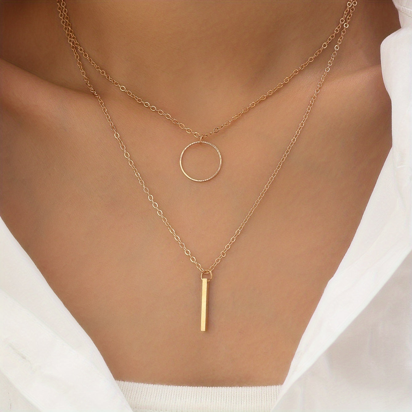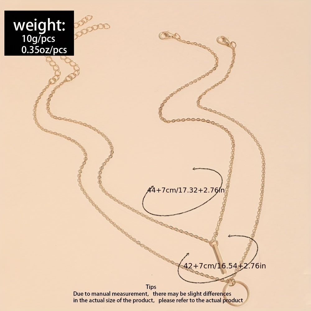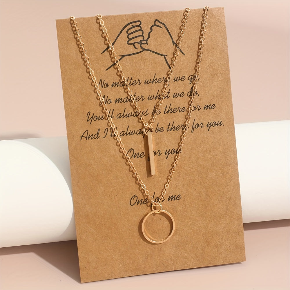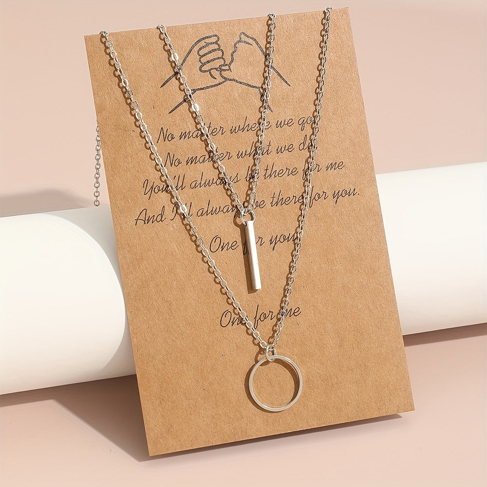 This set includes two elegant necklaces featuring circle ring and long rod pendants. Perfect gift for women and girls.