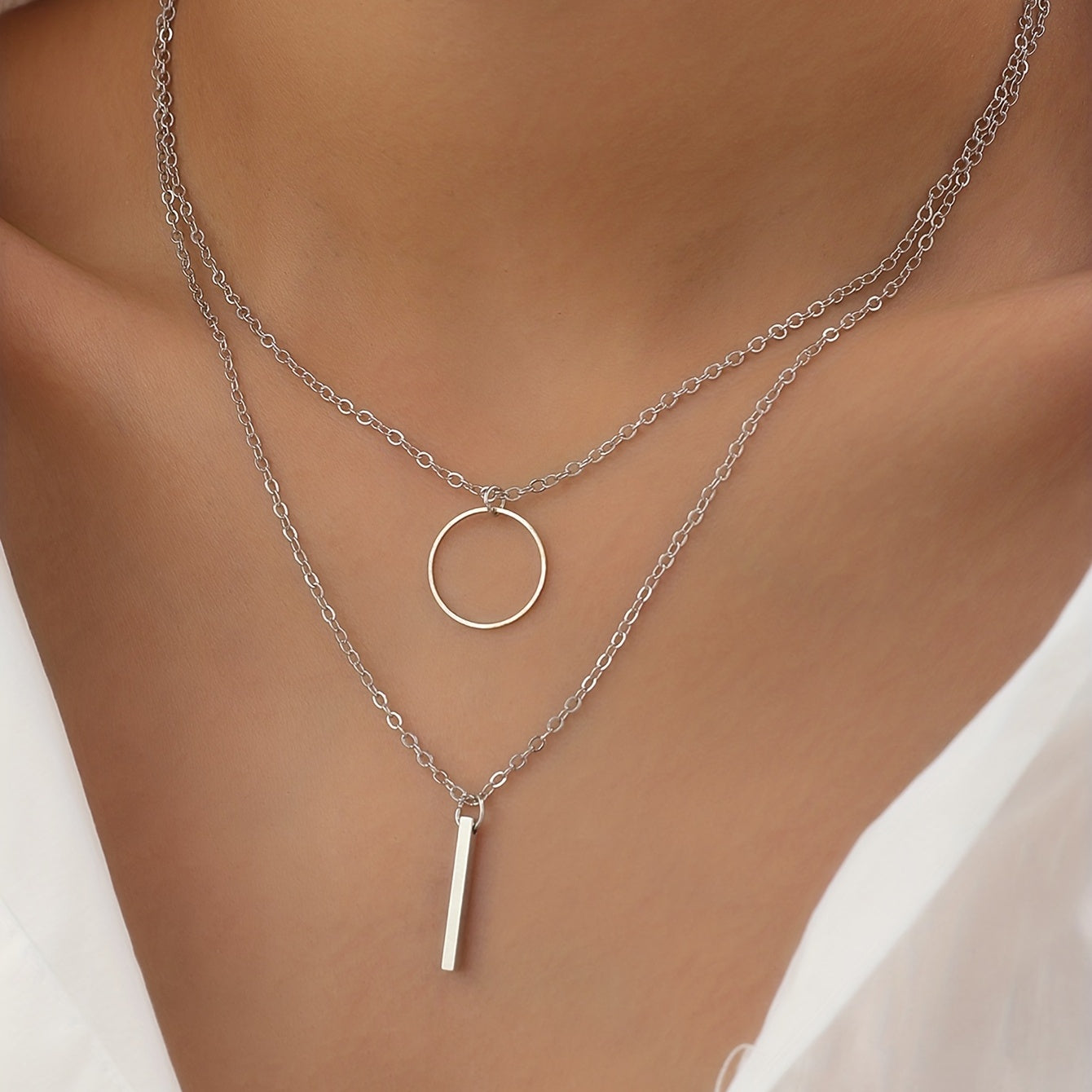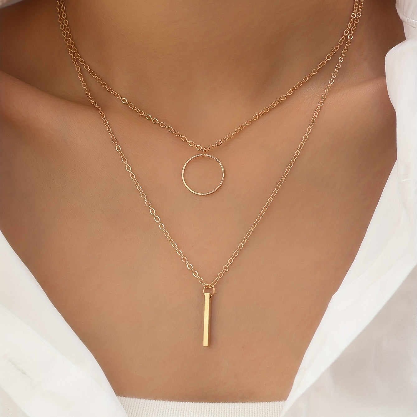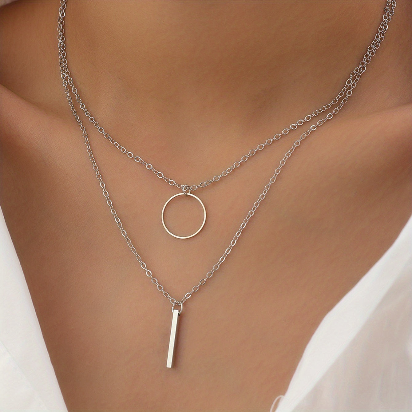 This set includes two elegant necklaces featuring circle ring and long rod pendants. Perfect gift for women and girls.