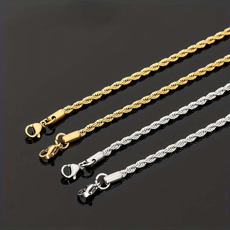 This chain necklace is a classic accessory suitable for both men and women. It features a twist design in silver and golden tones.