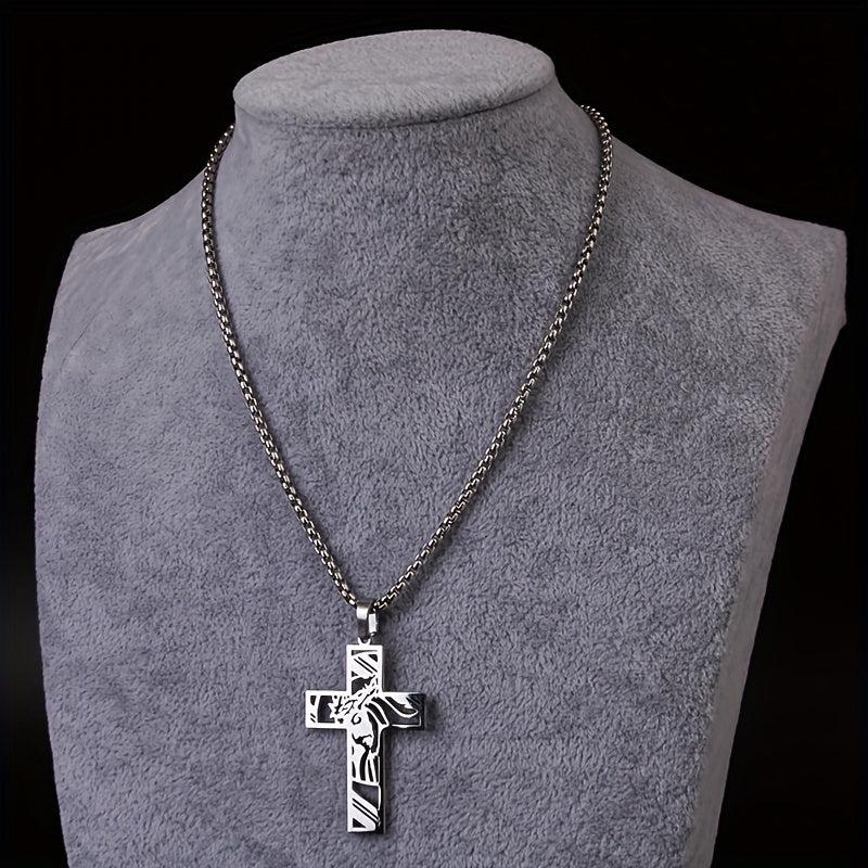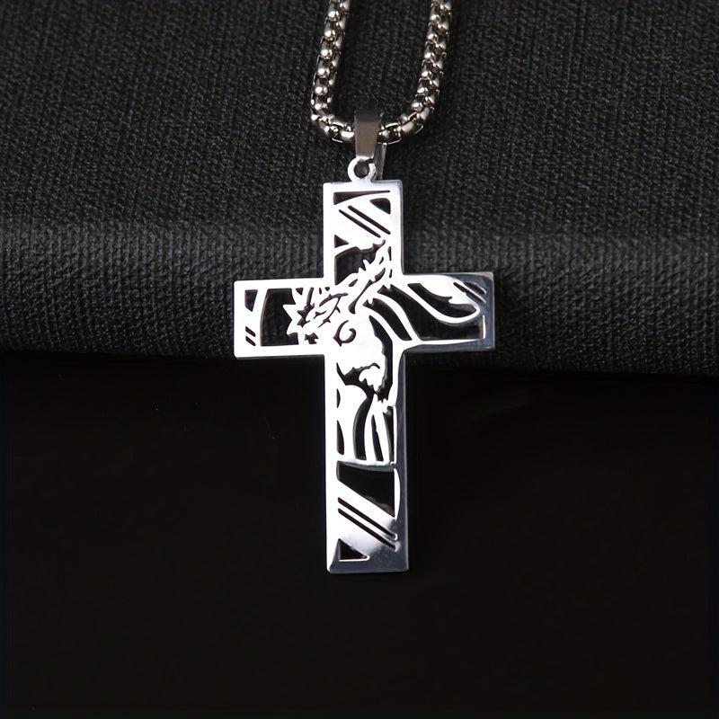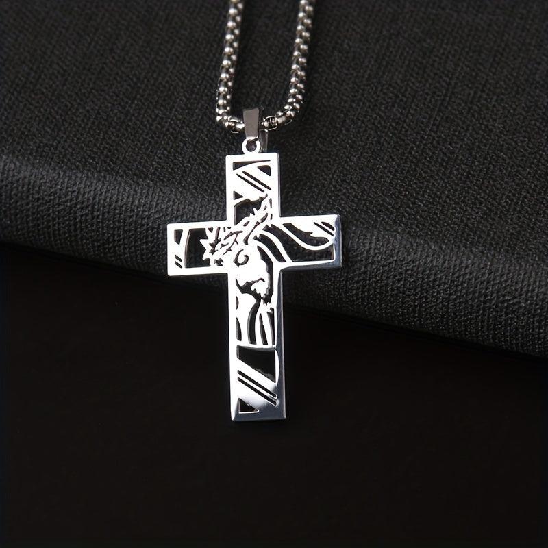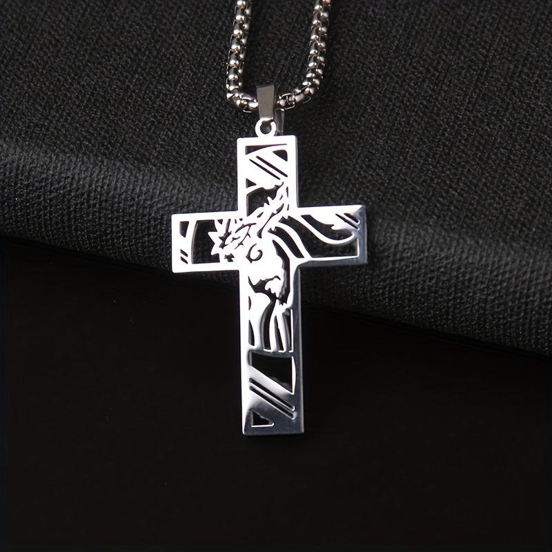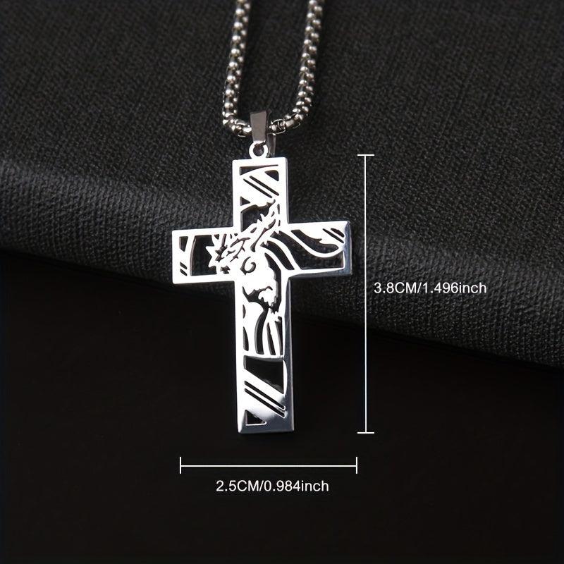 This stainless steel necklace features a cross pendant with a crown of thorns design, perfect for men and women.