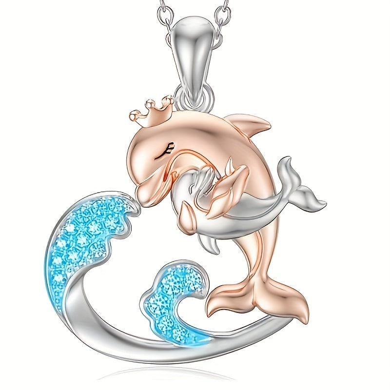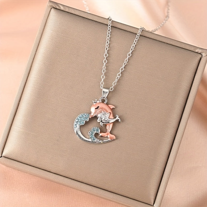 Express your love with this dainty heart necklace featuring a dolphin mother and daughter design. The perfect gift for moms and daughters alike.