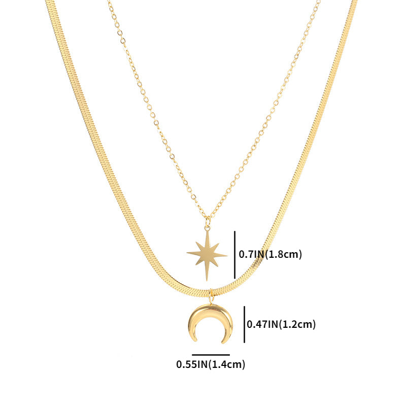 Elegant and feminine double pendant necklace with a plated stainless steel design featuring a double hexagram and moon motif.