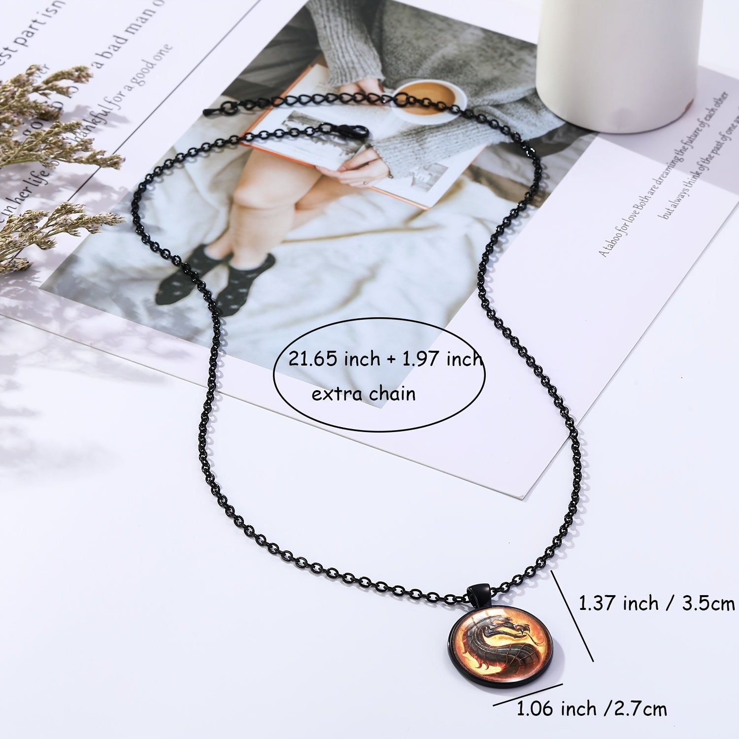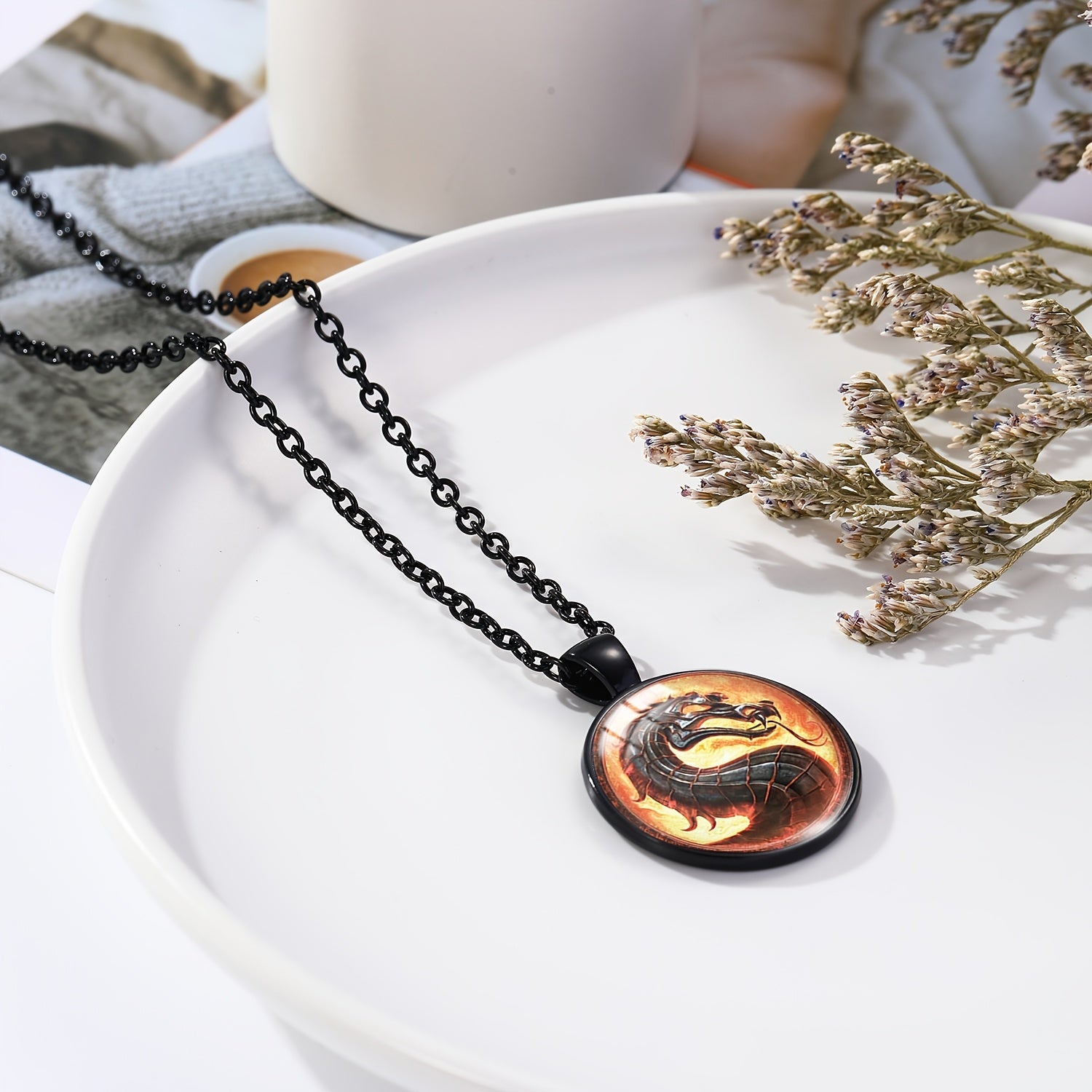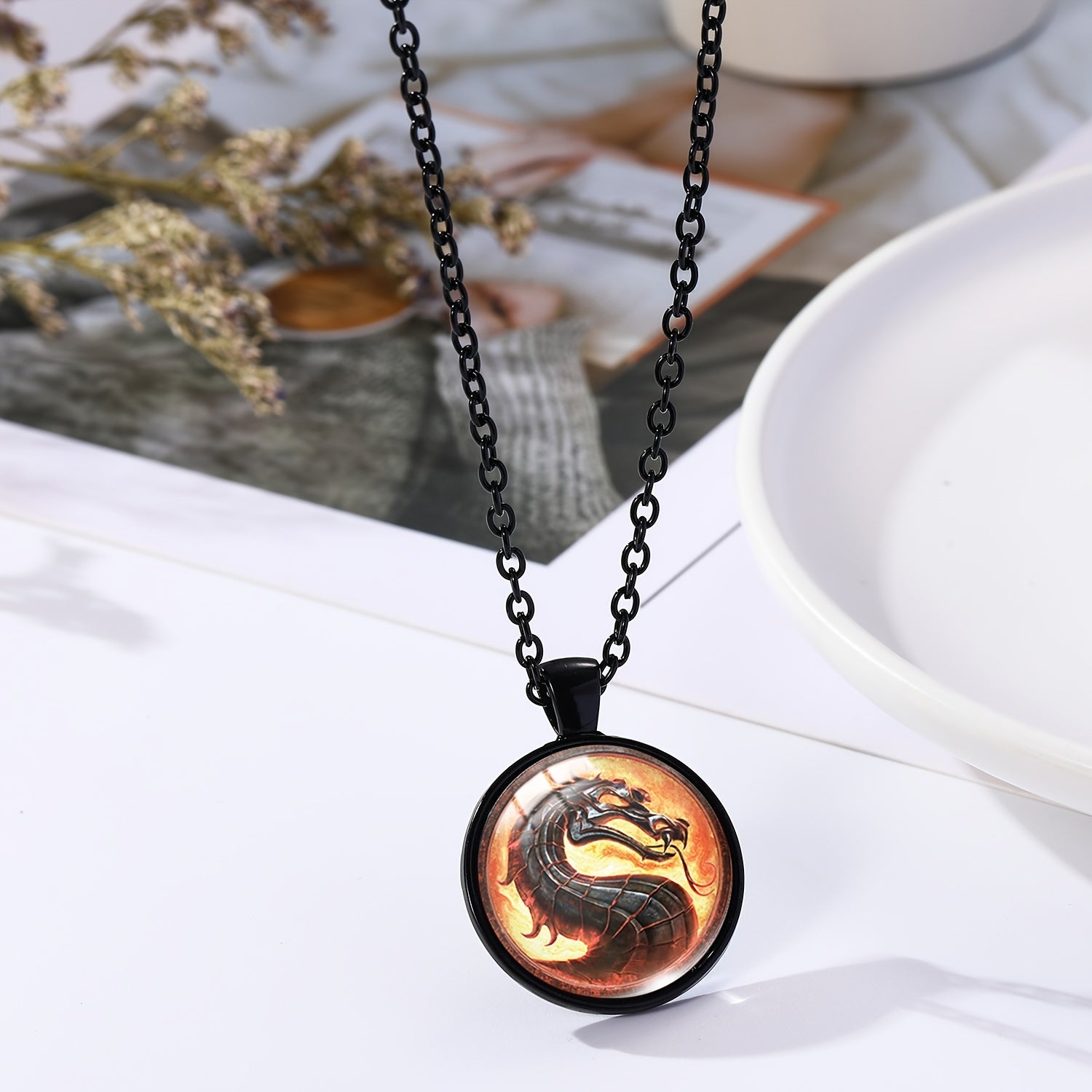 This unique necklace features a dragon graphic design and a beautiful artificial gemstone pendant. Perfect for adding a touch of mystique to your outfit.