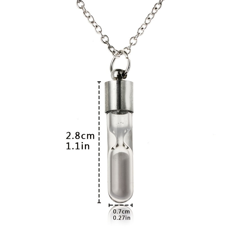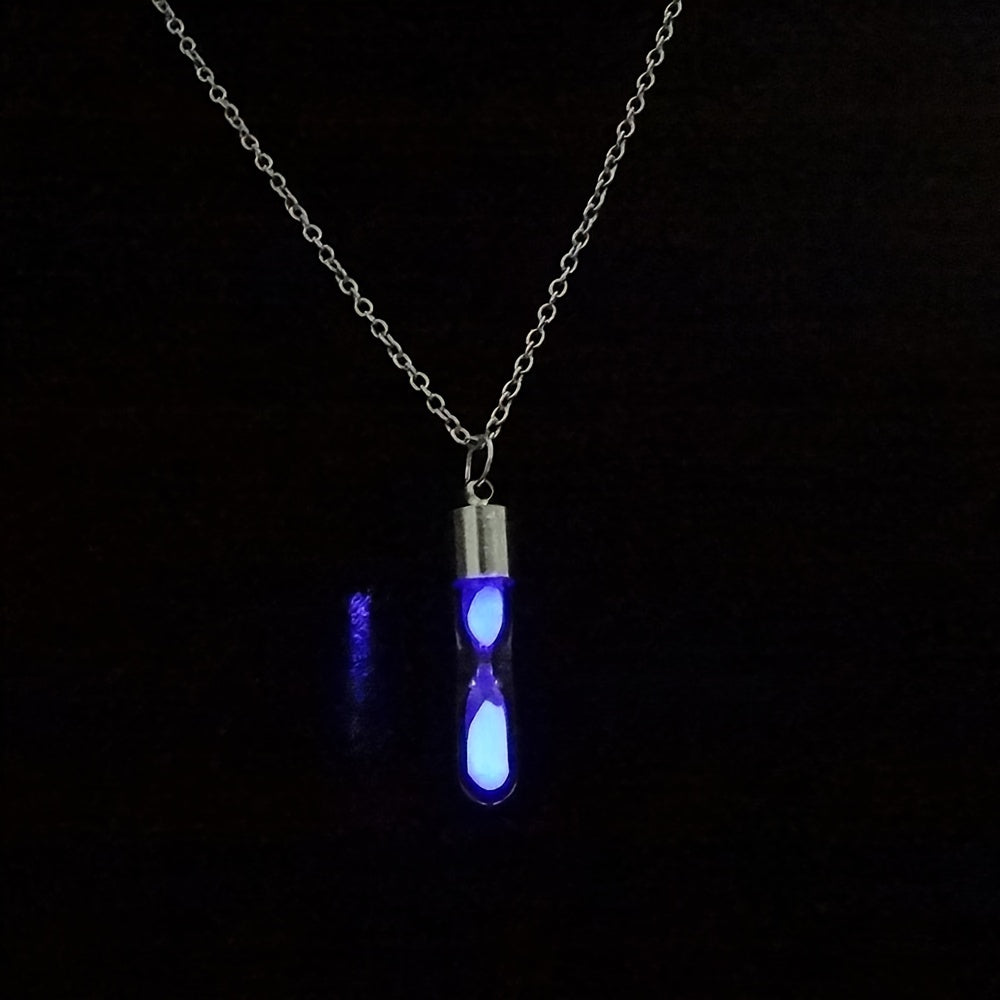 Add a touch of spooky elegance to your outfit with this glowing pendant necklace featuring a time hourglass design. Perfect for Halloween.
