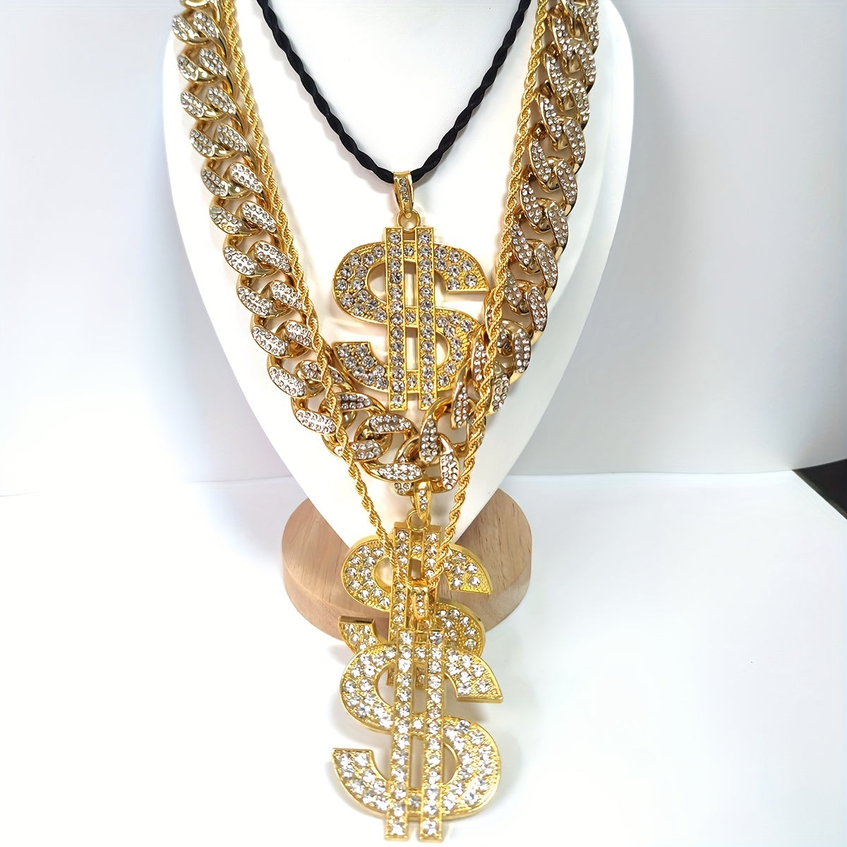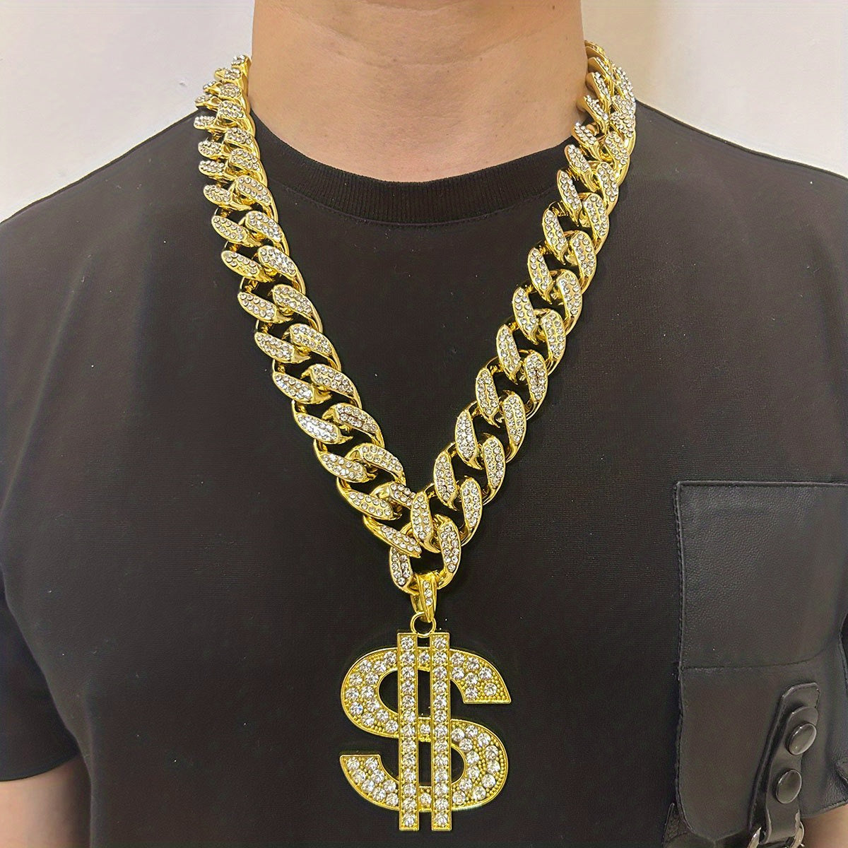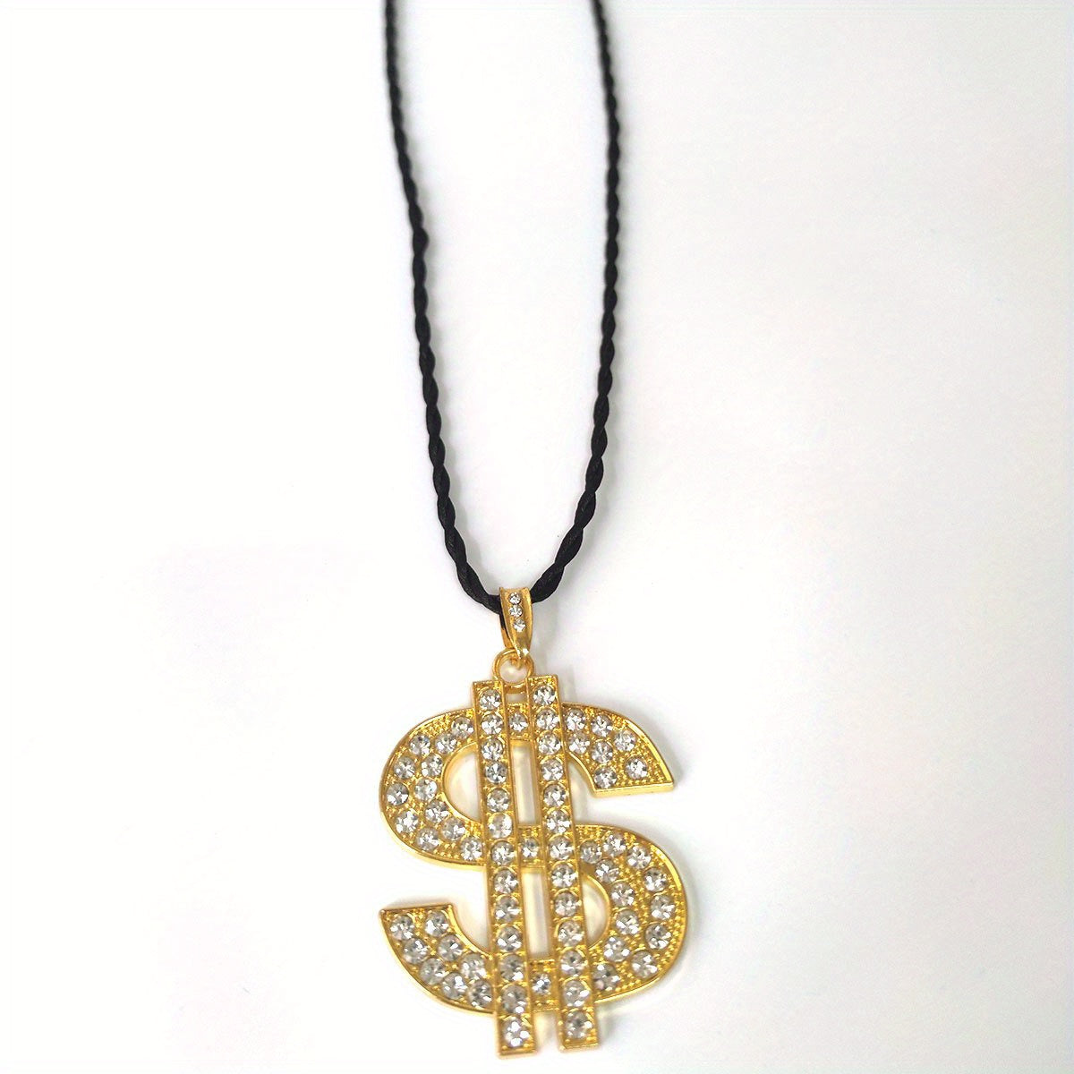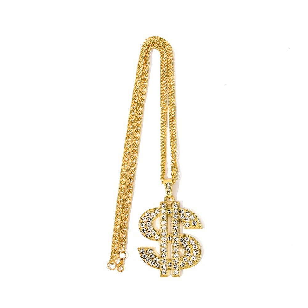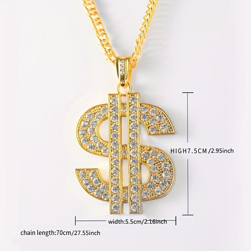 Make a statement with this stunning golden necklace featuring a dollar symbol pendant. Perfect for stage performances and adding a touch of glamour to any outfit.