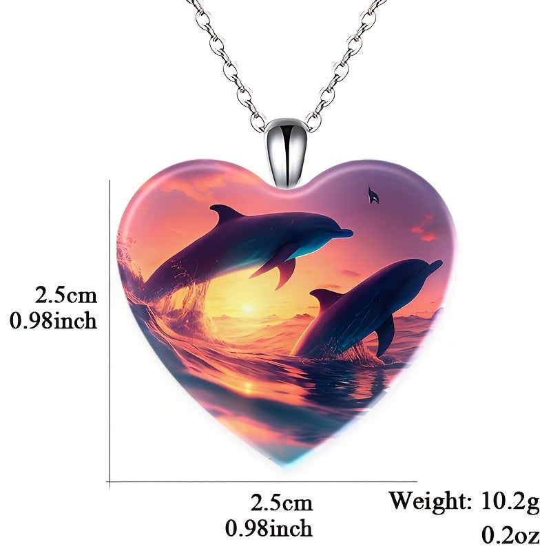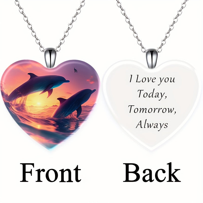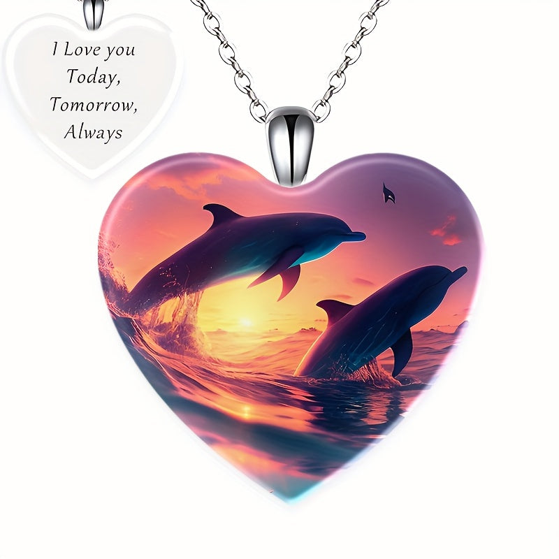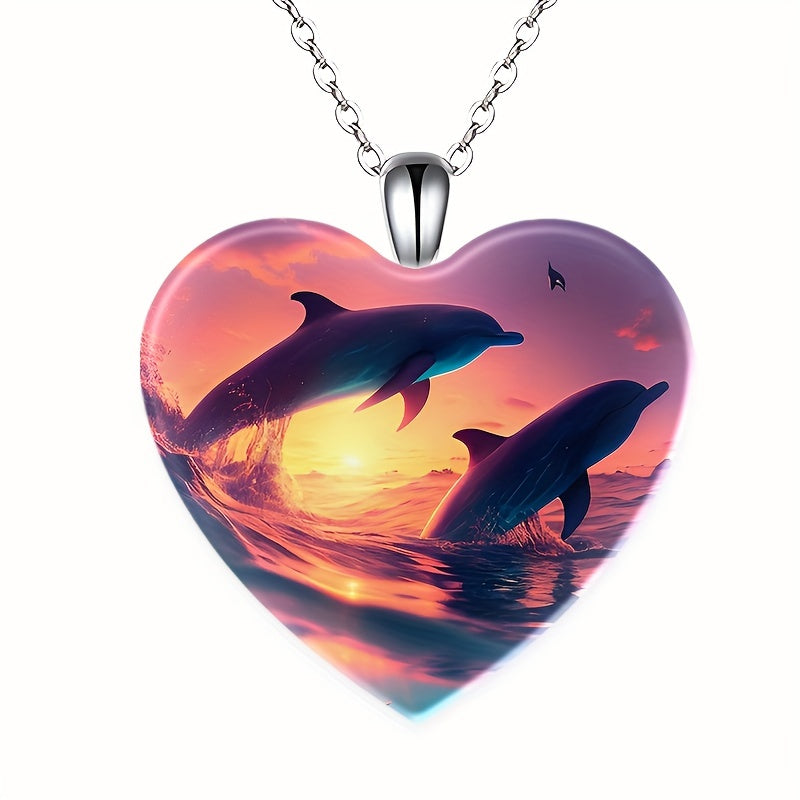 Elegant heart-shaped pendant necklace featuring a dolphin pattern, perfect gift for women and girls.