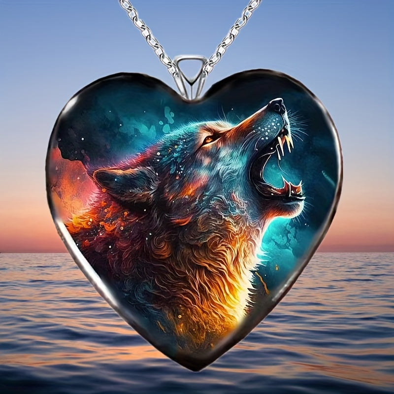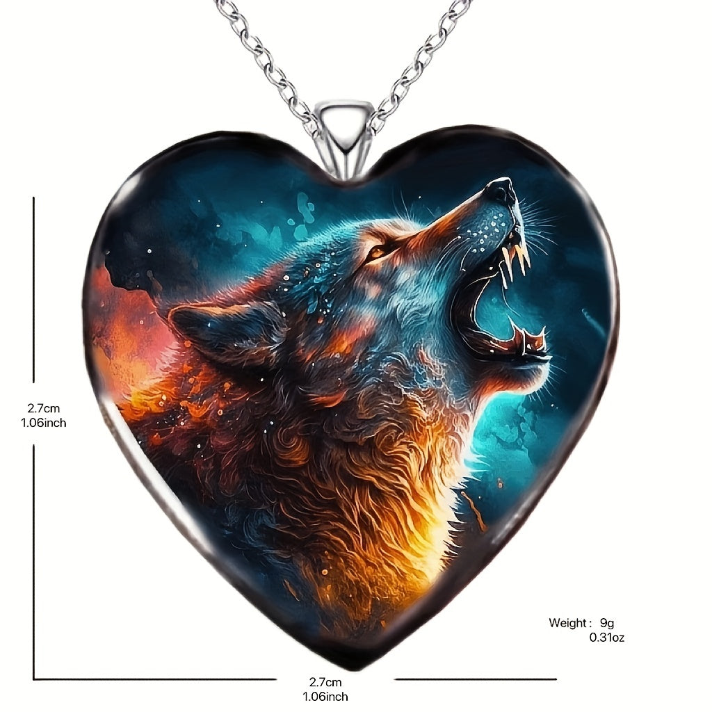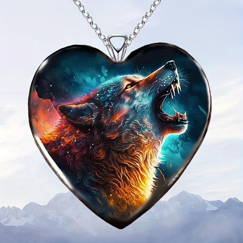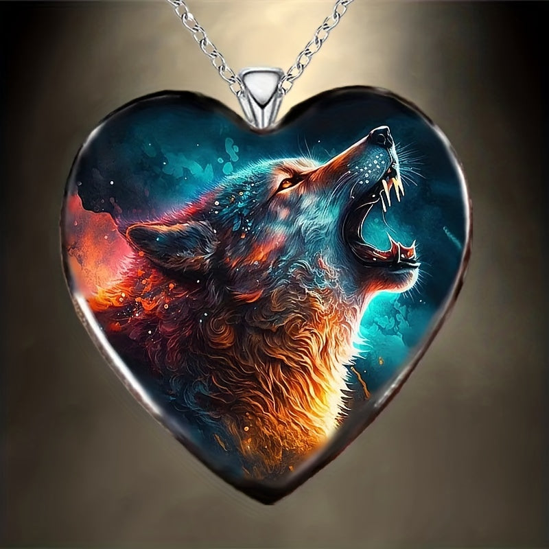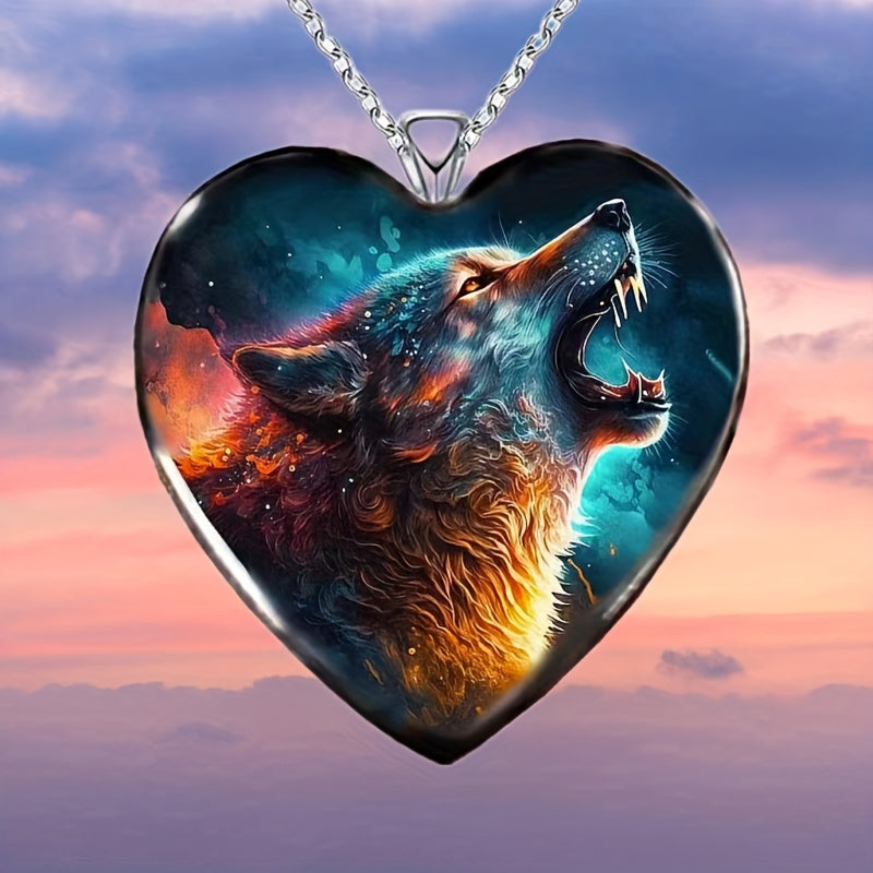 Unique and creative zinc alloy pendant necklace featuring a howling wolf in a heart shape design. Perfect for men or women as a gift for Thanksgiving, Christmas, birthdays, or special occasions.