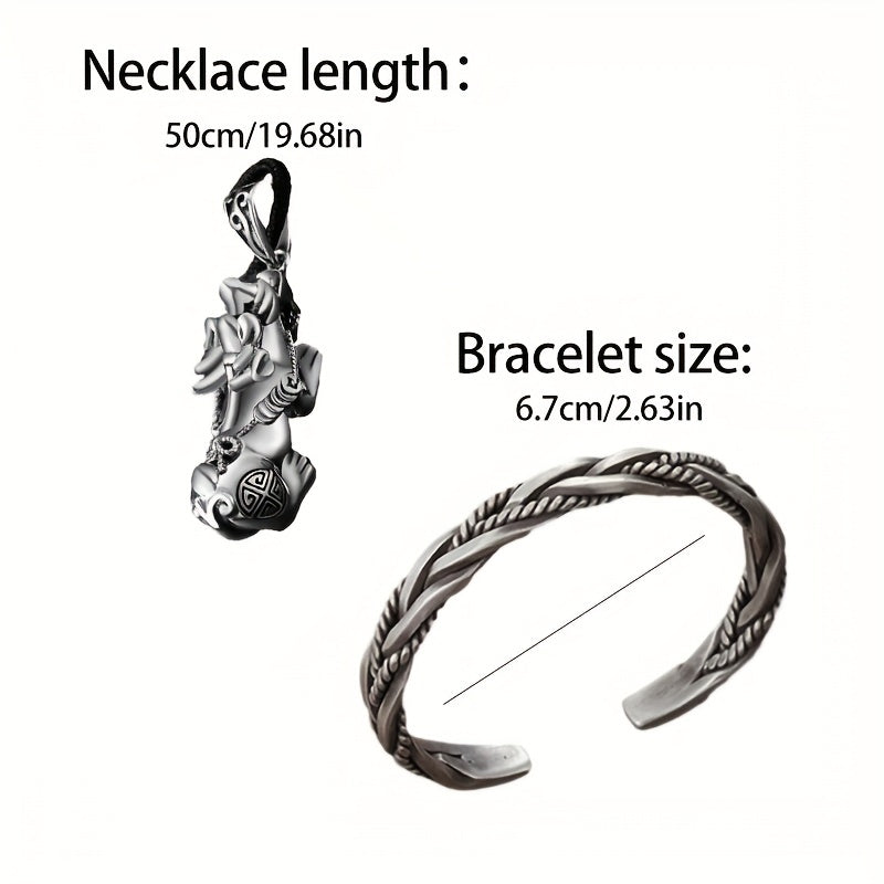 This stylish set includes a Pixiu pendant necklace and bracelet that make a great fashion statement. Perfect as a gift for men, couples, or women.