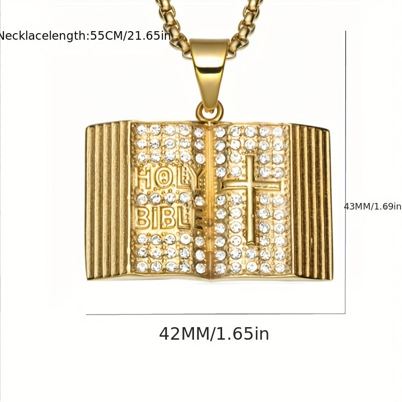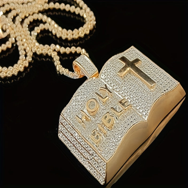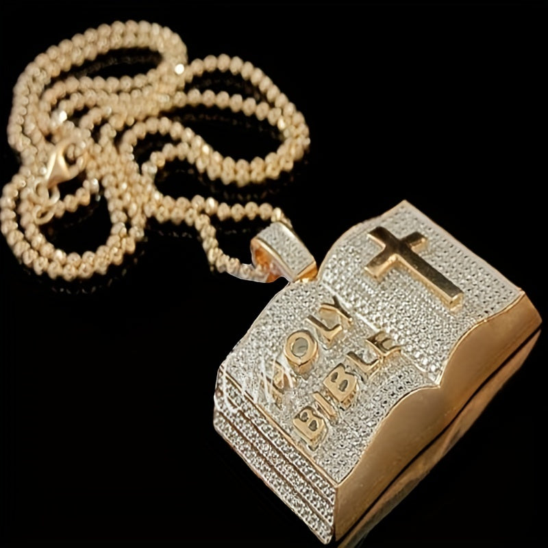 This pendant necklace features a cross bible design with zircon inlay, perfect for a punk and hip hop style. Ideal unisex jewelry piece.
