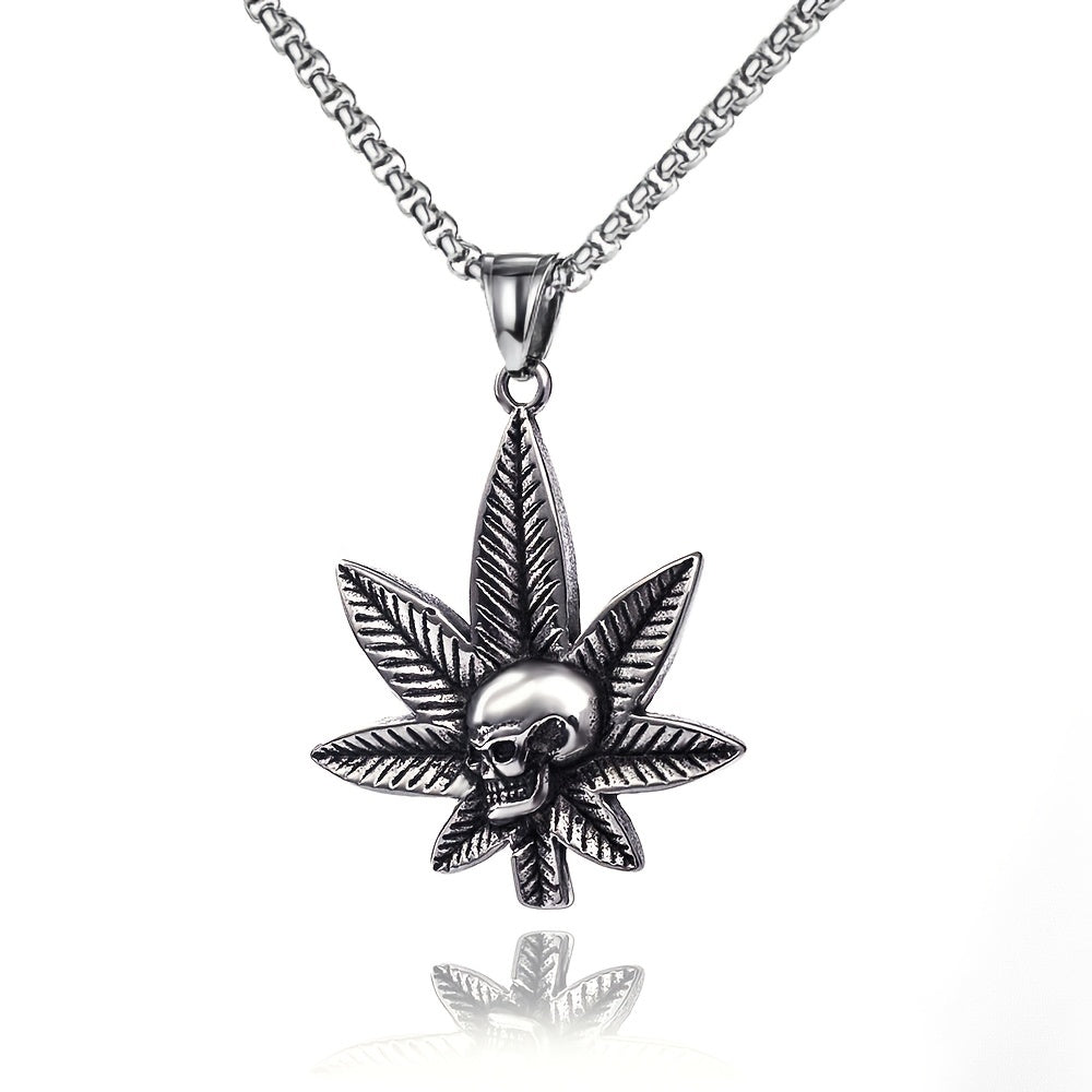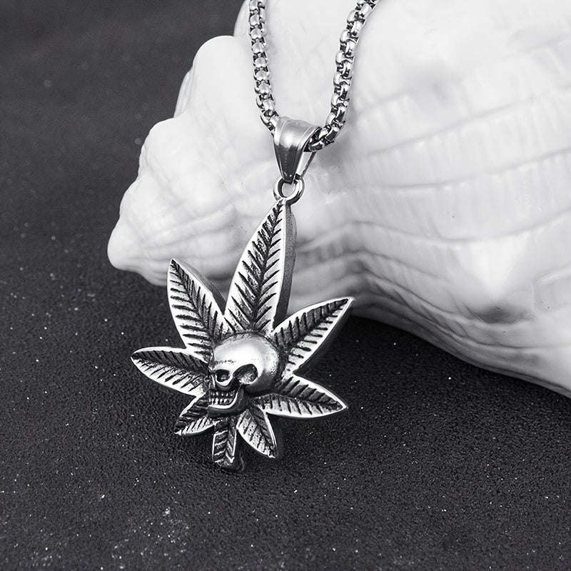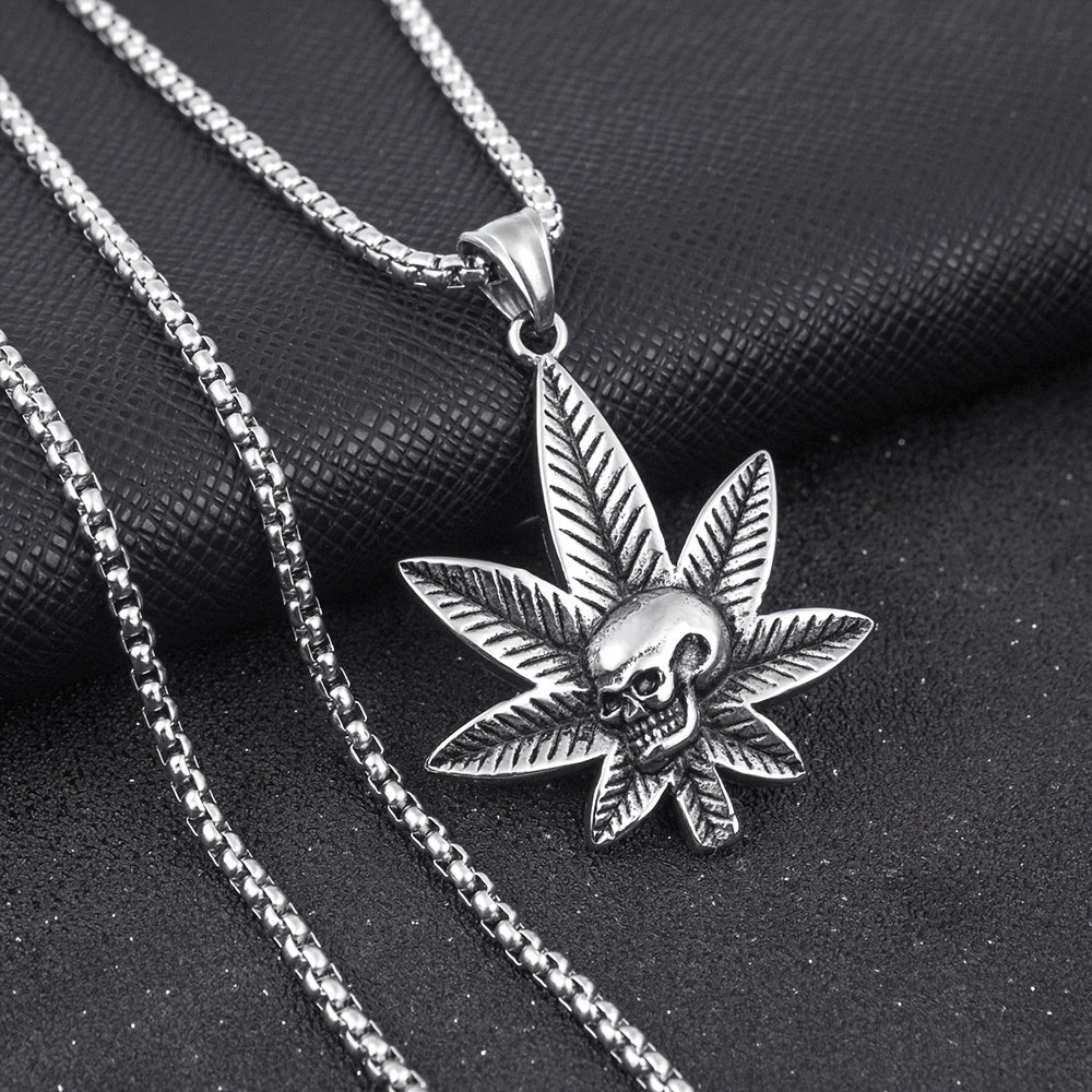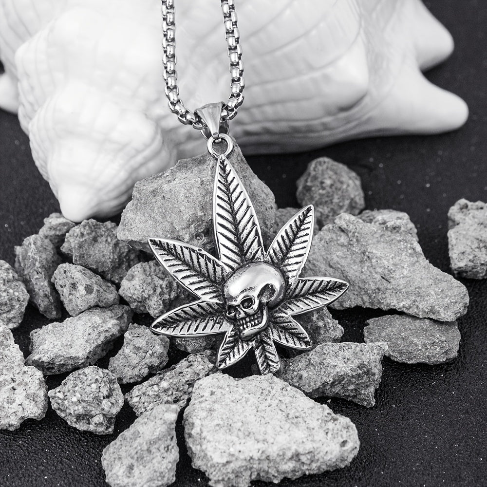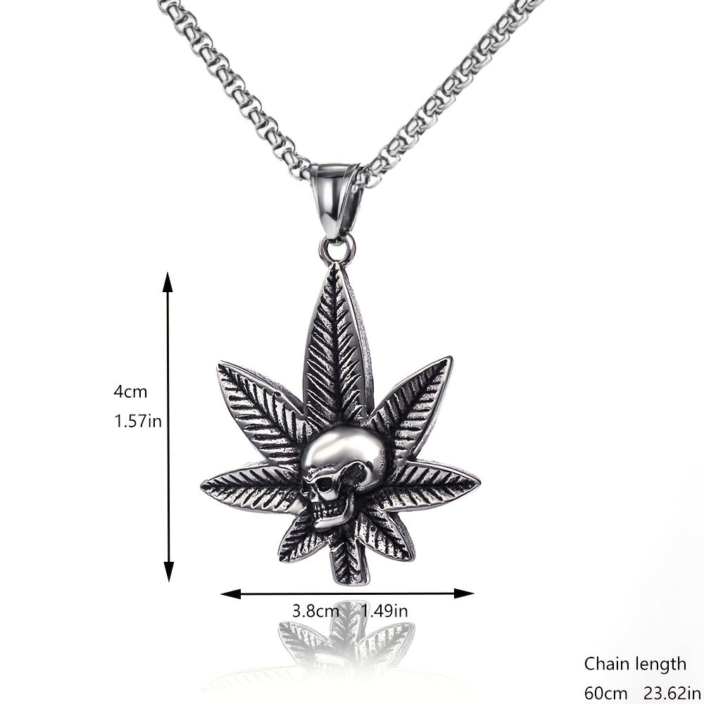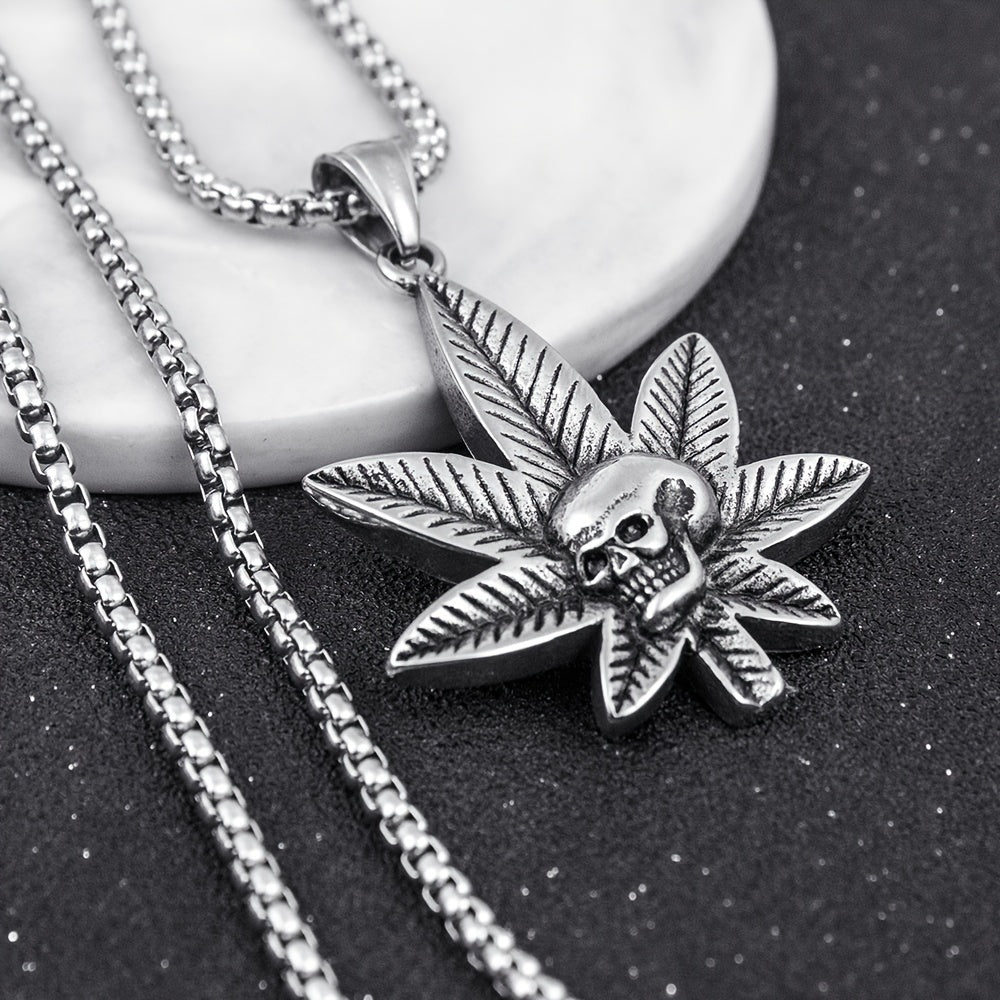 This stylish pendant necklace features a funky leaf skull design made of stainless steel.
