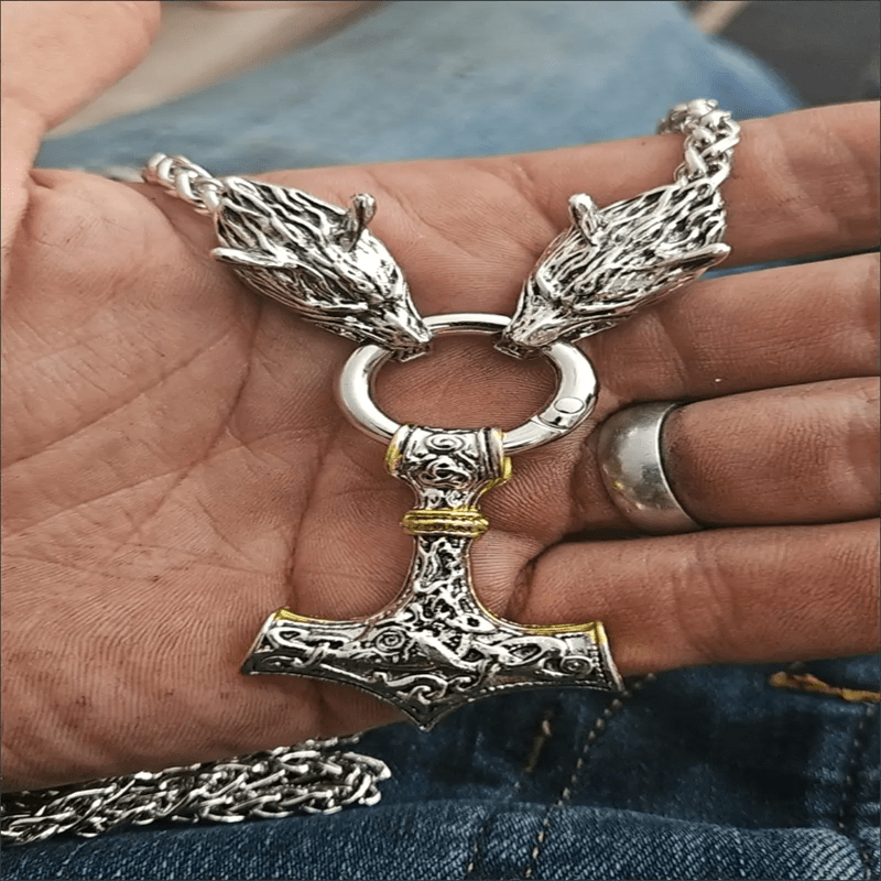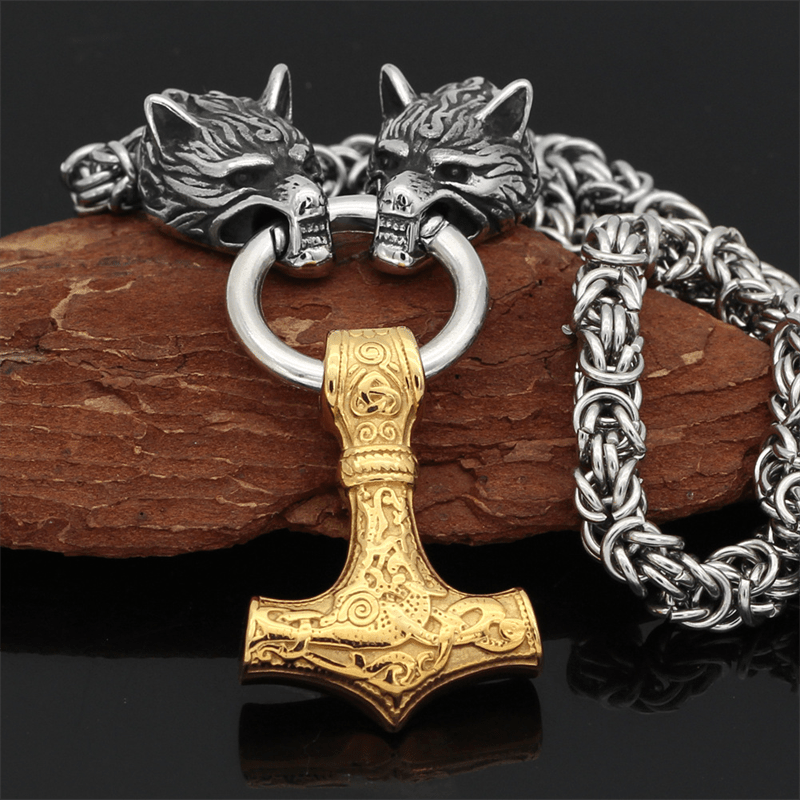 Men's Viking Wolf Steel Chain Hammer Pendant Necklace