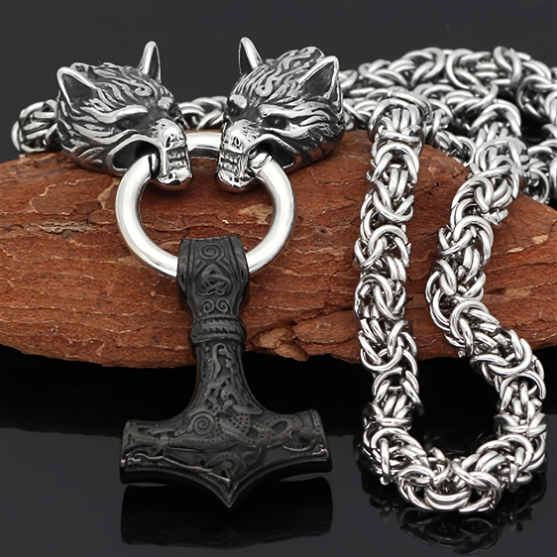 Embrace the Viking spirit with this vintage Nordic wolf head pendant necklace. Crafted with durable steel chain and a striking hammer design.