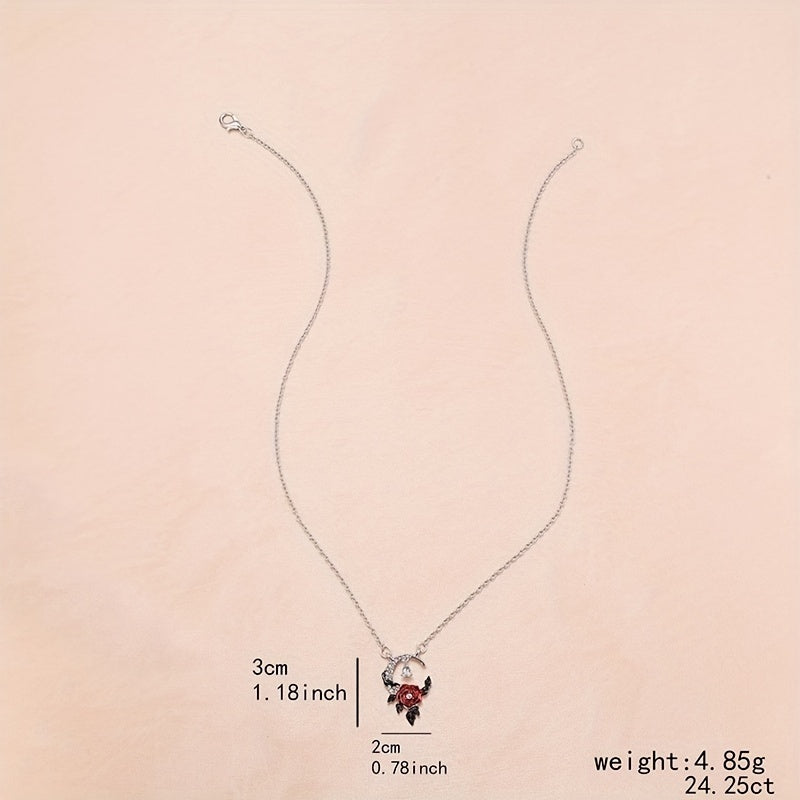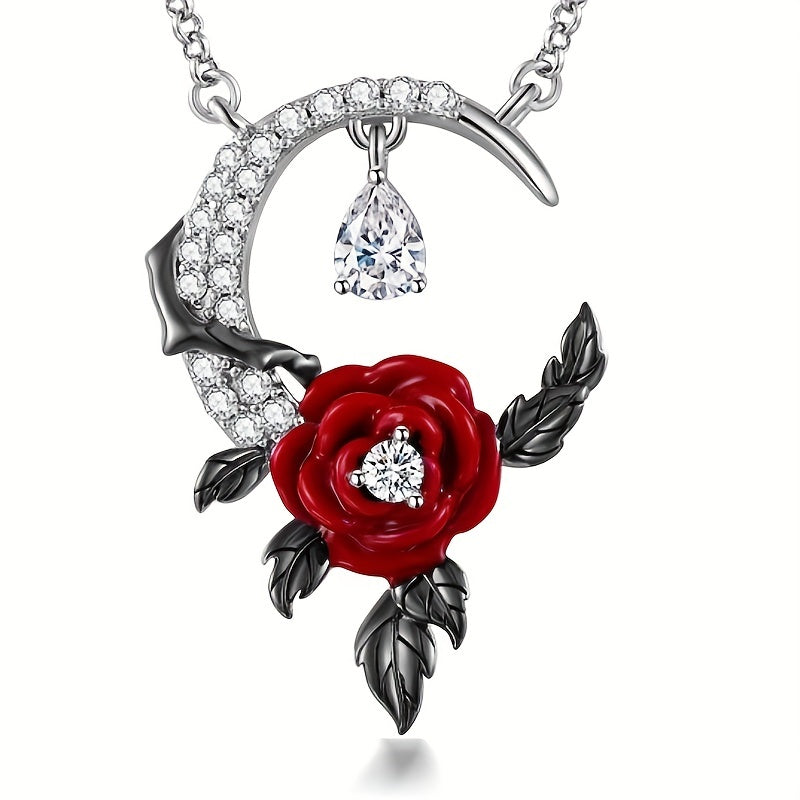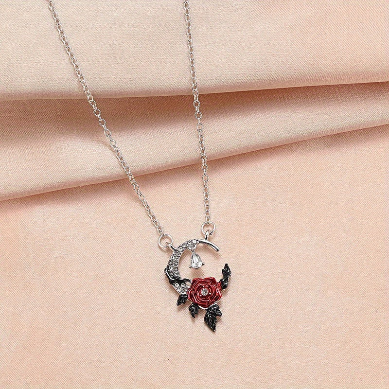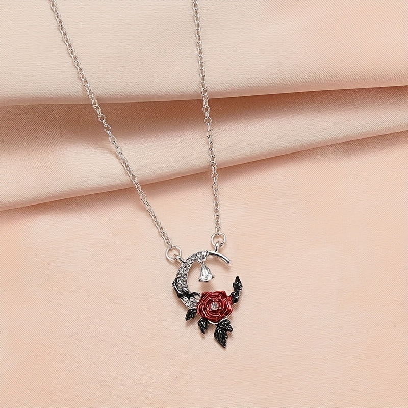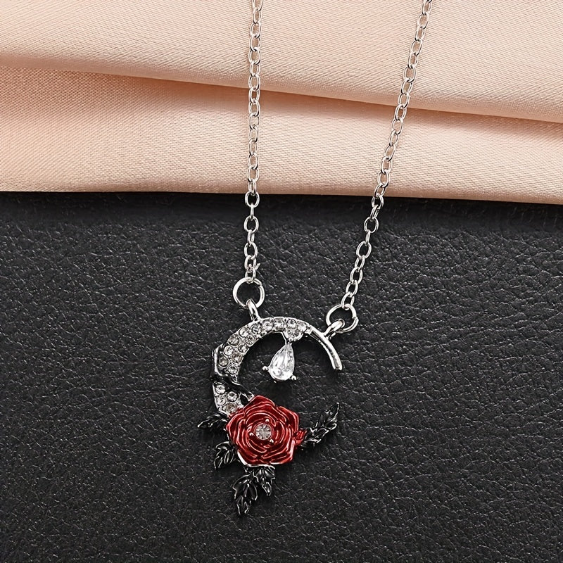 Add a touch of style with this unique crescent pendant featuring a red flower design and small rhinestones. Perfect for men who appreciate intricate details in their accessories.