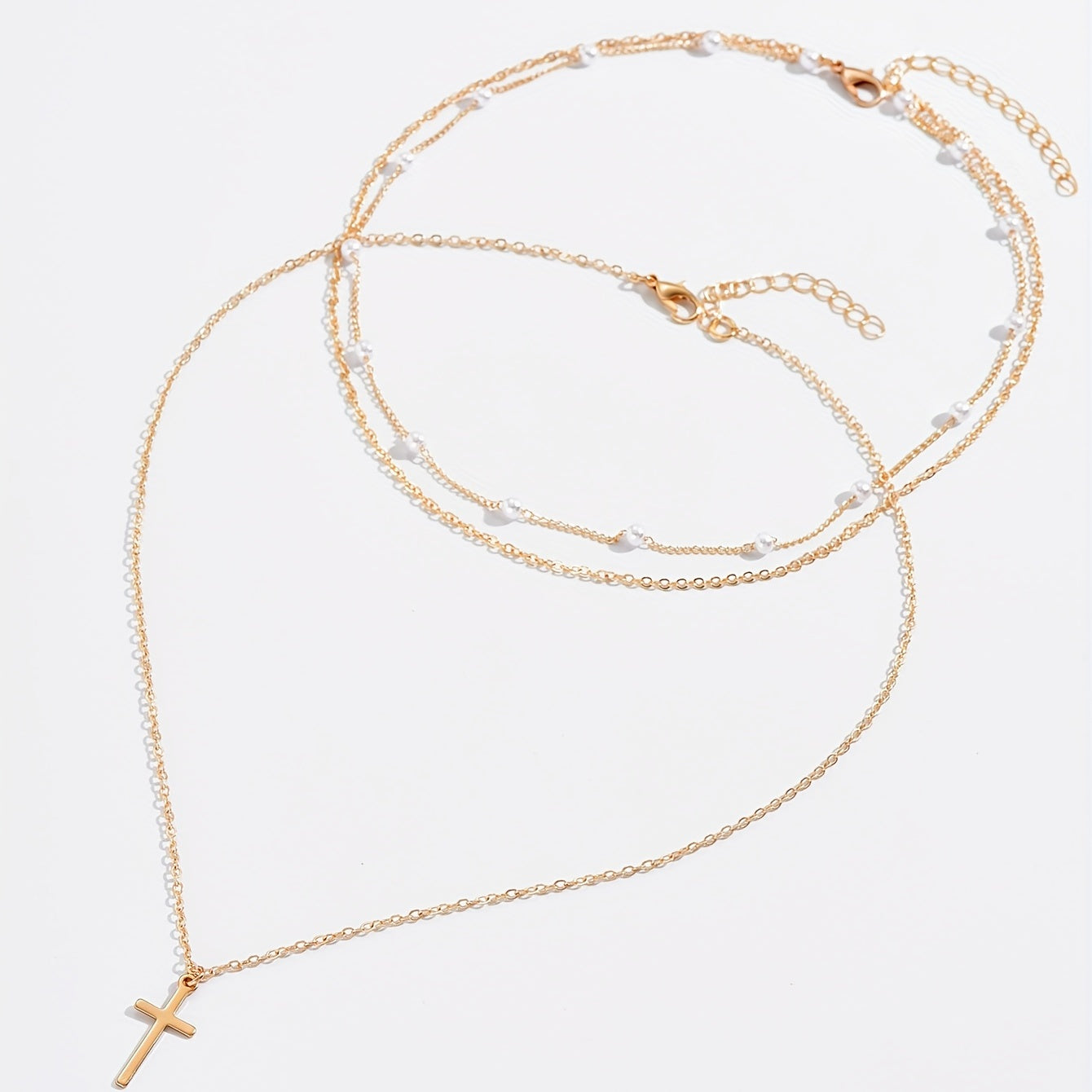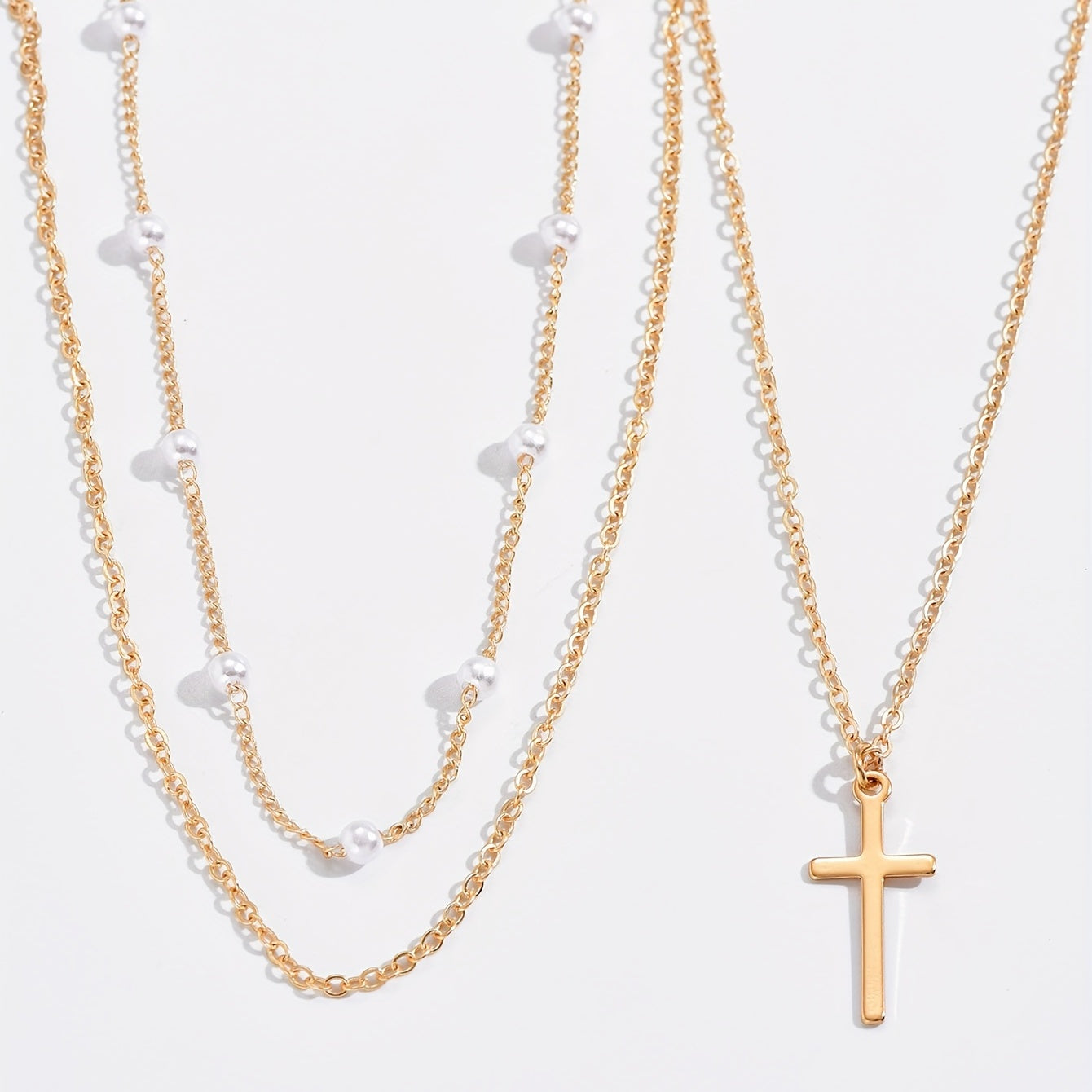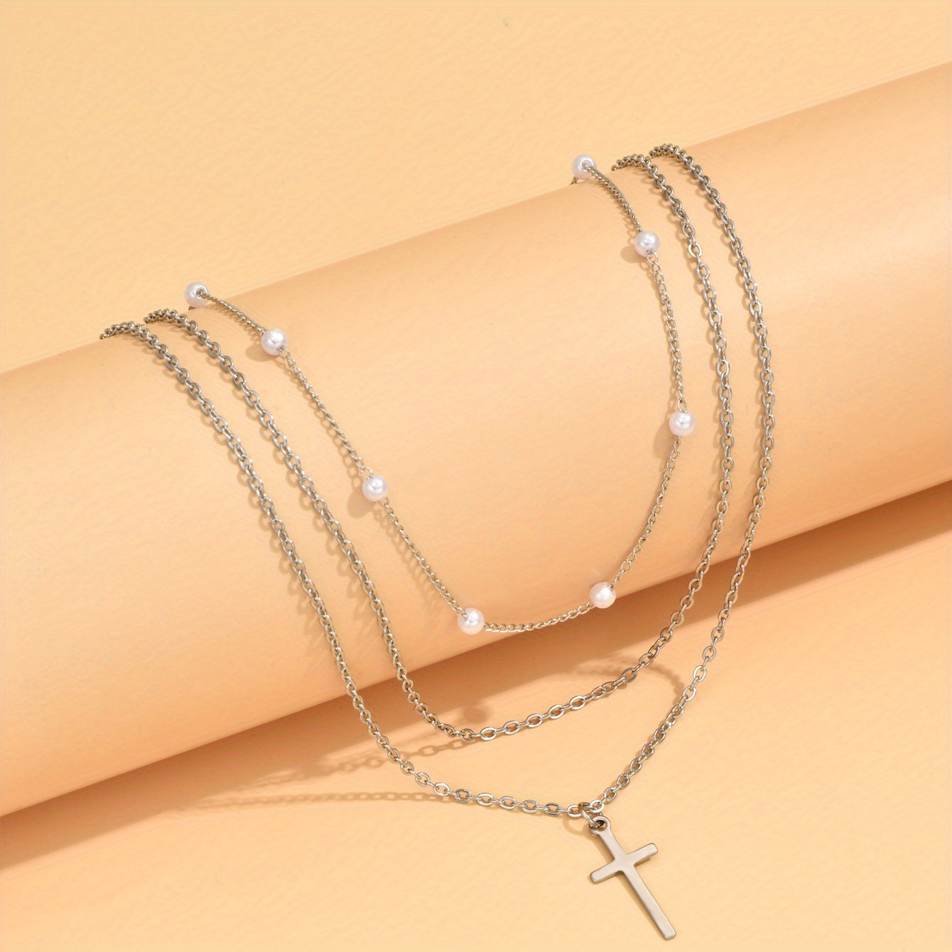 This necklace features a retro design with a pearl cross pendant on a layered clavicle chain. It is a stylish and elegant accessory perfect for any occasion.