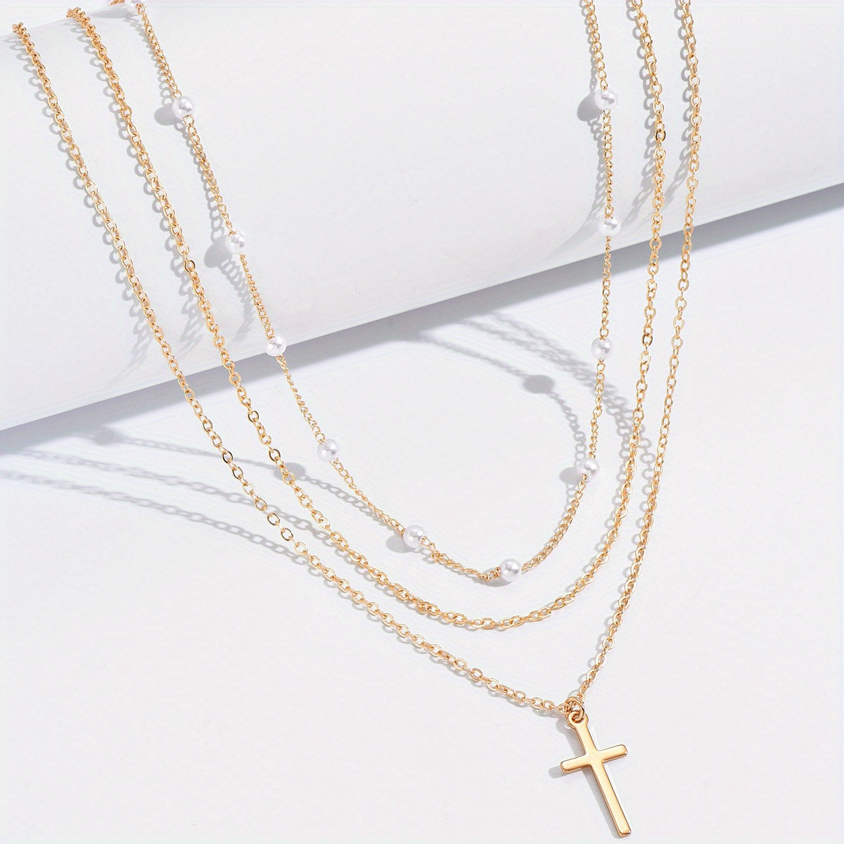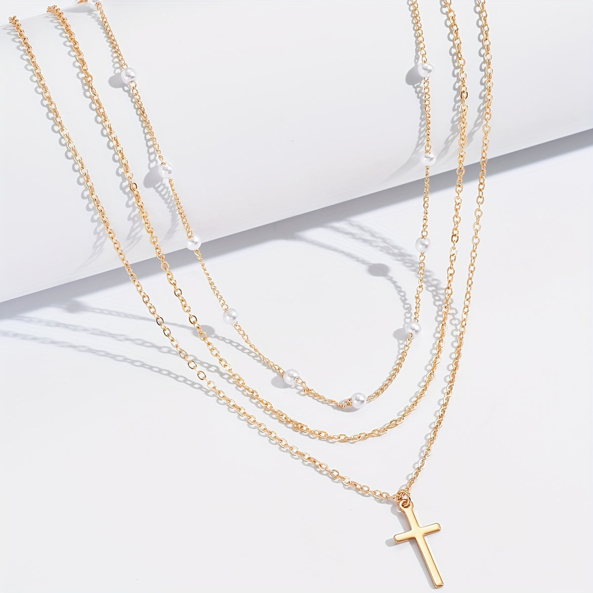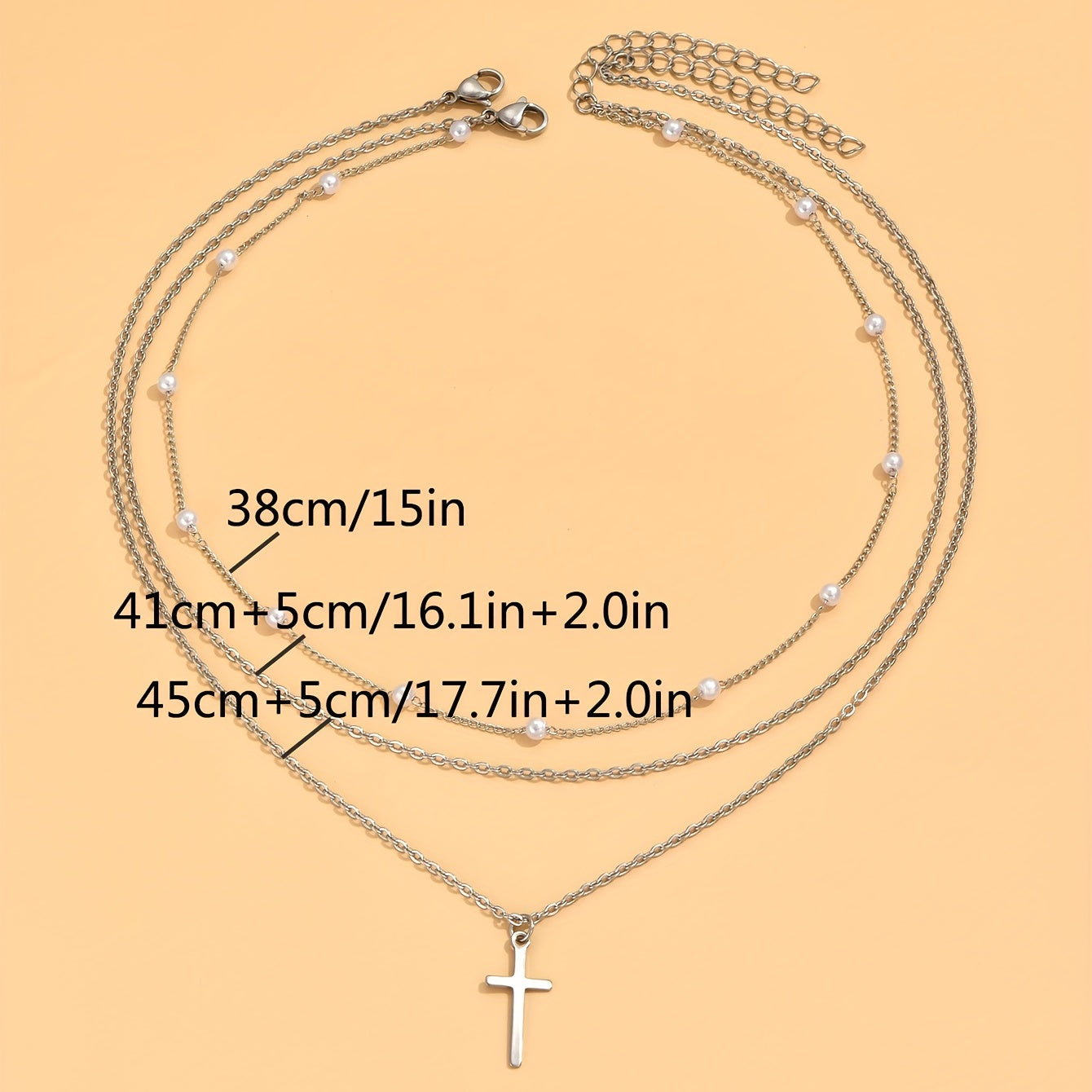 This necklace features a retro design with a pearl cross pendant on a layered clavicle chain. It is a stylish and elegant accessory perfect for any occasion.