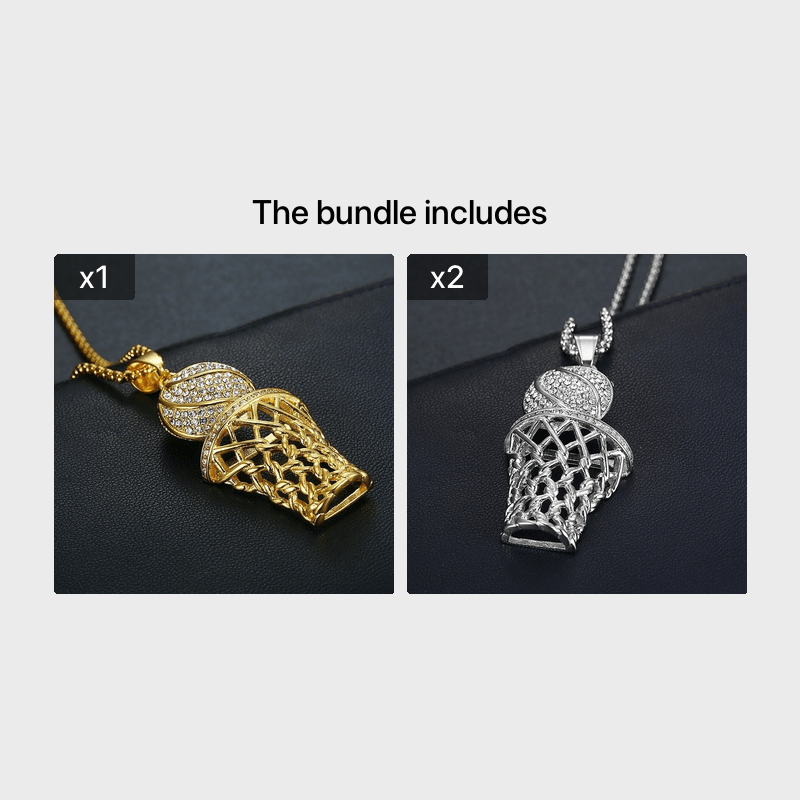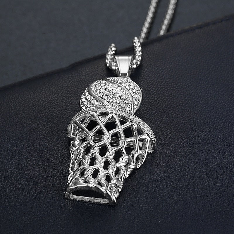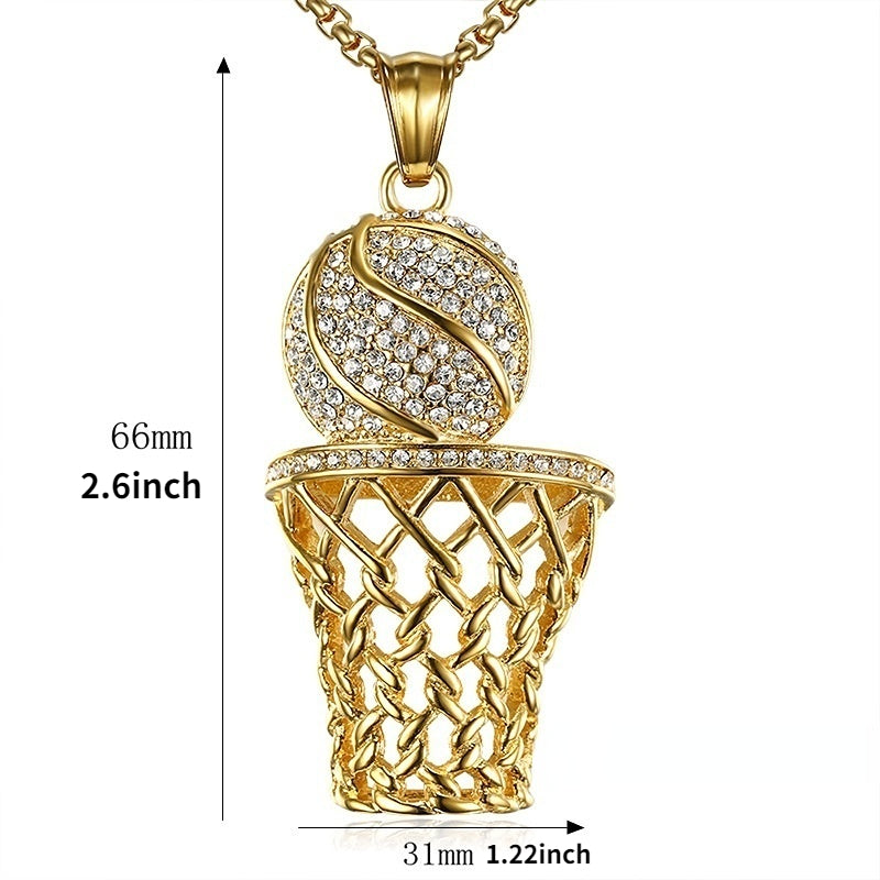 Elevate your style with this sports basketball mesh frame necklace featuring a golden or silver inlaid artificial diamond pendant.