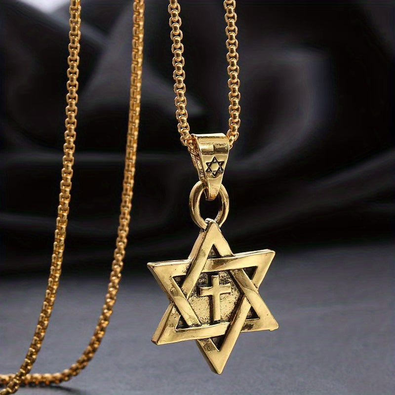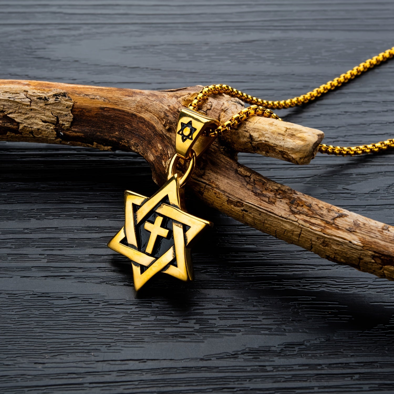 This men's necklace features a stainless steel pendant with both the Christian cross and Star of David symbols, making it a meaningful religious piece of jewelry.
